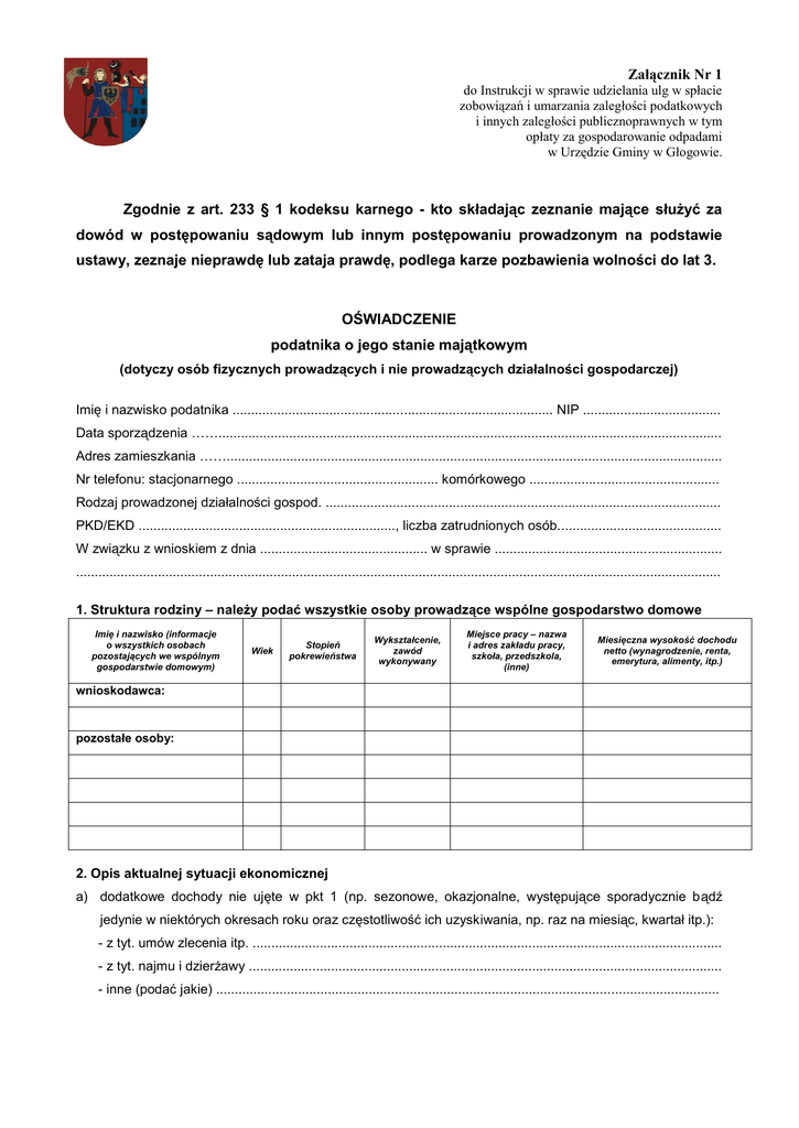Załącznik Nr 1 do Instrukcji w sprawie udzielania ulg w spłacie zobowiązań i umarzania zaległości podatkowych i innych zaległości publicznoprawnych w tym opłaty za gospodarowanie odpadami w Urzędzie Gminy w Głogowie. Zgodnie z art. 233 § 1 kodeksu karnego - kto składając zeznanie mające służyć za dowód w postępowaniu sądowym lub innym postępowaniu prowadzonym na podstawie ustawy, zeznaje nieprawdę lub zataja prawdę, podlega karze pozbawienia wolności do lat 3. OŚWIADCZENIE podatnika o jego stanie majątkowym (dotyczy osób fizycznych prowadzących i nie prowadzących działalności gospodarczej) Imię i nazwisko podatnika ...................................................................................... NIP ..................................... Data sporządzenia ……....................................................................................................................................... Adres zamieszkania ……..................................................................................................................................... Nr telefonu: stacjonarnego ...................................................... komórkowego ................................................... Rodzaj prowadzonej działalności gospod. .......................................................................................................... PKD/EKD ....................................................................., liczba zatrudnionych osób............................................ W związku z wnioskiem z dnia ............................................. w sprawie ............................................................. ............................................................................................................................................................................. 1. Struktura rodziny – należy podać wszystkie osoby prowadzące wspólne gospodarstwo domowe Imię i nazwisko (informacje o wszystkich osobach pozostających we wspólnym gospodarstwie domowym) Wiek Stopień pokrewieństwa Wykształcenie, zawód wykonywany Miejsce pracy – nazwa i adres zakładu pracy, szkoła, przedszkola, (inne) Miesięczna wysokość dochodu netto (wynagrodzenie, renta, emerytura, alimenty, itp.) wnioskodawca: pozostałe osoby: 2. Opis aktualnej sytuacji ekonomicznej a) dodatkowe dochody nie ujęte w pkt 1 (np. sezonowe, okazjonalne, występujące sporadycznie bądź jedynie w niektórych okresach roku oraz częstotliwość ich uzyskiwania, np. raz na miesiąc, kwartał itp.): - z tyt. umów zlecenia itp. .............................................................................................................................. - z tyt. najmu i dzierżawy ............................................................................................................................... - inne (podać jakie) ....................................................................................................................................... b) systemy wsparcia finansowego i materialnego (osoba, grupa, instytucja – np. opieka społeczna, kwota otrzymanego wsparcia) ................................................................................................................................ …................................................................................................................................................................... c) posiadane papiery wartościowe (akcje, obligacje), lokaty bankowe, środki zgromadzone na rachunkach bankowych (własnych i współmałżonka) – rodzaj, wartość .......................................................................... ……............................................................................................................................................................... 3. Struktura wydatków* – dotyczy wydatków nie stanowiących kosztów w prowadzonej działalności gospodarczej. (w przeliczeniu na miesiąc; w przypadku wydatków ponoszonych jedynie przez część roku – podać okres) a) czynsz / podatek od nieruchomości ................................................................................................................ b) gaz .................................................................. prąd ....................................................................................... c) woda ............................................................. kanalizacja ............................................................................... d) koszty związane z ogrzewaniem mieszkania ................................................................................................. e) opłaty za telefon stacjonarny ................................, dodatkowa opłata za korzystanie z internetu ................. opłaty za telefon komórkowy .......................................................................................................................... f) alimenty ........................................................................................................................................................... g) wydatki na naukę w szkołach niepublicznych ................................................................................................. h) wydatki na ochronę zdrowia ........................................................................................................................... i) wydatki związane z nauką dzieci, dojazdy do pracy, szkoły) .......................................................................... j) inne wydatki .................................................................................................................................................... k) spłaty ratalne: 1) podać rodzaj kredytu (np. mieszkaniowy, samochodowy, konsumpcyjny, inwestycyjny itp.) ...............................................................................................