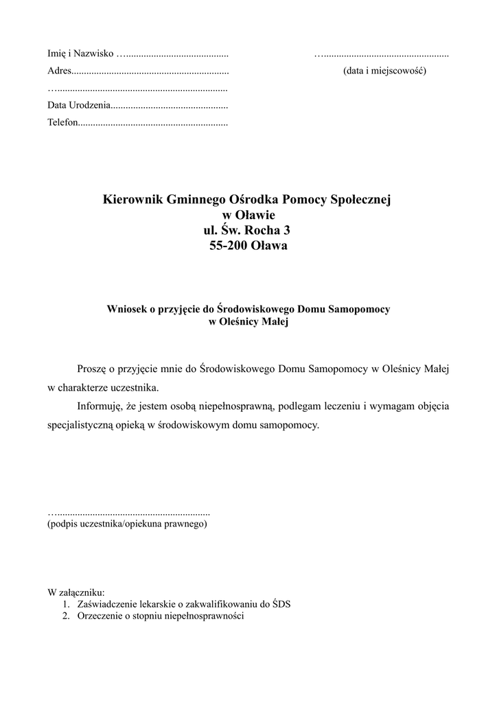 Imię i Nazwisko …......................................... ….................................................. Adres............................................................... (data i miejscowość) ….................................................................... Data Urodzenia............................................... Telefon............................................................ Kierownik Gminnego Ośrodka Pomocy Społecznej w Oławie ul. Św. Rocha 3 55-200 Oława Wniosek o przyjęcie do Środowiskowego Domu Samopomocy w Oleśnicy Małej Proszę o przyjęcie mnie do Środowiskowego Domu Samopomocy w Oleśnicy Małej w charakterze uczestnika. Informuję, że jestem osobą niepełnosprawną, podlegam leczeniu i wymagam objęcia specjalistyczną opieką w środowiskowym domu samopomocy. …............................................................. (podpis uczestnika/opiekuna prawnego) W załączniku: 1. Zaświadczenie lekarskie o zakwalifikowaniu do ŚDS 2. Orzeczenie o stopniu niepełnosprawności
