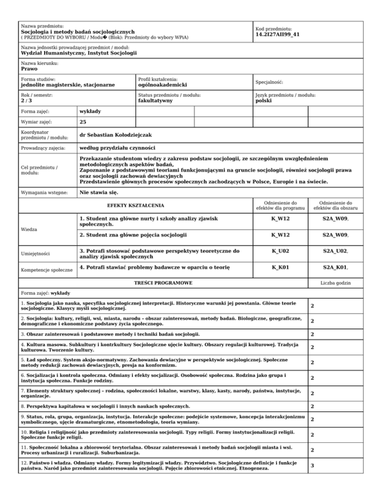 Nazwa przedmiotu: Kod przedmiotu: Socjologia i metody badań socjologicznych ( PRZEDMIOTY DO WYBORU / Modu� (Blok): Przedmioty do wybory WPiA) 14.2I27AII99_41 Nazwa jednostki prowadzącej przedmiot / moduł: Wydział Humanistyczny, Instytut Socjologii Nazwa kierunku: Prawo Forma studiów: Profil kształcenia: jednolite magisterskie, stacjonarne ogólnoakademicki Rok / semestr: 2/3 Status przedmiotu / modułu: Język przedmiotu / modułu: fakultatywny polski Specjalność: Forma zajęć: wykłady Wymiar zajęć: 25 Koordynator przedmiotu / modułu: dr Sebastian Kołodziejczak Prowadzący zajęcia: według przydziału czynności Cel przedmiotu / modułu: Przekazanie studentom wiedzy z zakresu podstaw socjologii, ze szczególnym uwzględnieniem metodologicznych aspektów badań, Zapoznanie z podstawowymi teoriami funkcjonującymi na gruncie socjologii, również socjologii prawa oraz socjologii zachowań dewiacyjnych Przedstawienie głównych procesów społecznych zachodzących w Polsce, Europie i na świecie. Wymagania wstępne: Nie stawia się. Odniesienie do efektów dla programu Odniesienie do efektów dla obszaru 1. Student zna główne nurty i szkoły analizy zjawisk społecznych. K_W12 S2A_W09, 2. Student zna główne pojęcia socjologii K_W12 S2A_W09, 3. Potrafi stosować podstawowe perspektywy teoretyczne do analizy zjawisk społecznych K_U02 S2A_U02, 4. Potrafi stawiać problemy badawcze w oparciu o teorię K_K01 S2A_K01, EFEKTY KSZTAŁCENIA Wiedza Umiejętności Kompetencje społeczne TREŚCI PROGRAMOWE Liczba godzin Forma zajęć: wykłady 1. Socjologia jako nauka, specyfika socjologicznej interpretacji. Historyczne warunki jej powstania. Główne teorie socjologiczne. Klasycy myśli socjologicznej. 2 2. Socjologia: kultury, religii, wsi, miasta, narodu – obszar zainteresowań, metody badań. Biologiczne, geograficzne, demograficzne i ekonomiczne podstawy życia społecznego. 2 3. Obszar zainteresowań i podstawowe metody i techniki badań socjologii. 2 4. Kultura masowa. Subkultury i kontrkultury Socjologiczne ujęcie kultury. Obszary regulacji kulturowej. Tradycja kulturowa. Tworzenie kultury. 2 5. Ład społeczny. System aksjo-normatywny. Zachowania dewiacyjne w perspektywie socjologicznej. Społeczne metody redukcji zachowań dewiacyjnych, presja na konformizm. 2 6. Socjalizacja i kontrola społeczna. Odmiany i efekty socjalizacji. Osobowość społeczna. Rodzina jako grupa i instytucja społeczna. Funkcje rodziny. 2 7. Elementy struktury społecznej – rodzina, społeczności lokalne, warstwy, klasy, kasty, narody, państwa, instytucje, organizacje. 2 8. Perspektywa kapitałowa w socjologii i innych naukach społecznych. 2 9. Status, rola, grupa, organizacja, instytucja. Interakcje społeczne: podejście systemowe, koncepcja interakcjonizmu symbolicznego, ujęcie dramaturgiczne, etnometodologia, teoria wymiany. 2 10. Religia i religijność jako przedmioty zainteresowania socjologii. Typy religii. Formy instytucjonalizacji religii. Społeczne funkcje religii. 2 11. Społeczność lokalna a zbiorowość terytorialna. Obszar zainteresowań i metody badań socjologii miasta i wsi. Procesy urbanizacji i ruralizacji. Suburbanizacja. 2 12. Państwo i władza. Odmiany władzy. Formy legitymizacji władzy. Przywództwo. Socjologiczne definicje i funkcje państwa. Naród jako przedmiot zainteresowania socjologii. Pojęcie zbiorowości etnicznej. Etnogeneza. 3 Metody kształcenia Metody weryfikacji efektów kształcenia Forma i warunki zaliczenia 1. Wykład 2. Prezentacja multimedialna 3. Dyskusja Nr efektu kształcenia z sylabusa * egzamin pisemny 1,2,3,4, Egzamin pisemny, test. 50 – 65% - ocena dostateczna 66 – 75% ocena dostateczna plus 76 – 85% ocena dobra 86 – 95% ocena dobra plus 96 – 100% ocena bardzo dobra Literatura podstawowa Sztompka P. (2002): Socjologia. Wydawnictwo Znak, Kraków Literatura uzupełniająca Giddens A. (2004): Socjologia. PWN, Warszawa Okólski M. (2004): Demografia. Podstawowe pojęcia, procesy i teorie w encyklopedycznym zarysie. Wyd. Naukowe Scholar, Warszawa Bauman (1998): Socjologia. PWN, Warszawa NAKŁAD PRACY STUDENTA: Liczba godzin Zajęcia dydaktyczne 25 Udział w konsultacjach 10 Zdawanie egzaminu lub/i zaliczenia 2 Przygotowanie się do zajęć 3 Studiowanie literatury 50 Przygotowanie się do egzaminu lub/i zaliczenia 10 ŁĄCZNY nakład pracy studenta w godz. 100 Liczba punktów ECTS 4