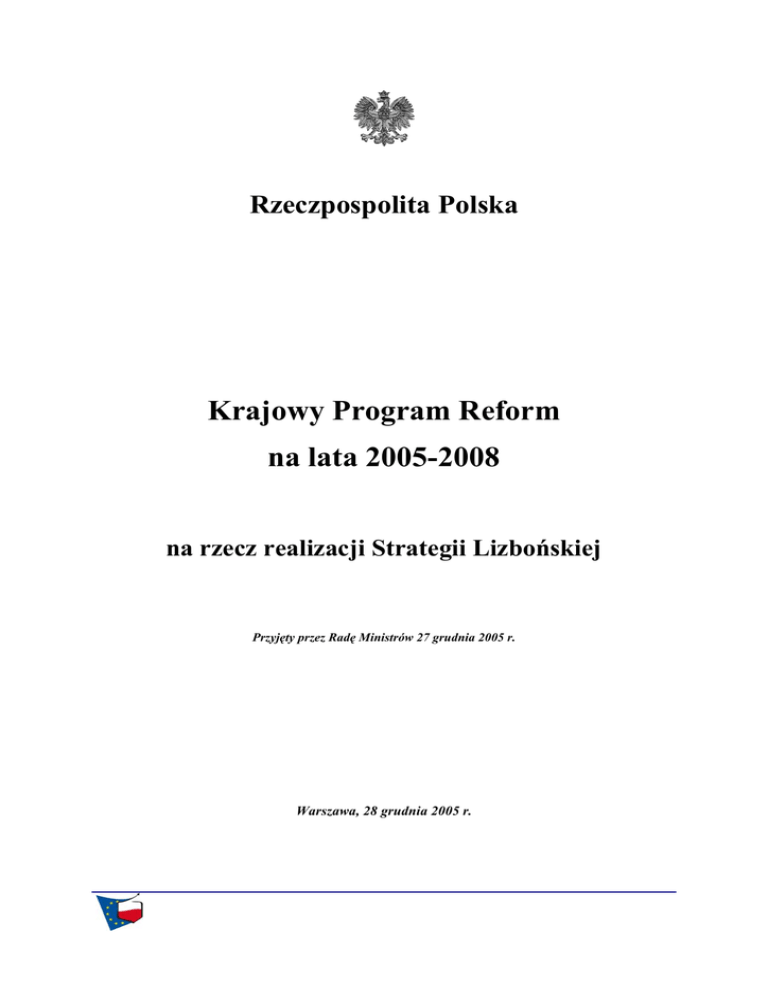 Rzeczpospolita Polska Krajowy Program Reform na lata 2005-2008 na rzecz realizacji Strategii Lizbońskiej Przyjęty przez Radę Ministrów 27 grudnia 2005 r. Warszawa, 28 grudnia 2005 r. Rzeczpospolita Polska Krajowy Program Reform na lata 2005-2008 SPIS TREŚCI WSTĘP......................................................................................................................................... 3 OBSZARY, PRIORYTETY I DZIAŁANIA ............................................................................ 5 Obszar polityki makroekonomicznej i budżetowej.................................................................. 5 Priorytet 1. Konsolidacja finansów publicznych i poprawa zarządzania finansami publicznymi ............ 6 Obszar polityki mikroekonomicznej i strukturalnej ............................................................. 13 Priorytet 2. Rozwój przedsiębiorczości .................................................................................................. 13 Priorytet 3. Wzrost innowacyjności przedsiębiorstw.............................................................................. 17 Priorytet 4. Rozwój i modernizacja infrastruktury oraz zapewnienie warunków konkurencji w sektorach sieciowych........................................................................................................... 20 Obszar polityki rynku pracy .................................................................................................... 27 Priorytet 5. Tworzenie i utrzymanie nowych miejsc pracy oraz zmniejszanie bezrobocia ..................... 27 Priorytet 6. Poprawa zdolności adaptacyjnych pracowników i przedsiębiorstw poprzez inwestowanie w kapitał ludzki............................................................................................. 30 WDRAŻANIE ODNOWIONEJ STRATEGII LIZBOŃSKIEJ PRZY WSPARCIU INSTRUMENTÓW POLITYKI SPÓJNOŚCI ...................................................................... 33 ZAŁĄCZNIK – DZIAŁANIA KPR NA LATA 2005-2008 NA TLE ZINTEGROWANEGO PAKIETU WYTYCZNYCH WE ................................................... 35 2 Rzeczpospolita Polska Krajowy Program Reform na lata 2005-2008 WSTĘP Rola Krajowego Programu Reform Dla zdynamizowania realizacji Strategii Lizbońskiej, wieloletniego programu reform i zmian strukturalnych, mających uczynić obszar UE w perspektywie do 2010 r. wiodącą, najbardziej konkurencyjną gospodarką świata, państwa członkowskie zobowiązały się do przygotowania trzyletnich Krajowych Programów Reform (KPR), akcentując w ten sposób swoją współodpowiedzialność za powodzenie realizacji SL na poziomie krajowym. Zakres i strukturę polskiego KPR oparto o przedstawiony przez Komisję Europejską Zintegrowany Pakiet Wytycznych na lata 2005-2008 1), tj. połączone w jednym dokumencie Ogólne Wytyczne Polityki Gospodarczej (Broad Economic Policy Guidelines) oraz Wytyczne w Sprawie Zatrudnienia (Employment Guidelines). Zintegrowane wytyczne koncentrują się na dwóch podstawowych celach: wzroście gospodarczym oraz zatrudnieniu i obejmują trzy obszary: makroekonomiczny, mikroekonomiczny oraz rynek pracy. Zgodnie z kompleksowym podejściem do zagadnienia konkurencyjności gospodarki, jakie zakłada odnowiona Strategia Lizbońska, należy dążyć do osiągnięcia efektu synergii wszystkich polityk i działań na poziomie krajowym. W szczególności oznacza to konieczność korelacji pomiędzy działaniami prowadzonymi w ramach polityki gospodarczej, polityki zatrudnienia oraz polityki spójności. Krajowy Program Reform jest dokumentem przedstawiającym działania, jakie polski Rząd zamierza podjąć w latach 2005-2008 dla realizacji podstawowych celów odnowionej Strategii Lizbońskiej. KPR jest oparty o Program Działania Rządu Premiera Kazimierza Marcinkiewicza, p.t. „Solidarne Państwo”, który określa strategię gospodarczą Polski. Jako główne cele wskazano w nim przywrócenie polskiej gospodarce zdolności do tworzenia miejsc pracy, i poprzez szybki wzrost gospodarczy, odzyskanie równowagi finansów publicznych oraz rozładowanie napięć społecznych. Podstawy rozwoju społeczno-gospodarczego Fundamentem rozwoju społeczno-gospodarczego Polski w najbliższych latach musi być wysokie tempo wzrostu gospodarczego rzędu co najmniej 5% PKB rocznie. Czynnikami umożliwiającymi wzrost gospodarczy będą dynamiczny eksport oraz inwestycje krajowe (wsparte funduszami strukturalnymi i Funduszem Spójności) i inwestycje zagraniczne, dla których Polska przewiduje pełne otwarcie. Osiągnięcie 5% wzrostu gospodarczego wymaga inwestycji rzędu 10 mld USD rocznie. W celu lepszego wykorzystania przyznanych Polsce środków z funduszy unijnych i zminimalizowania ryzyka utraty tych środków, usprawniona zostanie organizacja i zarządzanie środkami unijnymi. Utworzono jeden ośrodek koordynujący programowanie i zarządzanie programami rozwoju współfinansowanymi z funduszy strukturalnych. Przewiduje się zintensyfikowanie inwestycji infrastrukturalnych i mieszkaniowych. Oczekujemy, że umożliwi to wzrost zatrudnienia i zmniejszanie poziomu bezrobocia. Inwestycje w kapitał ludzki i zwiększenie nakładów na naukę, badania i rozwój oraz na innowacje, sprzyjać będą realizacji programu budowania społeczeństwa opartego na wiedzy, zdolnego do sprostania wyzwaniom demograficznym jak i wyzwaniom konkurencji w globalizującej się gospodarce światowej. Wysoki wzrost gospodarczy stwarza podstawę dla stopniowego usuwania barier rozwoju wynikających z negatywnych cech strukturalnych gospodarki oraz warunki do tworzenia miejsc pracy, nie eliminuje jednak wszystkich problemów. By wyeliminować bariery rozwojowe niezbędne są interwencyjne działania państwa, skoncentrowane na stymulowaniu i utrwalaniu tendencji rozwojowych. A więc tworzenie takich reguł prowadzenia działalności gospodarczej, które obniżą koszty transakcyjne jej wykonywania i zdejmą z przedsię