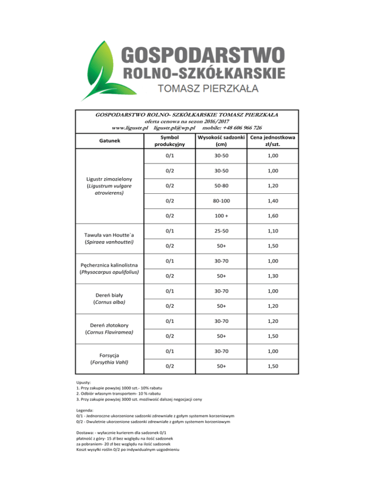 GOSPODARSTWO ROLNO- SZKÓŁKARSKIE TOMASZ PIERZKAŁA oferta cenowa na sezon 2016/2017 www.ligustr.pl [email protected] mobile: +48 606 966 726 Gatunek Ligustr zimozielony (Ligustrum vulgare atrovierens) Tawuła van Houtte`a (Spiraea vanhouttei) Pęcherznica kalinolistna (Physocarpus opulifolius) Dereń biały (Cornus alba) Dereń złotokory (Cornus Flaviramea) Forsycja (Forsythia Vahl) Symbol produkcyjny Wysokość sadzonki Cena jednostkowa (cm) zł/szt. 0/1 30-50 1,00 0/2 30-50 1,00 0/2 50-80 1,20 0/2 80-100 1,40 0/2 100 + 1,60 0/1 25-50 1,10 0/2 50+ 1,50 0/1 30-70 1,00 0/2 50+ 1,30 0/1 30-70 1,00 0/2 50+ 1,20 0/1 30-70 1,20 0/2 50+ 1,50 0/1 30-70 1,00 0/2 50+ 1,50 Upusty: 1. Przy zakupie powyżej 1000 szt.- 10% rabatu 2. Odbiór własnym transportem- 10 % rabatu 3. Przy zakupie powyżej 3000 szt. możliwość dalszej negocjacji ceny Legenda: 0/1 - Jednoroczne ukorzenione sadzonki zdrewniałe z gołym systemem korzeniowym 0/2 - Dwuletnie ukorzenione sadzonki zdrewniałe z gołym systemem korzeniowym Dostawa: - wyłacznie kurierem dla sadzonek 0/1 płatność z góry- 15 zł bez względu na ilość sadzonek za pobraniem- 20 zł bez względu na ilość sadzonek Koszt wysyłki roślin 0/2 po indywidualnym uzgodnieniu