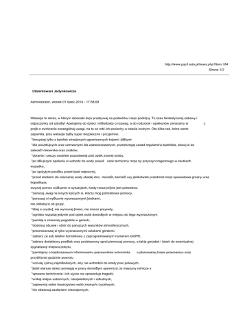 http://www.psp1.edu.pl/news.php?item.184 Strona 1/2 Utalentowani Jedynkowicze Administrator, wtorek 01 lipiec 2014 - 17:58:09 Wakacje to okres, w którym dzieciaki du|o przebywaj na podwórku i du|o podró|uj. To czas fantastycznej zabawy i odpoczynku od szkoBy! Apelujemy do dzieci i mBodzie|y o rozwag, a do rodziców i opiekunów zwracamy si z pro[b o zwrócenie szczególnej uwagi, na to co robi ich pociechy w czasie wolnym. Oto kilka rad, które warto zapamita, |eby wakacje byBy super bezpieczne i przyjemne: "korzystaj tylko z kpielisk strze|onych ograniczonych bojami: |óBtymi "dla pocztkujcych oraz czerwonymi dla zaawansowanych, przestrzegaj zasad regulaminu kpieliska, stosuj si do zaleceD ratownika oraz znaków, "ubrania i rzeczy osobiste pozostawiaj pod opiek znanej osoby, "po dBu|szym opalaniu si wchodz do wody powoli szok termiczny mo|e by przyczyn tragicznego w skutkach wypadku, "po spo|ytym posiBku przed kpiel odpocznij, "przed skokiem do nieznanej wody zbadaj dno - korzeD, kamieD czy jakikolwiek przedmiot mo|e spowodowa grozny uraz krgosBupa, wzywaj pomoc wyBcznie w sytuacjach, kiedy rzeczywi[cie jest potrzebna, "zwracaj uwag na innych kpicych si, którzy mog potrzebowa pomocy, "poruszaj si wyBcznie wyznaczonymi [cie|kami, nie oddalaj si od grupy, "dbaj o czysto[, nie wyrzucaj [mieci, nie niszcz przyrody, "ognisko rozpalaj jedynie pod opiek osób dorosBych w miejscu do tego wyznaczonym, "pamitaj o zmiennej pogodzie w górach, "dostosuj obuwie i ubiór do panujcych warunków atmosferycznych, "przemieszczaj si tylko wyznaczonymi szlakami górskimi, "zabierz ze sob telefon komórkowy z zaprogramowanym numerem GOPR, "zabierz dodatkowy posiBek oraz podstawowy sprzt pierwszej pomocy, a tak|e gwizdek i latark do ewentualnej sygnalizacji miejsca pobytu, "pamitajmy o ka|dorazowym informowaniu pracowników schroniska o planowanej trasie przemarszu oraz przybli|onej godzinie powrotu "uczulaj i pilnuj najmBodszych, aby nie wchodzili do strefy prac polowych, "je|eli starsze dzieci pomagaj w pracy dorosBym upewnij si, |e maszyny rolnicze s "sprawne technicznie i ich u|ycie nie spowoduje tragedii, "unikaj miejsc ustronnych, nieo[wietlonych i odludnych, "zapewniaj sobie towarzystwo osób znanych i |yczliwych, "nie obdarzaj zaufaniem nieznajomych, http://www.psp1.edu.pl/news.php?item.184 Strona 2/2 "je|eli napad stanie si faktem, gBo[no krzycz np. pali si , po|ar lub popro[ o pomoc konkretn osob. Rodzicu, koniecznie powiedz swojemu dziecku, aby: nie zgadzaBo si na jazd samochodem, spacer z obcym, nie bawiBo si w opuszczonych budynkach, piwnicach i wykopach, zachowywaBo szczególne bezpieczeDstwo nad wod, nie jezdziBo rowerem po mie[cie samotnie, nie wje|d|aBo do parków Numer alarmowy Policji 112 lub 997 Katarzyna Czapla i kompleksów le[nych.