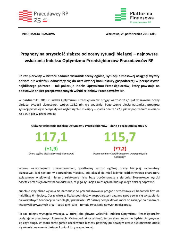 INFORMACJA PRASOWA Warszawa, 28 października 2015 roku Prognozy na przyszłość słabsze od oceny sytuacji bieżącej – najnowsze wskazania Indeksu Optymizmu Przedsiębiorców Pracodawców RP Po raz pierwszy w historii badania wskaźnik oceny ogólnej sytuacji biznesowej osiągnął wyższy poziom niż wskaźnik odnoszący się do oczekiwanej koniunktury gospodarczej w perspektywie najbliższego półrocza – tak pokazuje Indeks Optymizmu Przedsiębiorców, który powstaje na podstawie ankiet przeprowadzonych wśród członków Pracodawców RP. W październiku 2015 r. Indeks Optymizmu Przedsiębiorców przyjął wartość 117,1 pkt w zakresie oceny bieżącej sytuacji biznesowej, wobec 115,2 pkt we wrześniu. Pogorszeniu uległa natomiast prognoza sytuacji przyszłej w perspektywie najbliższych 6 miesięcy – spadła ona ze 122,9 pkt w poprzednim miesiącu do 115,7 pkt w październiku. Główne wskazania Indeksu Optymizmu Przedsiębiorców – dane z października 2015 r. 117,1 115,7 (▴1,9) (▾7,2) Ocena ogólna bieżącej sytuacji biznesowej Ocena ogólna sytuacji biznesowej w perspektywie 6 miesięcy Wbrew wcześniejszym przewidywaniom, gwałtowny wzrost ogólnej oceny bieżącej koniunktury biznesowej, jaki nastąpił w poprzednim miesiącu, nie okazał się mieć jedynie krótkotrwałego charakteru związanego w głównej mierze z relatywnie niską bazą porównawczą z sierpnia. Stosunkowo wysoki odsetek przedsiębiorców nadal odczuwa, że jego sytuacja z miesiąca na miesiąc ulega dalszej poprawie. Zupełnie inny obraz wyłania się natomiast po przeanalizowaniu prognoz przedstawicieli badanych firm na najbliższe 6 miesięcy. Coraz większa liczba podmiotów gospodarczych zaczyna spodziewać się wystąpienia niekorzystnych tendencji w nieodległej przyszłości. W dalszej perspektywie może to zaciążyć na dynamice inwestycji prywatnych oraz – co za tym idzie – tempie tworzenia nowych miejsc pracy. Po raz kolejny wystąpiła sytuacja, w której oba główne wskaźniki Indeksu Optymizmu Przedsiębiorców podążają w przeciwnych kierunkach. Można jednak oczekiwać, że ten stan rzeczy nie będzie utrzymywać się zbyt długo. W teorii coraz gorsze oczekiwania biznesu powinny po pewnym czasie niekorzystnie odbić się również na ocenie bieżącej koniunktury gospodarczej. Stosunkowo dobrze radzą sobie na rynku małe przedsiębiorstwa, co pozostaje pozytywnym sygnałem, zwłaszcza biorąc pod uwagę fakt, iż w większości wcześniejszych edycji badania ta grupa z reguły najgorzej oceniała panującą w Polsce koniunkturę. Jeszcze lepiej wygląda sytuacja bieżąca średnich i dużych firm. Wśród nich częściej niż w mniejszych podmiotach panują jednak obawy odnośnie do tego, co stanie się w najbliższej przyszłości. Najdynamiczniejszy rozwój notują firmy funkcjonujące w obszarze informacji i komunikacji. Z wcześniejszej zapaści coraz śmielej zaczyna wydobywać się także budownictwo. Dużymi optymistami, mimo rosnącego prawdopodobieństwa wprowadzenia niekorzystnych z ich punktu widzenia rozwiązań legislacyjnych, pozostają firmy z sektora finansowego. Negatywne prognozy na przyszłość przeważają zaś wśród przedsiębiorstw przemysłowych oraz transportowych. Ocena sytuacji przyszłej w perspektywie 6 miesięcy 140,0 135,0 135,0 130,0 130,0 125,0 125,0 120,0 120,0 115,0 115,0 110,0 110,0 105,0 105,0 100,0 100,0 95,0 95,0 90,0 90,0 mar-14 kwi-14 maj-14 cze-14 lip-14 sie-14 wrz-14 paź-14 lis-14 gru-14 sty-15 lut-15 mar-15 kwi-15 maj-15 cze-15 lip-15 sie-15 wrz-15 paź-15 140,0 mar-14 kwi-14 maj-14 cze-14 lip-14 sie-14 wrz-14 paź-14 lis-14 gru-14 sty-15 lut-15 mar-15 kwi-15 maj-15 cze-15 lip-15 sie-15 wrz-15 paź-15 Ocena ogólna bieżącej sytuacji biznesowej Indeks Optymizmu Przedsiębiorców Indeks Optymizmu Przedsiębiorców to cykliczne badanie, w którym członkowie Pracodawców RP (ok. 10 tys. firm zatrudniających ok. 5 mln osób) oceniają co miesiąc obecny klimat do prowadzenia interesów oraz prognozują koniunkturę dla biznesu. Organizacja wzorowała się przy tym na niemieckim wskaźniku IFO. Gdy wynik Indeksu przyjmuje wartości poniżej 100 pkt, oznacza to pogarszanie się sytuacji biznesowej, a kiedy przekracza 100 pkt – sygnalizuje poprawę (równe 100 pkt świadczy o braku zmian).