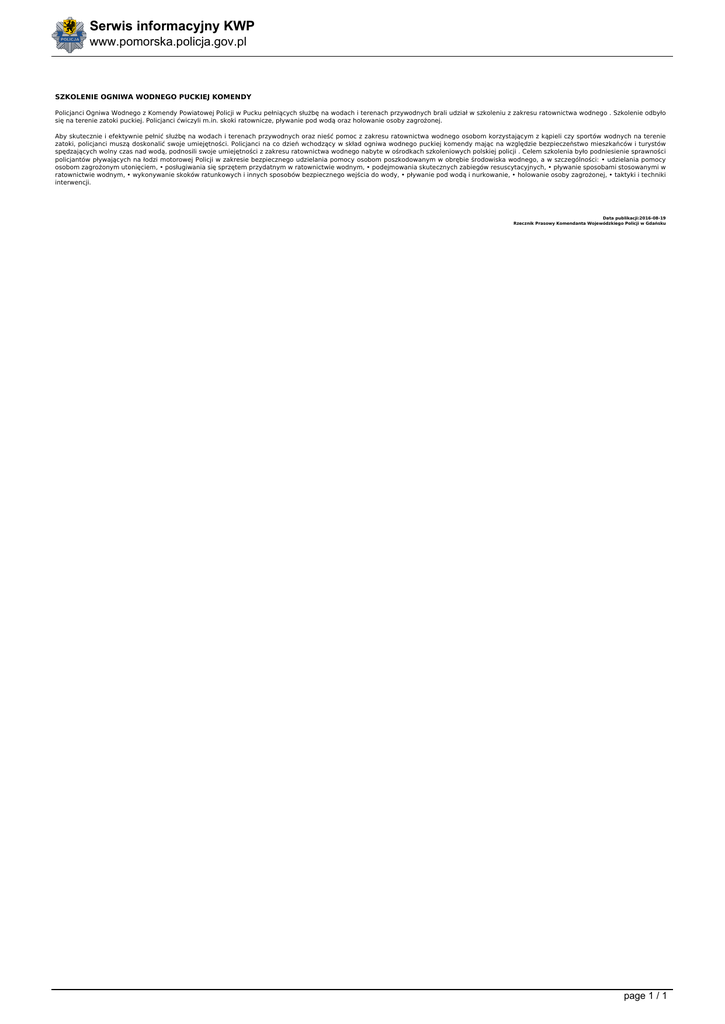 Serwis informacyjny KWP www.pomorska.policja.gov.pl SZKOLENIE OGNIWA WODNEGO PUCKIEJ KOMENDY Policjanci Ogniwa Wodnego z Komendy Powiatowej Policji w Pucku pełniących służbę na wodach i terenach przywodnych brali udział w szkoleniu z zakresu ratownictwa wodnego . Szkolenie odbyło się na terenie zatoki puckiej. Policjanci ćwiczyli m.in. skoki ratownicze, pływanie pod wodą oraz holowanie osoby zagrożonej. Aby skutecznie i efektywnie pełnić służbę na wodach i terenach przywodnych oraz nieść pomoc z zakresu ratownictwa wodnego osobom korzystającym z kąpieli czy sportów wodnych na terenie zatoki, policjanci muszą doskonalić swoje umiejętności. Policjanci na co dzień wchodzący w skład ogniwa wodnego puckiej komendy mając na względzie bezpieczeństwo mieszkańców i turystów spędzających wolny czas nad wodą, podnosili swoje umiejętności z zakresu ratownictwa wodnego nabyte w ośrodkach szkoleniowych polskiej policji . Celem szkolenia było podniesienie sprawności policjantów pływających na łodzi motorowej Policji w zakresie bezpiecznego udzielania pomocy osobom poszkodowanym w obrębie środowiska wodnego, a w szczególności: • udzielania pomocy osobom zagrożonym utonięciem, • posługiwania się sprzętem przydatnym w ratownictwie wodnym, • podejmowania skutecznych zabiegów resuscytacyjnych, • pływanie sposobami stosowanymi w ratownictwie wodnym, • wykonywanie skoków ratunkowych i innych sposobów bezpiecznego wejścia do wody, • pływanie pod wodą i nurkowanie, • holowanie osoby zagrożonej, • taktyki i techniki interwencji. Data publikacji:2016-08-19 Rzecznik Prasowy Komendanta Wojewódzkiego Policji w Gdańsku page 1 / 1 Powered by TCPDF (www.tcpdf.org)