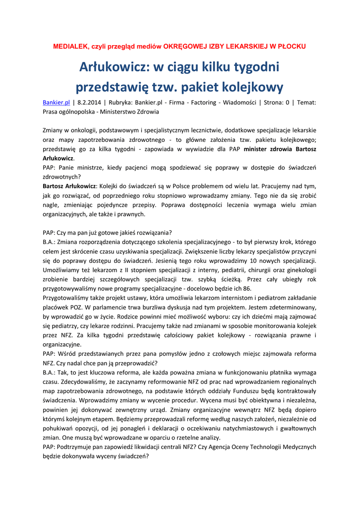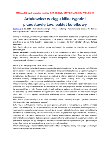MEDIALEK, czyli przegląd mediów OKRĘGOWEJ IZBY LEKARSKIEJ W PŁOCKU Arłukowicz: w ciągu kilku tygodni przedstawię tzw. pakiet kolejkowy Bankier.pl | 8.2.2014 | Rubryka: Bankier.pl - Firma - Factoring - Wiadomości | Strona: 0 | Temat: Prasa ogólnopolska - Ministerstwo Zdrowia Zmiany w onkologii, podstawowym i specjalistycznym lecznictwie, dodatkowe specjalizacje lekarskie oraz mapy zapotrzebowania zdrowotnego - to główne założenia tzw. pakietu kolejkowego; przedstawię go za kilka tygodni - zapowiada w wywiadzie dla PAP minister zdrowia Bartosz Arłukowicz. PAP: Panie ministrze, kiedy pacjenci mogą spodziewać się poprawy w dostępie do świadczeń zdrowotnych? Bartosz Arłukowicz: Kolejki do świadczeń są w Polsce problemem od wielu lat. Pracujemy nad tym, jak go rozwiązać, od poprzedniego roku stopniowo wprowadzamy zmiany. Tego nie da się zrobić nagle, zmieniając pojedyncze przepisy. Poprawa dostępności leczenia wymaga wielu zmian organizacyjnych, ale także i prawnych. PAP: Czy ma pan już gotowe jakieś rozwiązania? B.A.: Zmiana rozporządzenia dotyczącego szkolenia specjalizacyjnego - to był pierwszy krok, którego celem jest skrócenie czasu uzyskiwania specjalizacji. Zwiększenie liczby lekarzy specjalistów przyczyni się do poprawy dostępu do świadczeń. Jesienią tego roku wprowadzimy 10 nowych specjalizacji. Umożliwiamy też lekarzom z II stopniem specjalizacji z interny, pediatrii, chirurgii oraz ginekologii zrobienie bardziej szczegółowych specjalizacji tzw. szybką ścieżką. Przez cały ubiegły rok przygotowywaliśmy nowe programy specjalizacyjne - docelowo będzie ich 86. Przygotowaliśmy także projekt ustawy, która umożliwia lekarzom internistom i pediatrom zakładanie placówek POZ. W parlamencie trwa burzliwa dyskusja nad tym projektem. Jestem zdeterminowany, by wprowadzić go w życie. Rodzice powinni mieć możliwość wyboru: czy ich dziećmi mają zajmować się pediatrzy, czy lekarze rodzinni. Pracujemy także nad zmianami w sposobie monitorowania kolejek przez NFZ. Za kilka tygodni przedstawię całościowy pakiet kolejkowy - rozwiązania prawne i organizacyjne. PAP: Wśród przedstawianych przez pana pomysłów jedno z czołowych miejsc zajmowała reforma NFZ. Czy nadal chce pan ją przeprowadzić? B.A.: Tak, to jest kluczowa reforma, ale każda poważna zmiana w funkcjonowaniu płatnika wymaga czasu. Zdecydowaliśmy, że zaczynamy reformowanie NFZ od prac nad wprowadzaniem regionalnych map zapotrzebowania zdrowotnego, na podstawie których oddziały Funduszu będą kontraktowały świadczenia. Wprowadzimy zmiany w wycenie procedur. Wycena musi być obiektywna i niezależna, powinien jej dokonywać zewnętrzny urząd. Zmiany organizacyjne wewnątrz NFZ będą dopiero którymś kolejnym etapem. Będziemy przeprowadzali reformę według naszych założeń, niezależnie od pohukiwań opozycji, od jej ponagleń i deklaracji o oczekiwaniu natychmiastowych i gwałtownych zmian. One muszą być wprowadzane w oparciu o rzetelne analizy. PAP: Podtrzymuje pan zapowiedź likwidacji centrali NFZ? Czy Agencja Oceny Technologii Medycznych będzie dokonywała wyceny świadczeń? B.A.: Tak jak wspomniałem, analizujemy różne rozwiązania, rozpatrujemy różne warianty. Musimy mieć pewność, że ta bardzo ważna i potrzebna reforma będzie przeprowadzona skutecznie i nie zaszkodzi pacjentom. W najbliższy miesiącach zaprezentujemy nasze propozycje. PAP: Z reformą NFZ związane były zapowiedzi dotyczące wprowadzania dodatkowych ubezpieczeń zdrowotnych. Czy zapadła już decyzja w tej sprawie? B.A.: Nie ma jeszcze takiej decyzji, toczy się publiczna dyskusja na temat dodatkowych ubezpieczeń. Na pewno nie zgodzę się na żaden projekt dyskryminujący pacjentów, których nie stać na wykupienie ubezpieczenia. Jeśli system dodatkowych ubezpieczeń ma w ogóle być wprowadzony, to trzeba go zbudować na zasadzie solidaryzmu społecznego. W żadnym przypadku nie może on utrudniać mniej zamożnym osobom dostępu do leczenia. PAP: Jakie są główne założenia zmian w Podstawowej Opiece Zdrowotnej, które pan zapowiedział? B.A.: POZ musi stanowić filar i podstawę całego systemu ochrony zdrowia. Zależy mi na tym, żeby każdy pacjent znał swojego lekarza rodzinnego, żeby był z nim w kontakcie. Niestety dzisiaj część pacjentów nie wie nawet, kto jest ich lekarzem rodzinnym. Trzeba odwrócić tę tendencję. Wbrew obiegowym opiniom, lekarz rodzinny ma prawo i obowiązek zdiagnozować pacjenta - może zlecić ponad 50 badań diagnostycznych, m.in. krwi, USG, EKG, RTG. Nie musi w każdym przypadku odsyłać go do specjalisty. Lekarz rodzinny ma także prawo wypisać pacjentowi z chorobą przewlekłą receptę na lek refundowany, bez konieczności odsyłania go do specjalisty. PAP: Nie uważa pan, że system finansowania POZ oparty na stawce kapitacyjnej za każdego pacjenta sprawia, że lekarzom rodzinnym nie opłaca się zlecać badań, bo to wpływa na zmniejszenie ich zarobku? B.A.: System finansowania POZ wymaga zmian. Chcemy zaproponować rozwiązania, które będą motywowały lekarzy rodzinnych do poszerzania diagnostyki, zapraszania do siebie nowych pacjentów i obejmowania opieką całych rodzin. Przygotowujemy dodatkowy systemem motywacyjny, ale o szczegółach będę informował już po zakończeniu prac. PAP: Problem finansowania pojawia się także w Ambulatoryjnej Opiece Specjalistycznej, eksperci podkreślają, że zbyt wielu pacjentów z powodu kosztów leczenia odsyłanych jest niepotrzebnie z AOS do szpitali. B.A.: Rzeczywiście, zbyt często niektóre badania diagnostyczne i zabiegi, które można wykonać w AOS, są niepotrzebnie wykonywane w szpitalach. W konsekwencji pacjenci, którzy mogliby być leczeni w AOS, zajmują łóżka przeznaczone dla chorych wymagających hospitalizacji. W wydanych rozporządzeniach koszykowych przesunęliśmy już część procedur ze szpitali do AOS. Zmieniamy wycenę w AOS, 