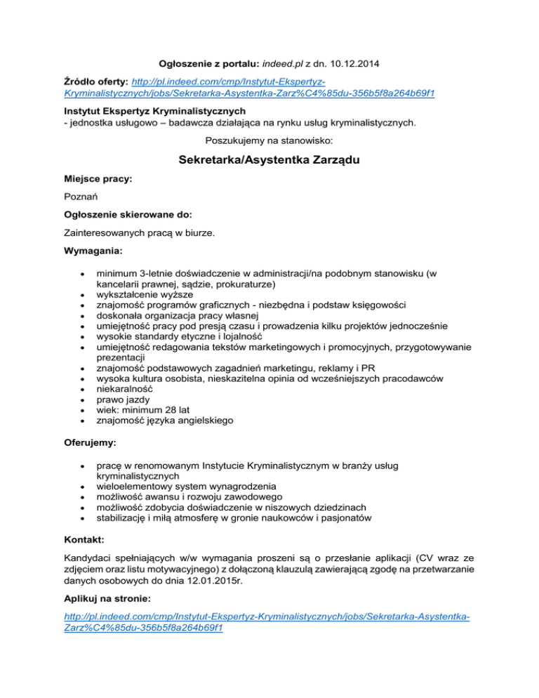 Ogłoszenie z portalu: indeed.pl z dn. 10.12.2014 Źródło oferty: http://pl.indeed.com/cmp/Instytut-EkspertyzKryminalistycznych/jobs/Sekretarka-Asystentka-Zarz%C4%85du-356b5f8a264b69f1 Instytut Ekspertyz Kryminalistycznych - jednostka usługowo – badawcza działająca na rynku usług kryminalistycznych. Poszukujemy na stanowisko: Sekretarka/Asystentka Zarządu Miejsce pracy: Poznań Ogłoszenie skierowane do: Zainteresowanych pracą w biurze. Wymagania: minimum 3-letnie doświadczenie w administracji/na podobnym stanowisku (w kancelarii prawnej, sądzie, prokuraturze) wykształcenie wyższe znajomość programów graficznych - niezbędna i podstaw księgowości doskonała organizacja pracy własnej umiejętność pracy pod presją czasu i prowadzenia kilku projektów jednocześnie wysokie standardy etyczne i lojalność umiejętność redagowania tekstów marketingowych i promocyjnych, przygotowywanie prezentacji znajomość podstawowych zagadnień marketingu, reklamy i PR wysoka kultura osobista, nieskazitelna opinia od wcześniejszych pracodawców niekaralność prawo jazdy wiek: minimum 28 lat znajomość języka angielskiego Oferujemy: pracę w renomowanym Instytucie Kryminalistycznym w branży usług kryminalistycznych wieloelementowy system wynagrodzenia możliwość awansu i rozwoju zawodowego możliwość zdobycia doświadczenie w niszowych dziedzinach stabilizację i miłą atmosferę w gronie naukowców i pasjonatów Kontakt: Kandydaci spełniających w/w wymagania proszeni są o przesłanie aplikacji (CV wraz ze zdjęciem oraz listu motywacyjnego) z dołączoną klauzulą zawierającą zgodę na przetwarzanie danych osobowych do dnia 12.01.2015r. Aplikuj na stronie: http://pl.indeed.com/cmp/Instytut-Ekspertyz-Kryminalistycznych/jobs/Sekretarka-AsystentkaZarz%C4%85du-356b5f8a264b69f1