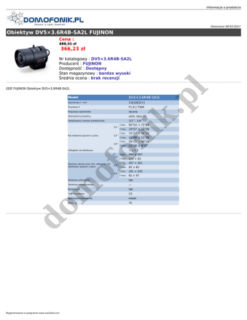 Informacje o produkcie Utworzono 08-03-2017 Obiektyw DV5×3.6R4B-SA2L FUJINON Cena : 488,31 zł 366,23 zł GDE FUJINON Obiektyw DV5×3.6R4B-SA2L DV5×3.6R4B-SA2L Ogniskowa f `mm` 3.6~18(5×) Przysłona F F1.8 ~ T360 ręczna auto, typu DC Sterowanie przysłoną 1/3 ", 1/4" Dedykowany rozmiar przetwornika 1/2 " 1/3 " f min. 95°54′ × 72°24′ f max. 19°57′ × 15°09′ f min. 72°24′ × 54°25′ f max. 15°09′ × 11°26′ f min. 54°25′ × 40°50′ f max. 11°26′ × 8°37′ on Kąt widzenia (poziom x pion) 1/4 " Odległość od obiektywu ik . Model Regulacja ogniskowej ∞ ~ 0.3 1/2 " f min. 694 × 457 f max. 110 × 83 f min. 457 × 321 f max. 83 × 62 f min. 321 × 232 f max. 62 × 47 of Wymiary obrazu przy min. odległości od obiektywu (poziom x pion) 1/3 " 1/4 " tak Obiektyw megapixelowy ― Korekcja IR tak Typ mocowania CS Wykonanie mocowania metal Masa `g` 75 m Obiektyw asferyczny do Wygenerowano w programie www.oscGold.com pl Nr katalogowy : DV5×3.6R4B-SA2L Producent : FUJINON Dostępność : Dostępny Stan magazynowy : bardzo wysoki Średnia ocena : brak recenzji