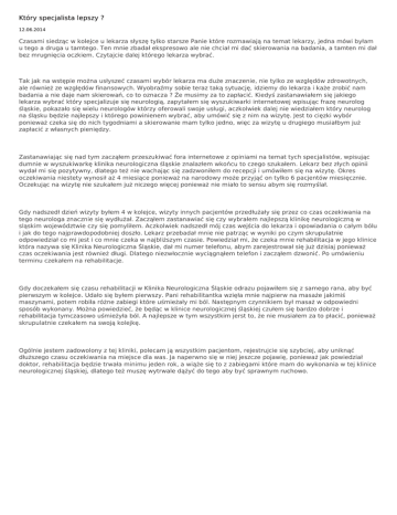 Który specjalista lepszy ? 12.06.2014 Czasami siedząc w kolejce u lekarza słyszę tylko starsze Panie które rozmawiają na temat lekarzy, jedna mówi byłam u tego a druga u tamtego. Ten mnie zbadał ekspresowo ale nie chciał mi dać skierowania na badania, a tamten mi dał bez mrugnięcia oczkiem. Czytajcie dalej którego lekarza wybrać. Tak jak na wstępie można usłyszeć czasami wybór lekarza ma duże znaczenie, nie tylko ze względów zdrowotnych, ale również ze względów finansowych. Wyobraźmy sobie teraz taką sytuację, idziemy do lekarza i każe zrobić nam badania a nie daje nam skierowań, co to oznacza ? Że musimy za to zapłacić. Kiedyś zastanawiałem się jakiego lekarza wybrać który specjalizuje się neurologią, zapytałem się wyszukiwarki internetowej wpisując frazę neurolog śląskie, pokazało się wielu neurologów którzy oferowali swoje usługi, aczkolwiek dalej nie wiedziałem który neurolog na śląsku będzie najlepszy i którego powinienem wybrać, aby umówić się z nim na wizytę. Jest to cięzki wybór ponieważ czeka się do nich tygodniami a skierowanie mam tylko jedno, więc za wizytę u drugiego musiałbym już zapłacić z własnych pieniędzy. Zastanawiając się nad tym zacząłem przeszukiwać fora internetowe z opiniami na temat tych specjalistów, wpisując dumnie w wyszukiwarkę klinika neurologiczna śląskie znalazłem wkońcu to czego szukałem. Lekarz bez złych opinii wydał mi się pozytywny, dlatego też nie wachając się zadzwoniłem do recepcji i umówiłem się na wizytę. Okres oczekiwania niestety wynosił aż 4 miesiące ponieważ na narodowy może przyjąć on tylko 6 pacjentów miesięcznie. Oczekując na wizytę nie szukałem już niczego więcej ponieważ nie miało to sensu abym się rozmyślał. Gdy nadszedł dzień wizyty byłem 4 w kolejce, wizyty innych pacjentów przedłużały się przez co czas oczekiwania na tego neurologa znacznie się wydłużał. Zacząłem zastanawiać się czy wybrałem najlepszą klinikę neurologiczną w sląskim województwie czy się pomyliłem. Aczkolwiek nadszedł mój czas wejścia do lekarza i opowiadania o całym bólu i jak do tego najprawdopodobniej doszło. Lekarz przebadał mnie nie patrząc w wyniki po czym skrupulatnie odpowiedział co mi jest i co mnie czeka w najbliższym czasie. Powiedział mi, że czeka mnie rehabilitacja w jego klinice która nazywa się Klinika Neurologiczna Śląskie, dał mi numer telefonu, abym zarejestrował się już dzisiaj ponieważ czas oczekiwania jest również długi. Dlatego niezwłocznie wyciągnąłem telefon i zacząłem dzwonić. Po umówieniu terminu czekałem na rehabilitacje. Gdy doczekałem się czasu rehabilitacji w Klinika Neurologiczna Śląskie odrazu pojawiłem się z samego rana, aby być pierwszym w kolejce. Udało się byłem pierwszy. Pani rehabilitantka wzięła mnie najpierw na masaże jakimiś maszynami, potem robiła różne zabiegi które uśmieżały mi ból. Następnym czynnikiem był masaż w odpowiedni sposób wykonany. Można powiedzieć, że będąc w klinice neurologicznej śląskiej czułem się bardzo dobrze i rehabilitacja tymczasowo uśmieżyła ból. A najlepsze w tym wszystkim jerst to, że nie musiałem za to płacić, ponieważ skrupulatnie czekałem na swoją kolejkę. Ogólnie jestem zadowolony z tej kliniki, polecam ją wszystkim pacjentom, rejestrujcie się szybciej, aby uniknąć dłuższego czasu oczekiwania na miejsce dla was. Ja naperwno się w niej jeszcze pojawię, ponieważ jak powiedział doktor, rehabilitacja będzie trwała minimu jeden rok, a wiąże się to z zabiegami które mam do wykonania w tej klinice neurologicznej śląskiej, dlatego też muszę wytrwale dążyć do tego aby być sprawnym ruchowo. Powered by TCPDF (www.tcpdf.org)
