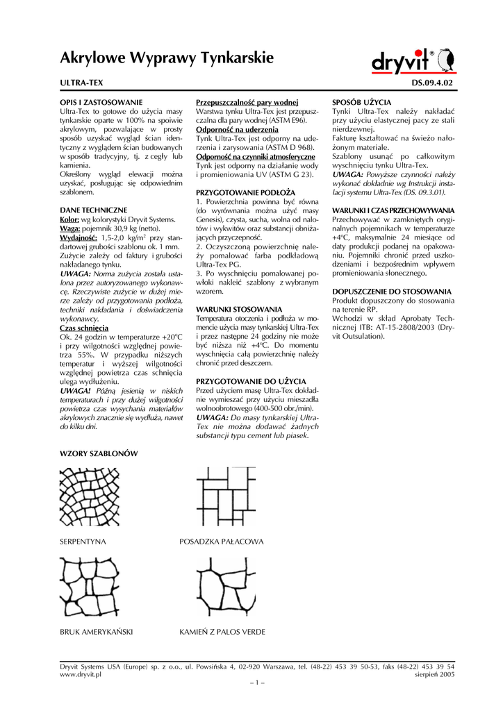 Akrylowe Wyprawy Tynkarskie ULTRA-TEX DS.09.4.02 OPIS I ZASTOSOWANIE Ultra-Tex to gotowe do użycia masy tynkarskie oparte w 100% na spoiwie akrylowym, pozwalające w prosty sposób uzyskać wygląd ścian identyczny z wyglądem ścian budowanych w sposób tradycyjny, tj. z cegły lub kamienia. Określony wygląd elewacji można uzyskać, posługując się odpowiednim szablonem. DANE TECHNICZNE Kolor: wg kolorystyki Dryvit Systems. Waga: pojemnik 30,9 kg (netto). Wydajność: 1,5-2,0 kg/m2 przy standartowej grubości szablonu ok. 1 mm. Zużycie zależy od faktury i grubości nakładanego tynku. UWAGA: Norma zużycia została ustalona przez autoryzowanego wykonawcę. Rzeczywiste zużycie w dużej mierze zależy od przygotowania podłoża, techniki nakładania i doświadczenia wykonawcy. Czas schnięcia Ok. 24 godzin w temperaturze +20oC i przy wilgotności względnej powietrza 55%. W przypadku niższych temperatur i wyższej wilgotności względnej powietrza czas schnięcia ulega wydłużeniu. UWAGA! Późną jesienią w niskich temperaturach i przy dużej wilgotności powietrza czas wysychania materiałów akrylowych znacznie się wydłuża, nawet do kilku dni. Przepuszczalność pary wodnej Warstwa tynku Ultra-Tex jest przepuszczalna dla pary wodnej (ASTM E96). Odporność na uderzenia Tynk Ultra-Tex jest odporny na uderzenia i zarysowania (ASTM D 968). Odporność na czynniki atmosferyczne Tynk jest odporny na działanie wody i promieniowania UV (ASTM G 23). PRZYGOTOWANIE PODŁOŻA 1. Powierzchnia powinna być równa (do wyrównania można użyć masy Genesis), czysta, sucha, wolna od nalotów i wykwitów oraz substancji obniżających przyczepność. 2. Oczyszczoną powierzchnię należy pomalować farba podkładową Ultra-Tex PG. 3. Po wyschnięciu pomalowanej powłoki nakleić szablony z wybranym wzorem. WARUNKI STOSOWANIA Temperatura otoczenia i podłoża w momencie użycia masy tynkarskiej Ultra-Tex i przez następne 24 godziny nie może być niższa niż +4oC. Do momentu wyschnięcia całą powierzchnię należy chronić przed deszczem. SPOSÓB UŻYCIA Tynki Ultra-Tex należy nakładać przy użyciu elastycznej pacy ze stali nierdzewnej. Fakturę kształtować na świeżo nałożonym materiale. Szablony usunąć po całkowitym wyschnięciu tynku Ultra-Tex. UWAGA: Powyższe czynności należy wykonać dokładnie wg Instrukcji instalacji systemu Ultra-Tex (DS. 09.3.01). WARUNKI I CZAS PRZECHOWYWANIA Przechowywać w zamkniętych oryginalnych pojemnikach w temperaturze +4oC, maksymalnie 24 miesiące od daty produkcji podanej na opakowaniu. Pojemniki chronić przed uszkodzeniami i bezpośrednim wpływem promieniowania słonecznego. DOPUSZCZENIE DO STOSOWANIA Produkt dopuszczony do stosowania na terenie RP. Wchodzi w skład Aprobaty Technicznej ITB: AT-15-2808/2003 (Dryvit Outsulation). PRZYGOTOWANIE DO UŻYCIA Przed użyciem masę Ultra-Tex dokładnie wymieszać przy użyciu mieszadła wolnoobrotowego (400-500 obr./min). UWAGA: Do masy tynkarskiej UltraTex nie można dodawać żadnych substancji typu cement lub piasek. WZORY SZABLONÓW SERPENTYNA POSADZKA PAŁACOWA BRUK AMERYKAŃSKI KAMIEŃ Z PALOS VERDE Dryvit Systems USA (Europe) sp. z o.o., ul. Powsińska 4, 02-920 Warszawa, tel. (48-22) 453 39 50-53, faks (48-22) 453 39 54 www.dryvit.pl sierpień 2005 –1– Akrylowe Wyprawy Tynkarskie ULTRA-TEX DS.09.4.02 STARA CEGŁA 4 X 4 TILE SANTA FE OPASKA CEGLANA PRODUKT POLSKI ISO 9001 Powyższe informacje są zgodne ze specyfikacjami odnośnie instalacji systemów Dryvit i są przedstawione w dobrej wierze. Dryvit nie ponosi odpowiedzialności za pracę projektanta i wykonawcy. Aby się upewnić, że korzystają Państwo z najnowszych informacji, prosimy o kontakt z naszą firmą. Dryvit Systems USA (Europe) sp. z o.o., ul. Powsińska 4, 02-920 Warszawa, tel. (48-22) 453 39 50-53, faks (48-22) 453 39 54 www.dryvit.pl sierpień 2005 –2–