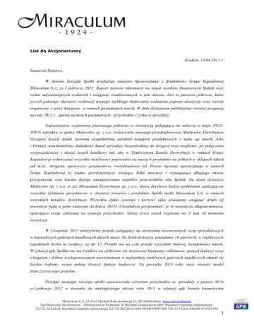 List do Akcjonariuszy Kraków, 14.08.2012 r. Szanowni Państwo, W imieniu Zarządu Spółki przekazuję niniejsze Sprawozdanie z działalności Grupy Kapitałowej Miraculum S.A. za I półrocze 2012. Raport zawiera informacje na temat wyników finansowych Spółek oraz wykaz najważniejszych wydarzeń i osiągnięć zrealizowanych w tym okresie. Jest to pierwsze półrocze, które powoli pokazuje słuszność realizacji strategii szybkiego budowania wolumenu poprzez akwizycje oraz rozwój organiczny o nowe kategorie w ramach posiadanych marek. W dniu dzisiejszym publikujemy również prognozę na cały 2012 r. opartą na dwóch parametrach: przychodów i zysku ze sprzedaży. Najważniejsze wydarzenie pierwszego półrocza to inwestycja polegająca na nabyciu w maju 2012r. 100 % udziałów w spółce Multicolor sp. z o.o. (właściciela dawnego przedsiębiorstwa Multicolor Distribution Grzegorz Kosyl) dzięki, któremu uzupełniliśmy portfolio kategorii produktowych o make up (marki Joko i Virtual), uruchomiliśmy dodatkowy kanał sprzedaży bezpośredniej do drogerii oraz mogliśmy, po połączeniu wyspecjalizować i ułożyć zespół handlowy tak, aby w Tradycyjnym Kanale Dystrybucji w ramach Grupy Kapitałowej wykorzystać wszystkie możliwości pojawienia się naszych produktów na półkach w sklepach takich jak m.in.; drogerie, spożywczo- przemysłowe, wielobranżowe itd. Proces łączenia operacyjnego w ramach Grupy Kapitałowej to trudne przedsięwzięcie trwające kilka miesięcy i wymagające długiego okresu przygotowań oraz bardzo dużego zaangażowania zespołów pracowników obu Spółek. Na dzień dzisiejszy Multicolor sp. z o.o. to już Miraculum Dystrybucja sp. z o.o., która docelowo będzie podmiotem realizującym wszystkie działania sprzedażowe w obszarze towarów i produktów Spółki matki Miraculum S.A. w ramach wszystkich kanałów dystrybucji. Wszystkie efekty synergii i korzyści jakie planujemy osiągnąć dzięki tej inwestycji będą w pełni widoczne do końca 2012r. Chciałabym przypomnieć, że to inwestycja długoterminowa, opierająca swoje założenia na synergii przychodów, której zwrot został rozpisany na 3 lata od momentu inwestycji. W I kwartale 2012 wdrożyliśmy projekt polegający na otwieraniu nowoczesnych wysp sprzedażowych w największych galeriach handlowych dużych miast. Na dzień dzisiejszy posiadamy 10 placówek, w najbliższych tygodniach liczba ta zwiększy się do 12. Projekt ma na celu przede wszystkim budowę świadomości marek. W sytuacji gdy Spółka nie ma środków na efektywne ale kosztowne kampanie reklamowe, pomysł budowy wysp z bogatym i dobrze wyeksponowanym asortymentem w najbardziej ruchliwych galeriach handlowych okazał się bardzo trafiony, wyspy pełnią również funkcje badawcze. Na początku 2013 roku ruszy również model franczyzowy tego projektu. Przyjęta strategia rozwoju spółki zaowocowała wzrostem przychodów ze sprzedaży o prawie 40 % w I półroczu 2012 w stosunku do analogicznego okresu roku 2011 w sytuacji gdy branża kosmetyczna Miraculum S. A., ul. Prof. Michała Bobrzyńskiego 14, 30-348 Kraków, www.miraculum.pl; Sąd Rejonowy dla Krakowa – Śródmieścia w Krakowie, XI Wydział Gospodarczy KRS; Wysokość kapitału zakładowego: 23.731.367,20 zł; Wysokość kapitału wpłaconego: 23.731.367,20 zł; KRS 0000034099 NIP 726 23 92 016 REGON 472905994 1 w kategoriach oferowanych przez Miraculum (pielęgnacja twarzy, pielęgnacja ciała, preparaty do i po goleniu oraz perfumeria) zanotowały spadki, lub tylko 1-5% wzrosty. Dzięki inwestycjom w IV kw. 2011 i w I półroczu 2012 jesteśmy obecni w coraz większej ilości sklepów, co powoduje, że klienci rezygnują z produktów konkurencji i wybierają nasze marki. Nasza obecność jest jeszcze niewystarczająca, ale jesteśmy przekonani, że nasza determinacja w zdobywaniu tak trudnego rynku oraz sukcesy w pozyskiwaniu środków na rozwój przełożą się na poprawę wiarygodności w oczach inwestorów. Bardzo nas cieszy ciężko wypracowany wynik w pierwszym półroczu na poziomie 25 mln. Byłby on jeszcze wyższy, gdyby nie czynniki zewnętrzne, takie jak około trzymiesięczne opóźnienie w przejęciu Multicolor sp. z o.o. oraz awaria maszyny produkującej kremy do golenia Lider i Wars, która spowodowała, że przez dwa miesiące II kwartału nie mogliśmy realizować zamówień zawierających te produkty. Wzrost w 2012 kosztów sprzedaży (dział sprzedaży, koszty umów handlowych) i kosztów ogólnego zarządu (marketing, finanse, księgowość, logistyka, zarząd i RN) wynika z nakładów inwestycyjnych i działań marketingowych jakie Spółka musi realizować, aby realizować wzrosty i bardzo dobre wyniki na poziomie wskaźnika EBITDA (cel na 31.12.2014 – 25mln). Cały rok 2012 jest postawiony pod znakiem inwestycji w rynek, dystrybucję i w marki, które są bardzo pożądane przez Spółkę po dwóch latach walki o przetrwanie. Zapewniam wszystkich, że dużo łatwiej jest przekonać Sąd do upadłości z możliwością zawarcia układu niż ten układ zrealizować. Nie chcemy już patrzeć w przeszłość tylko szukać szans w przyszłości. Branża FMCG jest bardzo dynamiczna i wymagająca, w której, branża kosmetyczna to jedna z najbardziej konkurencyjnych kategorii jakie mamy na polskim rynku. Prawie trzy lata bez inwestycji w rynek wyrządziły olbrzymie szkody i teraz, aby dogonić swoją pozycję sprzed lat w rankingu największych polskich spółek kosmetycznych musimy przekroczyć poziom przychodów powyżej 150-200 mln. Osiągnięcie takich poziomów będzie możliwe przy spełnieniu dwóch czynników, pierwszy to znalezienie biznesów, które będą wpisywały się w naszą strategię akwizycyjną oraz będzie możliwe finansowanie wzrostów (zapasy i należności) z bieżącego cash flow na takim poziomie na jakim gwarantuje nam to realizowanie wszystkich zamówień od naszych odbiorców. Na ten moment niest