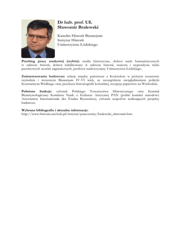 Dr hab. prof. UŁ Sławomir Bralewski Katedra Historii Bizancjum Instytut Historii Uniwersytetu Łódzkiego Przebieg pracy naukowej (wybór): studia historyczne, doktor nauk humanistycznych w zakresie historii, doktor habilitowany w zakresie historii, stażysta i stypendysta wielu prestiżowych uczelni zagranicznych, profesor nadzwyczajny Uniwersytetu Łódzkiego. Zainteresowania badawcze: relacje między państwem a Kościołem w późnym cesarstwie rzymskim i wczesnym Bizancjum IV-VI wiek, ze szczególnym uwzględnieniem polityki Konstantyna Wielkiego oraz przekazu historiografii kościelnej, recepcja papiestwa na Wschodzie. Pełnione funkcje: członek Polskiego Towarzystwa Historycznego oraz Komisji Bizantynologicznej Komitetu Nauk o Kulturze Antycznej PAN (polski komitet narodowy Association Internationale des Études Byzantines), członek zespołów realizujących projekty badawcze. Wybrana bibliografia i aktualne informacje: http://www.historia.uni.lodz.pl/instytut/pracownicy/bralewski_slawomir.htm