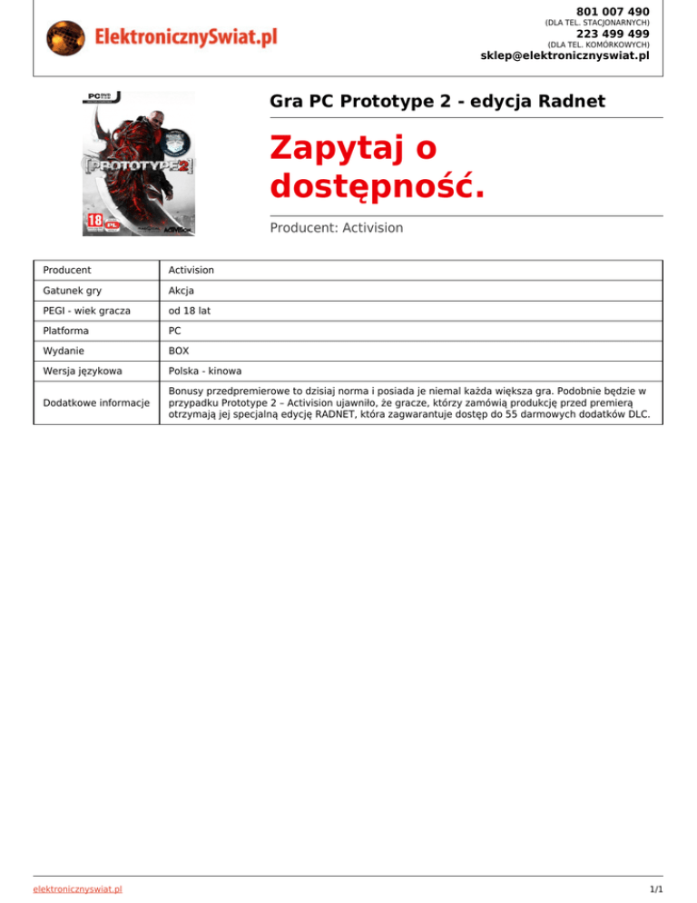 801 007 490 (DLA TEL. STACJONARNYCH) 223 499 499 (DLA TEL. KOMÓRKOWYCH) [email protected] Gra PC Prototype 2 - edycja Radnet Zapytaj o dostępność. Producent: Activision Producent Activision Gatunek gry Akcja PEGI - wiek gracza od 18 lat Platforma PC Wydanie BOX Wersja językowa Polska - kinowa Dodatkowe informacje Bonusy przedpremierowe to dzisiaj norma i posiada je niemal każda większa gra. Podobnie będzie w przypadku Prototype 2 – Activision ujawniło, że gracze, którzy zamówią produkcję przed premierą otrzymają jej specjalną edycję RADNET, która zagwarantuje dostęp do 55 darmowych dodatków DLC. elektronicznyswiat.pl 1/1