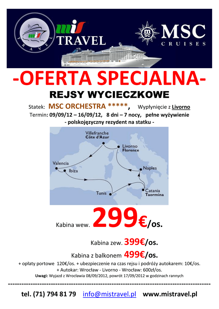 -OFERTA SPECJALNAREJSY WYCIECZKOWE Statek: MSC ORCHESTRA *****, Wypłynięcie z Livorno Termin: 09/09/12 – 16/09/12, 8 dni – 7 nocy, pełne wyżywienie - polskojęzyczny rezydent na statku - Kabina wew. 299€ /os. Kabina zew. 399€/os. Kabina z balkonem 499€/os. + opłaty portowe 120€/os. + ubezpieczenie na czas rejsu i podróży autokarem: 10€/os. + Autokar: Wrocław - Livorno - Wrocław: 600zł/os. Uwagi: Wyjazd z Wrocławia 08/09/2012, powrót 17/09/2012 w godzinach rannych -----------------------------------------------------------------------------------------tel. (71) 794 81 79 [email protected] www.mistravel.pl Program rejsu: Dzień 1. 2. 3. 4. 5. 6. 7. 8. Program Rejsu Livorno Lazurowe Wybrzeże Walencja Ibiza Tunis Katania Neapol Livorno Wpł. … 07:00 12:30 01:00 13:30 13:30 09:00 09:30 Wypł. 19:00 14:00 17:30 13:00 19:30 19:30 17:00 … Kraje, które odwiedzisz: WŁOCHY - FRANCJA - HISZPANIA - TUNEZJA Cruising to nowy sposób zwiedzania świata, niezapomniane wakacje, wspaniała przygoda i mnóstwo atrakcji. Takiej rozrywki nie dostarczy żadna wycieczka czy typowe wczasy. Będąc na statku oglądamy świat z innej perspektywy, odkrywamy wiele ciekawych miejsc, do których nie dotarlibyśmy wykupując tradycyjny pobyt w hotelu. Podczas snu w swoim wygodnym apartamencie, statek przeniesie Cię w nowe miejsce, które zobaczysz i poznasz już o poranku. Wszystko to w standardzie luksusowego 5* hotelu, który zadowoli gusta nawet najbardziej wymagającego Klienta. Na pokładzie znajdziesz baseny, kasyna, teatry, kina 4D, galerie handlowe, pola minigolfa oraz wiele innych niezwykłych atrakcji… Cena obejmuje: 8-dniowy rejs statkiem MSC Orchestra – zakwaterowanie w kabinie wybranej kategorii (7 noclegów); serwis bagażowy i kabinowy; wyżywienie – 3 główne posiłki, podwieczorek, bufet lub przekąski o północy; korzystanie z basenu i innych urządzeń sportowo-rekreacyjnych; udział we wszystkich imprezach organizowanych na statku. Cena nie obejmuje: wycieczek fakultatywnych w trakcie rejsu; korzystania z punktów usługowych na statku (fotograf, pralnia, SPA, Internet); napojów gazowanych i alkoholowych zamawianych w barach i do posiłków; napiwków dla obsługi statku (7€/dobę/os. dorosłą; dzieci od 14 lat – 3,5€/dobę) -------------------------------------------------------------------------------------------tel. (71) 794 81 79 [email protected] www.mistravel.pl