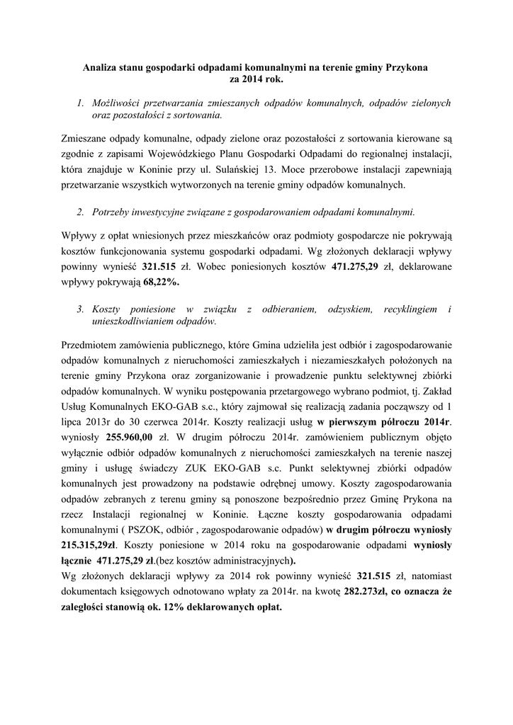 Analiza stanu gospodarki odpadami komunalnymi na terenie gminy Przykona za 2014 rok. 1. Możliwości przetwarzania zmieszanych odpadów komunalnych, odpadów zielonych oraz pozostałości z sortowania. Zmieszane odpady komunalne, odpady zielone oraz pozostałości z sortowania kierowane są zgodnie z zapisami Wojewódzkiego Planu Gospodarki Odpadami do regionalnej instalacji, która znajduje w Koninie przy ul. Sulańskiej 13. Moce przerobowe instalacji zapewniają przetwarzanie wszystkich wytworzonych na terenie gminy odpadów komunalnych. 2. Potrzeby inwestycyjne związane z gospodarowaniem odpadami komunalnymi. Wpływy z opłat wniesionych przez mieszkańców oraz podmioty gospodarcze nie pokrywają kosztów funkcjonowania systemu gospodarki odpadami. Wg złożonych deklaracji wpływy powinny wynieść 321.515 zł. Wobec poniesionych kosztów 471.275,29 zł, deklarowane wpływy pokrywają 68,22%. 3. Koszty poniesione w związku unieszkodliwianiem odpadów. z odbieraniem, odzyskiem, recyklingiem i Przedmiotem zamówienia publicznego, które Gmina udzieliła jest odbiór i zagospodarowanie odpadów komunalnych z nieruchomości zamieszkałych i niezamieszkałych położonych na terenie gminy Przykona oraz zorganizowanie i prowadzenie punktu selektywnej zbiórki odpadów komunalnych. W wyniku postępowania przetargowego wybrano podmiot, tj. Zakład Usług Komunalnych EKO-GAB s.c., który zajmował się realizacją zadania począwszy od 1 lipca 2013r do 30 czerwca 2014r. Koszty realizacji usług w pierwszym półroczu 2014r. wyniosły 255.960,00 zł. W drugim półroczu 2014r. zamówieniem publicznym objęto wyłącznie odbiór odpadów komunalnych z nieruchomości zamieszkałych na terenie naszej gminy i usługę świadczy ZUK EKO-GAB s.c. Punkt selektywnej zbiórki odpadów komunalnych jest prowadzony na podstawie odrębnej umowy. Koszty zagospodarowania odpadów zebranych z terenu gminy są ponoszone bezpośrednio przez Gminę Prykona na rzecz Instalacji regionalnej w Koninie. Łączne koszty gospodarowania odpadami komunalnymi ( PSZOK, odbiór , zagospodarowanie odpadów) w drugim półroczu wyniosły 215.315,29zł. Koszty poniesione w 2014 roku na gospodarowanie odpadami wyniosły łącznie 471.275,29 zł.(bez kosztów administracyjnych). Wg złożonych deklaracji wpływy za 2014 rok powinny wynieść 321.515 zł, natomiast dokumentach księgowych odnotowano wpłaty za 2014r. na kwotę 282.273zł, co oznacza że zaległości stanowią ok. 12% deklarowanych opłat. 4. Liczba mieszkańców. Liczba mieszkańców, która wynika z ewidencji meldunkowej wynosiła na dzień 1.01.2014r. 4406.osób, natomiast na podstawie deklaracji złożonych przez mieszkańców ustalono liczbę 3958 osób. W stosunku do zakładanego poziomu liczba mieszkańców zadeklarowanych jest o 10 % mniejsza. Na terenie gminy zadeklarowano odbiór odpadów z 1134 nieruchomości zamieszkałych. 5. Liczba właścicieli nieruchomości, którzy nie zawarli umowy. Gmina objęła przetargiem w pierwszym półroczu wszystkie nieruchomości zamieszkałe i niezamieszkałe na swoim terenie, natomiast w drugim półroczu natomiast tylko nieruchomości zamieszkałe. Wg posiadanych sprawozdań umowy nie zawarło ................właścicieli nieruchomości niezamieszkałych. 6. Ilość wytworzonych odpadów komunalnych. Wg sprawozdań dostarczonych przez firmę odbierającą odpady, zebrano następujące ilości zmieszanych odpadów komunalnych: Styczeń 60,54 Luty 42,68 Marzec - 66,62 Kwiecień - 60,32 Maj 44,72 Czerwiec - 33,28 Lipiec 44,88 Mg Sierpień53,82 Wrzesień38,18 Październik - 39,1 Listopad 33,58 (59,06 łącznie z ostatnim objazdem) Grudzień – 97,74 (72,28 bez objazdu listopadowego) W sumie w 2014r odebrano łącznie 615 Mg komunalnych odpadów zmieszanych Selektywnie w ciągu roku zebrano: Szkło i opakowania szklane - 58,48 Mg Tworzywa sztuczne - 69,14 Mg Odpady wielkogabarytowe - 6,64 Mg Papier, tektura - 17,3 Mg Odpady biodegradowalne - 26,08 Mg Opony - 4,0 Mg Zużyty sprzęt elektryczny - 3,4 Mg 7. Ilości zmieszanych odpadów komunalnych, odpadów zielonych oraz pozostałości z sortowania przeznaczonych do składowania. Wg sprawozdań Zakładu Usług Komunalnych EKO-GAB s.c. do Regionalnej instalacji przetwarzania odpadów komunalnych w Koninie dostarczono 615,00 Mg komunalnych odpadów zmieszanych, Wnioski 1. Odbiorem odpadów objęte są wszystkie nieruchomości zamieszkałe z terenu gminy Przykona – 1134 nieruchomości zadeklarowanych. 2. W roku funkcjonowania systemu odebrano 615 ton odpadów zmieszanych, wobec zakładanych we wstepnej kalkulacji 605 Mg 3. Selektywnie odebrano od mieszkańców oraz zebrano w PSZOK-u w Psarach 185 ton odpadów (szkło, plastik, papier, odpady wielkogabarytowe, opony oraz zielone). 4. Wpływy z opłat wniesionych przez mieszkańców oraz podmioty gospodarcze nie pokrywają kosztów funkcjonowania systemu gospodarki odpadami. Deklarowane wpływy pokrywają 68,22%. Stawki opłat wnoszonych przez mieszkańców są zbyt niskie. 5. O 10% zmniejszyła się liczba mieszkańców zadeklarowanych w stosunku do liczby zameldowanych. 6. Zwiększone, w stosunku do zakładanych, ilości odbieranych zmieszanych odpadów komunalnych wynikają naszym zdaniem z niedostatecznej segregacji odpadów oraz dużej ilości popiołów i żużla składowanych w pojemnikach. 7. W dalszym ciągu należy prowadzić edukację w kierunku właściwego postępowania z odpadami powstałymi w gospodarstwie domowym. 8. W następnym okresie należy rozważyć wprowadzenie nowej frakcji zbieranej selektywnie tj. popioły i żużle z palenisk domowych i wprowadzić dodatkowy objazd. 9. Ściągalność opłat wynosi 88 %