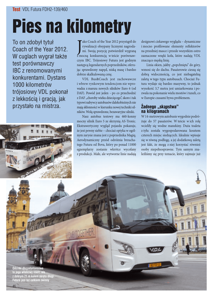 Test VDL Futura FDH2-139/460 Pies na kilometry To on zdobył tytuł Coach of the Year 2012. W cuglach wygrał także test porównawczy IBC z renomowanymi konkurentami. Dystans 1000 kilometrów trójosiowy VDL pokonał z lekkością i gracją, jak przystało na mistrza. Odcinki długodystansowe to jego właściwy rewir, ale z dobrym 21 m kołem skrętu długi Futura jest też całkiem zwinny 46 J ako Coach of the Year 2012 przystąpił do rywalizacji obsypany licznymi nagrodami. Swoją pozycję potwierdził wygraną z mocną konkurencją w teście porównawczym IBC. Trójosiowy Futura jest godnym następcą legendarnych poprzedników, oferując sprawdzony napęd, niską masę i bardzo dobrze skalkulowaną cenę. VDL Bus&Coach jest zachowawcze i wbrew rynkowym tendencjom nie wprowadza z marszu nowych silników Euro 6 (od DAF). Powód jest jeden – po co przechodzić z DAF „choroby wieku dziecięcego’’, skoro i tak typowi nabywcy autobusów dalekobieżnych nie mają skłonności w kierunku nowej techniki silników. Wolą sprawdzone, bezawaryjne silniki. Nasz autobus testowy ma 460-konny mocny silnik Euro 5 ze skrzynią AS-Tronic. Ekstrawertyczny wygląd pojazdu pokazuje, że jest pewny siebie – chociaż optyka w ogólnym zarysie znana jest z poprzednika Magiq. Aerodynamiczny przód odróżnia brzuchatego Futura od Bova, który po ponad 11000 egzemplarzy zostanie wkrótce wycofany z produkcji. Małe, ale wytworne linie nadają designowi ciekawego wyglądu – dynamiczne i mocno profilowane elementy reflektorów na przedniej masce i przede wszystkim ostro zaznaczone wnęki koła, które nadają VDL znacząco męską linię. Linia okien, jakby „popchnięta” do góry, wznosi się do dachu. Pasażerowie cieszą się dobrą widocznością, co jest niebagatelną zaletą w tego typu autobusach. Chociaż Futura wydaje się bardzo masywny, to jednak wysokość 3,7 metra jest umiarkowana i pozwala na pokonanie wielu mostów i tuneli, co w Europie czasami bywa problemem. Żadnego „skąpstwa” na kilogramach W 14-metrowym autobusie wygodnie podróżuje do 57 pasażerów. W teście w ich rolę wcieliły się wodne manekiny. Duża toaleta z tyłu została wygospodarowana kosztem czterech miejsc siedzących. Idealnie wpisuje się w równą podłogę, a jej dodatkową zaletą jest fakt, że mogą z niej korzystać również osoby niepełnosprawne. Tym samym znaleźliśmy się przy temacie, który zajmuje już wiele przedsiębiorstw: wspieranie pasażerów, którzy jeżdżą na wózkach inwalidzkich. Winda w Futurze FHD kosztuje niewiele miejsca, znajduje się zaraz za osią wleczoną. Bez obaw, winda Dhollandia jest łatwa w użyciu, może unieść maksymalnie 500 kg, wystarczające zapasy dla wózka elektrycznego i osoby towarzyszącej. Trzy podwójne siedzenia z szybkimi zamknięciami zostają zdemontowane przed wsiadaniem. W ten sposób powstaje miejsce na trzy wózki inwalidzkie, które są bezpiecznie kotwiczone w szynach opatentowanego systemu bezpieczeństwa. Cały system waży podobno około 180 kg – bez obaw, ten trójosiowy pojazd zniesie to swobodnie. Producent podaje masę własną 16220 kg, razem z pełnym wyposażeniem z kuchenką i urządzeniem odkurzającym. Przy limicie 25 t kierowca „długaśnego” Futury nie musi uważać na ładowność, nawet jeśli zapełni bagażnik o pojemności 10,7 m³. Nieoślepiający design nocny Atrakcyjny kokpit z prostą obsługą, dobra widoczność do przodu i na boki Na długich trasach Właściwym „środowiskiem” długiego Futury są dalekie dystanse. Choćby tylko dlatego, że doskonale trzyma linię jazdy na wprost. Jest to pozytywna konsekwencja dużego rozstawu kół i osi wleczonej, która od 40 km/h już nie skręca. Duża prędkość podróżna na autostradzie? Tu Futura nie daje się długo prosić, zdecydowana moc silnika i napęd sprawiają, że jest to proste. Osiągnięta prędkość średnia 97,99 km/h przez 750 km mówi sama za siebie – małe straty prędkości wyrównuje mocny sześciocylindrowy MX. Wystarczy mu 1200 obrotów do osiągnięcia 100 km/h na długim dwunastym biegu. Skrzynię z jednej strony chroni napęd, a z drugiej wspiera niskie zużycie paliwa. Mocny diesel spala poniżej 25 l podczas długiej jazdy, chociaż mokre podczas testu jezdnie i niskie temperatury nie sprzyjały ekonomice. Niski poziom obrotów powinien błogo odzwierciedlić się w pasażerach. Z tyłu od basowych do dosadnych dźwięków grzmi sześciocylindrowiec. A znaczne szumy wiatru z przodu wskazują na to, że właściwie dobra aerodynamika Futury ma jeszcze kilka rzeczy do naprawy. Ogrzewanie także nie pracuje całkiem cicho, zamiast cichych konwektorów pomieszczenie ogrzewają cztery podpodłogowe nagrzewnice powietrzne. Jednak jak tylko usiądzie się w części pasażerskiej, nie ma się zastrzeżeń do świata i Futury. Fotele autobusowe oferują do- Oszczędność miejsca: winda Dhollandia dla wózków inwalidzkich z udźwigiem 500 kg 47 Test VDL Futura FDH2-139/460 Fakty VDL Futura FD H2-139/460 Zdaniem testera Napęd Mocny sześciocylindrowy diesel Duże przebiegi Korzystne zużycie paliwa Ociężały sposób przełączania biegów skrzyni AS-Tronic Dane techniczne Silnik Chłodzony wodą sześciocylindrowy silnik rzędowy typ MX340 U1 OBD2 znajdujący się z tyłu, elektronicznie regulowany wtrysk bezpośredni, turbosprężarka i intercooler, cztery zawory na cylinder, wartości wydalania CO2 według normy Euro 5 z katalizatorem SCR Pojemność: 12810 cm3 Moc: 340 kW/462 KM przy 1500-1900 obr./min Maksymalny moment obrotowy: 2300 Nm przy 1000-1410 obr./min Przeniesienie napędu Jednotarczowe sprzęgło suche, automatyczna skrzynia biegów ZF AS-Tronic, przełożenia 12,33-0,78, oś hipoidalna, przełożenia osi i=2,93 Podwozie Zawieszenie pneumatyczne z elektroniczną regulacją podwozia Ecas, z przodu niezależne zawieszenie kół ZF RL 75 E z podwójnym wahaczem poprzecznym i dwoma miechami powietrznymi, dwa amorty
