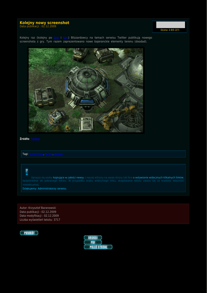 Kolejny nowy screenshot Data publikacji : 02.12.2009 Ocena: 2.9/5 (27) Kolejny raz (kolejny po tym i tym) Blizzardowcy na łamach serwisu Twitter publikują nowego screenshota z gry. Tym razem zaprezentowano nowe bajeranckie elementy terenu (doodad). Źródło: Twitter Tagi: screenshoty, twitter, dodads Uprasza się osoby kopiujące w całości newsy z naszej witryny na swoje strony lub fora o wstawianie widocznych klikalnych linków, bezpośrednio do pobranego tekstu. W przypadku braku widocznego linku, skopiowanie tekstu uważa się za kradzież własności intelektualnej. Dziękujemy: Administratorzy serwisu. Autor: Krzysztof Baranowski Data publikacji : 02.12.2009 Data modyfikacji : 02.12.2009 Liczba wyświetleń tekstu: 3717 Komentarz (23) dodaj komentarz Jeeest...po tygodniach oczekiwaniach i nieprzespanych nocach...niemozliwe stale sie faktem...mamy Screenshota! Do redakcji : powyzszy komentarz ma tylko i wylacznie zwiazek z polityka Blizzarda a nie wasza praca, ktora bardzo doceniamy. ~Sebo250 2009/12/02 20:33 JA Pier*** co oni ku**wa robią?? Zamiast Bety jakieś bezsensowne budynki -_- Przecież to chyb do bety potrzebne nie jest nie?Mogliby to dopracowywać podczas TRWANIA bety :(~Adamixsosx 2009/12/02 20:48 Mogli by to, mogli by tamto. Gdyby babcia miała wąsy to by była wojewodą. Wież mi lub nie, ale jeśli ta gra powstawała od zera to prawdopodobnie 3-4 lata silnik, a reszta sam gameplay. Myślisz, że jak nie zrobią tego budyneczku to starcraft wyjdzie szybciej? Co ma wisieć nie utonie. Blizzard robi gry swoim tempem i ma nas wszystkich w nosie, bo wie, że i tak to kupimy. To taka jest prawda i trzeba się z nią pogodzić.~ShadowDancer 2009/12/02 21:53 Wierz* Fail :C~ShadowDancer 2009/12/02 21:53 Taaak, myslę, że to jest to, na co wszyscy czekają. -,Jak mawia mój tatuś - "lecą w pręta".~The_13 2009/12/02 22:09 Wiedząc, że po moim komentarzu pewnie jeszcze niejedna osoba zbluzga ten scr. shoot za samo jego istnienie, odważę się i napiszę coś pozywtywnego.. a mianowicie: Jeszcze niegdy na żadnym screenie z SC2 nie widziałem tak ładnego(stonowanego?) Supply Depot'a xd!!!.. - Szkoda, że w normalnej rozgrywce nie będą tak wygladać : / ..a zamiast tego mamy klocki lego... : /~Xeron 2009/12/02 22:29 @Xeron Klocków Lego w to nie mieszaj~Adu 2009/12/02 22:56 Wara od LEGO ! ;p~The_13 2009/12/02 23:27 Czemu : ( ? Do czasu premiery sc2 kochałem klocki lego... Ich koncern pewnie stoi za całą grafiką nowego Blizzarda~Xeron 2009/12/02 23:31 Nareszcie dali cos pożadnego juz sie balem ze dadza jakis BR. Chyba wydrukuje sobie tego scrn i wytapetuje cale mieszkanie. Po takim szokujacym doniesieniu teraz mozemy liczyc jedynie na scrn wody lub drzew i to dopiero za 2 lata ;p~badboyave 2009/12/03 07:55 Chciałem jak zwykle sypnąć jakiś ironiczny komentarz do głupoty shitzarda, ale niestety Sebo250 i badboyave mnie uprzedzili :) cholera jak tak dalej pójdzie będzie straszna konkurencja w szydzeniu z szitzarda.~aoetje 2009/12/03 08:49 Macie rację, powinni siedzieć cicho i się nie odzywać aż zrobią betę. Nawet i parę miesięcy. A fani prowadzący tematyczne serwisy powinni bojkotować takie wiadomości i ich nie publikować!~MHT 2009/12/03 09:20 Wow, teraz wiem, że w Blizzardzie się nie lenią i cięzko pracują;] Wiekszość z tych budynków i tak już było widać na różnych filmikach..~Dagaen 2009/12/03 10:20 wy jesteście najzajebistsi i niech tak zostanie~rybatort 2009/12/03 11:32 wy jesteście najzajebistsi i niech tak zostanie~rybatort 2009/12/03 11:32 Blizzardowi poprostu Starcraft 2 sie nie udal i po cichu robia to gre na nowa jeszcze raz :)~mgkiler 2009/12/03 12:52 Własnie tak, my jestesmy mega, a blizzard jest be~Killst4r 2009/12/03 13:29 ŁAŁ nowy SKRIN SZOT O maj GAD !! ŁAŁ !! Po prostu Zajekwiście ! Szkoda, że nie można poddać się hibernacji ;(~kuc 2009/12/03 20:01 A tak na serio, to Chuck Norris strzelił tego scrennshoota! Powinienem napisac Chuck Norris i 40 łobuzoshootów. Mógłby powstać nowy teleturniej 1 z 40 :P~kuc 2009/12/03 20:16 Z tą hibernacją to nie głupi pomysł tylko wiesz w 2012 koniec świata :D~Adamixsosx 2009/12/03 20:52 Popatrzy człowiek na takiego screenshota i już życie staje się lepsze.~Adu 2009/12/03 21:13 A chyba sobie wkleję tego shoota do albumu z komunii :D~kuc 2009/12/03 22:11 Moja babeczka gotuje w takim makaron...~kuc 2009/12/03 22:20 dodaj komentarz 08.10.2015 Kampania "Szepty o zagładzie" dostępna za darmo (0 komentarzy) 27.09.2015 Kolejni bohaterowie w trybie Sprzymierzonych Dowódców (0 komentarzy) 22.09.2015 Cyfrowe gadżety za udział w BlizzCon 2015 (0 komentarzy) 15.07.2015 Legacy of the Void dostępne w przedsprzedaży! (0 komentarzy) 17.06.2015 Informacje z E3 - prolog kampanii Legacy of the Void (0 komentarzy) 30.05.2015 WCS Europe - sobota (30 maja) 18.00 grupa G - MaNa! (0 komentarzy) 07.05.2015 DreamHack Open France 2015 - już 8 maja - MaNa! (0 komentarzy) 03.05.2015 Na wesoło: postacie E-sportu 50 (0 komentarzy) 03.05.2015 IEM Katowice 2015 - jeszcze raz! (0 komentarzy) 03.05.2015 KeSPA Cup 2015 Season 1 - live! (0 komentarzy) 26.04.2015 Proleague - Top5 gier miesiąca (0 komentarzy) 26.04.2015 CJ Entus wygrywa 2 runde Proleague! (0 komentarzy) 18.04.2015 Wersja beta Legacy of the Void – aktualizacja 2.5.1 (0 komentarzy) 18.04.2015 WCS finals 2015 - galeria (0 komentarzy) 18.04.2015 Omówienie zmian w balansie Legacy of the Void (0 komentarzy) 11.04.2015 WCS Europe kwalifikacje z Polakami - dziś (sobota) 18.00 (0 komentarzy) 11.04.2015 Aktualizacja balansu Heart of the Swarm – 9 kwietnia (0 komentarzy) 11.04.2015 GSL Season1 2015 - galeria (0 komentarzy) 11.04.2015 Zbanowane konta w StarCraft II (0 komentarzy) 04.04.2015 Red Bull Battle Grounds powraca jesienią 2015 (0 komentarzy) (zobacz wszystkie)