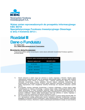 Wykaz zmian wprowadzonych do prospektu informacyjnego KBC BETA Specjalistycznego Funduszu Inwestycyjnego Otwartego w dniu 4 kwietnia 2012 r. Rozdział III Dane o Funduszu 3.2. Tabele opłat 3.2.1 Tabela opłat manipulacyjnych Towarzystwa: Brzmienie dotychczasowe: Towarzystwo pobiera opłaty manipulacyjne z tytułu zbycia Jednostek Uczestnictwa Funduszu zgodnie z poniższą tabelą: Wysokość opłaty manipulacyjnej przy wpłacie do funduszu: 1) 2) 3) Wysokość wpłaty (w zł): KBC BETA SFIO do 249 999 1,00% 250 000 – 499 999,99 0,75% 500 000 – 999 999,99 0,50% 1 000 000 i powyżej 0,25% Stawki wskazane w tabeli mogą być obniżone w wyniku negocjacji z Klientem. Stawka opłaty negocjowanej uzależniona może być od wysokości dokonywanej wpłaty, łącznego salda środków zgromadzonych przez klienta w Funduszu, trybu i sposobu dokonywania wpłaty na nabycie Jednostek Uczestnictwa, miejsca składania zlecenia nabycia Jednostek Uczestnictwa lub przynależności do określonej przez Fundusz grupy nabywców Jednostek Uczestnictwa. Stawka opłaty negocjowanej może uwzględniać dowolną kombinację lub wszystkie powyższe czynniki łącznie. W przypadku zamiany Jednostek Uczestnictwa z funduszu źródłowego o niższej stawce opłaty manipulacyjnej do funduszu docelowego o wyższej stawce opłaty manipulacyjnej pobierana jest opłata wyrównująca. W takim przypadku wysokość opłaty wyrównującej kalkulowana jest jako różnica pomiędzy aktualnie obowiązującą stawką opłaty manipulacyjnej w funduszu docelowym i w funduszu źródłowym. Stawka opłaty wyrównującej może być obniżona w wyniku negocjacji z Klientem i może być uzależniona od kryteriów określonych w pkt. 1. Dla Uczestników dla których Rejestr otwarty został lub zostanie w punkcie obsługi klientów KBC TFI S.A. wprowadzone zostają preferencyjne warunki nabywania Jednostek Uczestnictwa Funduszu polegające na zwolnieniu tychże Uczestników z opłat manipulacyjnych z tytułu nabywania Jednostek Uczestnictwa Funduszu. Zwolnienie z opłaty manipulacyjnej wprowadzone zostaje na czas określony 4) do dnia zmiany niniejszej Tabeli w zakresie zwolnienia z opłaty, o którym mowa w niniejszym punkcie. Przy odkupywaniu Jednostek Uczestnictwa przez Fundusz od Klientów Towarzystwo nie pobiera opłat manipulacyjnych. Brzmienie obecne: Towarzystwo pobiera opłaty manipulacyjne z tytułu zbycia Jednostek Uczestnictwa Funduszu zgodnie z poniższą tabelą: Wysokość opłaty manipulacyjnej przy wpłacie do funduszu: 1. 2. 3. 4. 5. Wysokość wpłaty (w zł): KBC BETA SFIO do 249 999 1,00% 250 000 – 499 999,99 0,75% 500 000 – 999 999,99 0,50% 1 000 000 i powyżej 0,25% Stawki wskazane w tabeli mogą być obniżone w wyniku negocjacji z Klientem. Stawka opłaty negocjowanej uzależniona może być od wysokości dokonywanej wpłaty, łącznego salda środków zgromadzonych przez klienta w Funduszu, trybu i sposobu dokonywania wpłaty na nabycie Jednostek Uczestnictwa, miejsca składania zlecenia nabycia Jednostek Uczestnictwa lub przynależności do określonej przez Fundusz grupy nabywców Jednostek Uczestnictwa. Stawka opłaty negocjowanej może uwzględniać dowolną kombinację lub wszystkie powyższe czynniki łącznie. W przypadku zamiany Jednostek Uczestnictwa z funduszu źródłowego o niższej stawce opłaty manipulacyjnej do funduszu docelowego o wyższej stawce opłaty manipulacyjnej pobierana jest opłata wyrównująca. W takim przypadku wysokość opłaty wyrównującej kalkulowana jest jako różnica pomiędzy aktualnie obowiązującą stawką opłaty manipulacyjnej w funduszu docelowym i w funduszu źródłowym. Stawka opłaty wyrównującej może być obniżona w wyniku negocjacji z Klientem i może być uzależniona od kryteriów określonych w pkt. 1. Dla Uczestników dla których Rejestr otwarty został lub zostanie w punkcie obsługi klientów KBC TFI S.A. wprowadzone zostają preferencyjne warunki nabywania Jednostek Uczestnictwa Funduszu polegające na zwolnieniu tychże Uczestników z opłat manipulacyjnych z tytułu nabywania Jednostek Uczestnictwa Funduszu. Zwolnienie z opłaty manipulacyjnej wprowadzone zostaje na czas określony do dnia zmiany niniejszej Tabeli w zakresie zwolnienia z opłaty, o którym mowa w niniejszym punkcie. Dla Uczestników, którzy otworzyli lub otworzą rejestr z wykorzystaniem aplikacji Fund Investor administrowanej przez „Atlantic Fund Services” Sp. z o.o. przy czym, przekierowanie do aplikacji nastąpiło lub nastąpi ze strony www.kbctfi.pl, wprowadzone zostają preferencyjne warunki nabywania jednostek uczestnictwa Funduszy polegające na zwolnieniu tychże Uczestników z opłat manipulacyjnych z tytułu zbycia przez Fundusz jednostek uczestnictwa. Zwolnienie z opłaty manipulacyjnej wprowadzone zostaje na czas określony do dnia zmiany niniejszej Tabeli w zakresie zwolnienia z opłaty, o której mowa w niniejszym punkcie. Przy odkupywaniu Jednostek Uczestnictwa przez Fundusz od Klientów Towarzystwo nie pobiera opłat manipulacyjnych. 3.2.2 Tabela opłat manipulacyjnych KBC Securities N.V. Oddział w Polsce: Brzmienie dotychczasowe: KBC Securities N.V. Oddział w Polsce pobiera opłaty manipulacyjne z tytułu zbycia Jednostek Uczestnictwa Funduszu zgodnie z poniższą tabelą: Wysokość opłaty manipulacyjnej przy wpłacie do funduszu: -2- 1) 2) 3) 4) 5) Wysokość wpłaty (w zł): KBC BETA SFIO do 249 999 1,00% 250 000 – 499 999,99 0,75% 500 000 – 999 999,99 0,50% 1 000 000 i powyżej 0,25% O ile wartość deklarowanej przez Klienta jednorazowej wpłaty wynosi minimum 100.000 zł, bądź łączna wartość środków zgromadzonych przez Klienta na jego rejestrach wynosi minimum 100.000 zł stawki wskazane w Tabeli mogą być obniżone w wyniku negocjacji. Do negocjowania z Klientem standardowych stawek opłaty manipulacyjnej oraz do samodzielnego ustalania uzgodnionej z Klientem stawki opłaty manipulacyjnej upoważnieni są, w granicach określony