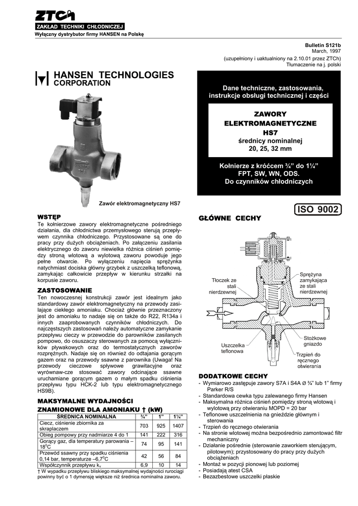 Bulletin S121b March, 1997 (uzupełniony i uaktualniony na 2.10.01 przez ZTCh) Tłumaczenie na j. polski Dane techniczne, zastosowania, instrukcje obsługi technicznej i części ZAWORY ELEKTROMAGNETYCZNE HS7 średnicy nominalnej 20, 25, 32 mm Kołnierze z króćcem ¾” do 1¼” FPT, SW, WN, ODS. Do czynników chłodniczych Zawór elektromagnetyczny HS7 WSTĘP Te kołnierzowe zawory elektromagnetyczne pośredniego działania, dla chłodnictwa przemysłowego sterują przepływem czynnika chłodniczego. Przystosowane są one do pracy przy dużych obciążeniach. Po załączeniu zasilania elektrycznego do zaworu niewielka różnica ciśnień pomiędzy stroną wlotową a wylotową zaworu powoduje jego pełne otwarcie. Po wyłączeniu napięcia sprężynka natychmiast dociska główny grzybek z uszczelką teflonową, zamykając całkowicie przepływ w kierunku strzałki na korpusie zaworu. ZASTOSOWANIE Ten nowoczesnej konstrukcji zawór jest idealnym jako standardowy zawór elektromagnetyczny na przewody zasilające ciekłego amoniaku. Chociaż głównie przeznaczony jest do amoniaku to nadaje się on także do R22, R134a i innych zaaprobowanych czynników chłodniczych. Do najczęstszych zastosowań należy automatyczne zamykanie przepływu cieczy w przewodzie do parowników zasilanych pompowo, do osuszaczy sterowanych za pomocą wyłączników pływakowych oraz do termostatycznych zaworów rozprężnych. Nadaje się on również do odtajania gorącym gazem oraz na przewody ssawne z parownika (Uwaga! Na przewody cieczowe spływowe grawitacyjne oraz wyrównaw-cze stosować zawory odcinające ssawne uruchamiane gorącym gazem o małym spadku ciśnienia przepływu typu HCK-2 lub typu elektromagnetycznego HS9B). MAKSYMALNE WYDAJNOŚCI ZNAMIONOWE DLA AMONIAKU † (kW) ŚREDNICA NOMINALNA Ciecz, ciśnienie zbiornika za skraplaczem Obieg pompowy przy nadmiarze 4 do 1 Gorący gaz, dla temperatury parowania – 180C Przewód ssawny przy spadku ciśnienia 0,14 bar, temperaturze –6,70C Współczynnik przepływu kv ¾” 1” 1¼” 703 925 1407 141 222 316 74 95 141 42 56 84 6,9 10 14 † W wypadku przepływu bliskiego maksymalnej wydajności rurociągi powinny być o 1 dymensję większe niż średnica nominalna zaworu. GŁÓWNE CECHY Tłoczek ze stali nierdzewnej Uszczelka teflonowa ISO 9002 Sprężyna zamykająca ze stali nierdzewnej Stożkowe gniazdo DODATKOWE CECHY - Wymiarowo zastępuje zawory S7A i S4A Ø ¾” lub 1” firmy Parker R/S - Standardowa cewka typu zalewanego firmy Hansen - Maksymalna różnica ciśnień pomiędzy stroną wlotową i wylotową przy otwieraniu MOPD = 20 bar - Teflonowe uszczelnienia na gnieździe głównym i sterowania - Trzpień do ręcznego otwierania - Na stronie wlotowej można bezpośrednio zamontować filtr mechaniczny - Działanie pośrednie (sterowanie zaworkiem sterującym, pilotowym); przystosowany do pracy przy dużych obciążeniach - Montaż w pozycji pionowej lub poziomej - Posiadają atest CSA - Bezazbestowe uszczelki płaskie 2 WYKAZ CZĘŚCI DANE TECHNICZNE Korpus główny: żeliwo sferoidalne (GGG – 40) Korpus zaworka sterującego: stalowy, zabezpieczony galwanicznie Tłoczek główny: stal nierdzewna Tłoczek zaworka sterującego: stal nierdzewna Rurka cewkowa: stal nierdzewna Gniazdo zaworka sterującego: stal nierdzewna Uszczelka grzybka: teflon Maksymalne ciśnienie robocze: 27 bar 0 Temperatura robocza: -50 do +115 C NR NA RYS. 1a ZALETY Energooszczędna, o niskiej mocy cewka typu zalewanego; teflonowe uszczelki na grzybkach i elementy wewnętrzne ze stali nierdzewnej, łącznie z tłoczkiem; zamykanie sprężynowe; trzpień do ręcznego otwierania z podwójnym uszczelniaczem; wymiarowo zastępują zawory S7A i S4A Ø ¾” lub 1” firmy R/S. Jedna standardowa cewka typu zalewanego pasuje do wszystkich zaworów Hansena. MONTAŻ Podczas montażu chronić wnętrze zaworu przed brudem. Na wlocie zaworu normalnie stosować bezpośrednio montowany filtr mechaniczny. Powyżej zaworu zapewnić 50 mm miejsca na zdjęcie cewki, a poniżej filtra 76 mm na wyjęcie wkładu. Strzałka na korpusie powinna być ustawiona zgodnie z kierunkiem przepływu w instalacji. Jeśli może wystąpić przepływ wsteczny, jak podczas odtajania gorącym gazem w instalacjach z obiegiem pompowym, należy stosować zawór zwrotny zamontowany na stronie wylotowej zaworu HS7. WYMIARY MONTAŻOWE 1b 1c 1d 2 3 4 5 6 7 8 3 4 7 9 10 11 12 13 14 16 15 17 Zapewnić 50 mm miejsca na zdjęcie cewki 92 1/2”NPSM 104 18a 18b 18c 19 9 10 20 107 130 21 15 104 302 Bez filtra 210 mm Zapewnić 76 mm miejsca na wyjęcie wkładu filtra Zawór HS7 z filtrem lub sam filtr wymiarowo zastępują zawór S7A firmy R/S Maksymalna szerokość zaworu 116 mm 22 23a 23b 23b 24 25 OPIS Cewka kompletna (115 V) z przyłączem rurkowym ½” Cewka kompletna (208/230 V) z przyłączem rurkowym ½” Cewka kompletna (24 V) z przyłączem rurkowym ½” Cewka kompletna (inne napięcia) W/w cewki składają się z: Sama cewka (wkład) 115 V 50/60 Hz, z przewodami Sama cewka 208/230 V 50/60 Hz, z przewodami Sama cewka 24 V 50/60 Hz, z przewodami Sama cewka na inne napięcia Zespół obudowy cewki Podkładka Nakrętka Zespół rurki cewkowej i grzybka W/w zespół składa się z: Grzybek Rurka Uszczelka rurki Wkręty Podkładka Nakrętka Zestaw uszczelek Uszczelka rurki cewkowej Górny O-ring korpusu Dolny O-ring korpusu Uszczelka kołnierza O-ring trzpienia Podkładka Dławik Uszczelnienie trzpienia O-ring kołpaka uszczelniającego Zestaw głowicy W/w zestaw składa się z: Zespół głowicy Zestaw uszczelek Zespół rurki cewkowej i grzybka Zespół grzybka ¾” (20 mm) Zespół grzybka 1” (25 mm) Zespół grzybka 1¼” (32 mm) W/w zespoły składają się z: Grzybek ¾” Grzybek 1” Grzybek 1¼” Sprężyna zamykająca Górny O-ring korpusu Dolny O-ring korpusu Zespół trzpienia składa się z: Trzpień Zestaw uszczelek Zespół kołpaka uszczelniającego składa się z: Kołpak Pierścień uszc