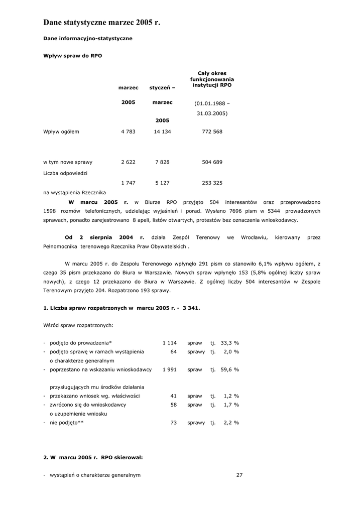 Dane statystyczne marzec 2005 r. Dane informacyjno-statystyczne Wpływ spraw do RPO marzec styczeń – 2005 marzec Cały okres funkcjonowania instytucji RPO (01.01.1988 – 31.03.2005) 2005 Wpływ ogółem 4 783 14 134 772 568 w tym nowe sprawy 2 622 7 828 504 689 1 747 5 127 253 325 Liczba odpowiedzi na wystąpienia Rzecznika W 1598 marcu rozmów 2005 r. w Biurze RPO przyjęto 504 interesantów oraz przeprowadzono telefonicznych, udzielając wyjaśnień i porad. Wysłano 7696 pism w 5344 prowadzonych sprawach, ponadto zarejestrowano 8 apeli, listów otwartych, protestów bez oznaczenia wnioskodawcy. Od 2 sierpnia 2004 r. działa Zespół Terenowy we Wrocławiu, kierowany przez Pełnomocnika terenowego Rzecznika Praw Obywatelskich . W marcu 2005 r. do Zespołu Terenowego wpłynęło 291 pism co stanowiło 6,1% wpływu ogółem, z czego 35 pism przekazano do Biura w Warszawie. Nowych spraw wpłynęło 153 (5,8% ogólnej liczby spraw nowych), z czego 12 przekazano do Biura w Warszawie. Z ogólnej liczby 504 interesantów w Zespole Terenowym przyjęto 204. Rozpatrzono 193 sprawy. 1. Liczba spraw rozpatrzonych w marcu 2005 r. - 3 341. Wśród spraw rozpatrzonych: - podjęto do prowadzenia* spraw tj. 33,3 % sprawy tj. 1 991 spraw tj. 59,6 % - przekazano wniosek wg. właściwości 41 spraw tj. 1,2 % - zwrócono się do wnioskodawcy 58 spraw tj. 1,7 % 73 sprawy tj. 2,2 % - podjęto sprawę w ramach wystąpienia 1 114 64 2,0 % o charakterze generalnym - poprzestano na wskazaniu wnioskodawcy przysługujących mu środków działania o uzupełnienie wniosku - nie podjęto** 2. W marcu 2005 r. RPO skierował: - wystąpień o charakterze generalnym 27 - kasacji - wniosków do Trybunału Konstytucyjnego o stwierdzenie niezgodności przepisów z Konstytucją - skarg do Wojewódzkich Sądów Administracyjnych 12 3 1 3. Zakończono postępowanie w 1 333 podjętych sprawach: a) uzyskano rozwiązanie pozytywne b) odstąpiono od dalszego prowadzenia 17,0 % tj. 226 spraw 8,2 % tj. 109 spraw sprawa sprawy ze względu na: - toczące się w sprawie postępowanie (niewyczerpany tryb) - nieodwracalne skutki prawne 0,1 % tj. 1 - inne względy obiektywne 7,1 % tj. 95 spraw c) nie uzyskano rozwiązania pozytywnego ze 65,6 % tj. 875 spraw względu na: - niepotwierdzenie się zarzutu - nieuwzględnienie wystąpienia RPO 1,6 % tj. 22 - z powodu wyczerpania przez RPO 0,4 % tj. 5 sprawy spraw możliwości działania 4. Przedmiot nowych spraw w marcu 2005 r. (według właściwości zespołów merytorycznych): prawo konstytucyjne i międzynarodowe 2,7 % tj. 72 sprawy prawo karne 24,3 % tj. 636 spraw zabezpieczenie społeczne 15,8 % tj. 415 spraw prawo cywilne i gospodarka nieruchomościami 12,2 % tj. 320 spraw prawo administracyjne i sprawy mieszkaniowe 9,9 % tj. 259 spraw 10,5 % tj. 275 spraw prawo karne wykonawcze 6,8 % tj. 179 spraw prawo pracy 5,8 % tj. 151 spraw prawa żołnierzy , funkcjonariuszy służb 2,3 % tj. 61 spraw 5,0 % tj. 131 spraw 3,8 % tj. 99 spraw 0,9 % tj. 24 sprawy prawo gospodarcze, daniny publiczne i ochrona praw konsumenta publicznych administracja publiczna, zdrowie i ochrona praw cudzoziemców prawo rodzinne i ochrona praw osób niepełnosprawnych Inne *) Pojęcie "sprawy podjętej do prowadzenia" dotyczy spraw wskazujących na możliwe istnienie naruszenia praw obywatelskich, w sprawach tych Rzecznik prowadzi postępowanie wyjaśniające. **) Przekazane Rzecznikowi do wiadomości wystąpienia kierowane do innych organów i pisma niezrozumiałej treści. ***) W związku ze zmianą struktury organizacyjnej Biura RPO Zespół ochrony zdrowia został połączony z Zespołem administracji publicznej.