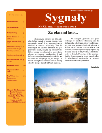 www.zspmilakowo.pl www.zspmilakowo.pl W TYM NUMERZE: 11 Za oknami lato... Letnie widoczki 2 wi to Szko y 3 Dzie Dziecka w Konkurs wiedzy bibliotece 34 Dzie J zyków ObKo a Przyjació cych 5 o lesie Natury - ich W wietlicy ka dy na 6 dzia alno pomoc mo e liczy ... Nowiny, nowinki... 47 Rajd ekologicz- ny Nowiny, nowinki c.d. 8 Szkolna lista 5 Sta i Nel ostatni raz 9 przebojów w roku Recenzja gry W wiecie bajek Recenzja ksi ki W gronie rodzinnym... Recenzja gry komputerowej Czy Wiesz, e... Recenzja gry – Zas yszane.. ci g dalszy Pods uchane... Odrobin humoru. Patron na weso o 10 - 6 11 7 812 Zespó Redakcyjny: 9 Beata Sekular Renata Jasiak Natalia, Asia, Ala Darek Nasz e-mail: [email protected] Sygna yy Sygna Nr XLNrmaj – czerwiec VIII Wrzesie 2014 -Pa dziernik 2007 Za oknami lato... Za naszymi oknami ju lato, ciee s ce wysy a w nasz stron swoje promienie, a my? A my musimy jeszcze siedzie w klasach i uczy si . Cho dla niektórych to ostatni dzwonek na poprawianie ocen, znajd si szcz liwcy, którzy mog bez skrupu ów korzysta z ciep a, wycieczek, weekendów i dni, które wymagaj obecno ci w szkole, ale w które nie odbywaj si ju lekcje.. A takich dni by o w ostatnim czasie troch , cho by wi to Szko y i Dzie Dziecka. W naszych g owach ju tylko wakacje, w my lach odliczamy dni do ko ca roku szkolnego, tak wyczekiwanego. Ale czy wszyscy b si cieszy z ko ca roku? Mowa tu o uczniach klas trzecich, którzy zapewne b egna si z nasz szko ze w oku, a mo e nawet i w dwóch. Pozostaje tylko mie nadziej , e opuszczaj c progi naszej szkoy absolwenci zachowaj w sercach mnóstwo mi ych wspomnie . Redakcja ROZMAITO CI STR. 2 Letnie widoczki Hej! Jestem Gotenks Czas zaprezentowa Wam letnie pejza e. Darek CO S YCHA W SZKOLE STR. 3 wi to Szko y 18 maja obchodzili my dziesi rocznic nadania naszej szkole imienia, ju wi tego, Jana Paw a II. Uroczysto rozpocz a si Msz wi w Ko ciele wi tej El biety. Nast pnie na hali pani Dyrektor oraz zaproszeni go cie wyg osili przemówienia na temat tego wa nego dla nas wydarzenia. Uczniowie gimnazjum przedstawili spektakl przygotowany pod kierunkiem pani Urszuli Kuchnio i pani Doroty Melnyk. Odby o si wr czenie statuetek „Totus” - w gronie zwyci zców znale li si : Weron ika Kipiel, Emilia Paj k, Zu zan n a Filipowicz, Gabriel ukasik, Zuzanna Paj k, Pawe Wo niak, Bartosz Pietrasik, Piotr Wo niak, Aleksandra Stefanowska, Zuzanna Miloch, Magdalena Milczanowska, Patrycja Wierzba , Katarzyna Cichosz, Aleksandra Turemko, Barbara Bertel oraz uczniowie z gimnazjum: Aleksandra Miazga, Julia Sekua, Anna Wo oszczuk, Arkadiusz Korgul, Izabela Górska, Natalia Oniszk, Katarzyna Kwiatek i Rados aw wiek. Wr czono równie certyfikaty laureatów i finalistów konkursów przedmiotowych dla uczniów gimnazjum: Asi Grabowskiej, Alicji Maj, Rados awa wieka, Przemka Krysiaka, Natalii Piórkowskiej, Dominiki Maria skiej oraz Micha a Achci skiego. Podczas obchodów mogli my podziwia wyst py wokalne uczniów szko y podstawowej i gimnazjum, pokazy taneczne uczniów szko y podstawowej oraz wyst py taneczne przedszkolaków. Ala CO S YCHA W SZKOLE STR. 4 Dzie Dziecka w bibliotece W bibliotece, jak co roku, staramy si przygotowa jaatrakcj na obchody Dnia Dziecka. W tym roku by o to przedstawienie ,,Pinokio”, w którym wzi y udzia uczennice klas 3 gimnazjum: Ala Maj, Klaudia Kwa nik, Asia Jawelska, Daria Czeszkiewicz i Natalia Piórkowska. Zosta o ono oparte na motywach znanej ba ni, której autorem - jak wiemy - jest Carlo Collodi.. Gimnazjalistki z drugiej klasy wykona y przepi kn scenografi , dope niaj tre przedstawienia. Uczennice gimnazjum przygotowywa y si do inscenizacji sumiennie pod okiem pa bibliotekarek: p. Renaty Jasiak i p. Beaty Sekular- sprawnie operuj c kukie kami, prezentuj cymi poszczególnych bohaterów ba ni ,,Pinokio” - znanej zapewne szerokiemu gronu czytelników. Ba ta w interpretacji naszych aktorek zawiera a przeanie mówi ce o o tym, i nie nale y s ucha ych doradców, którzy wykorzystuj c dziecka naiwno , chc realizowa swoje egoistyczne cele i odci gaj je od obowi zków, takich jak cho by chodzenie do szko y i przyswajanie potrzebnej wiedzy. Mora ba ni doskonale odgadli widzowie w osobach przedszkolaków oraz uczniów klas pierwszych SP. Po inscenizacji odby a si krótka rozmowa z publiczno ci , która nagrodzi a swoje starsze kole anki gromkimi brawami. Redakcja Nasza publiczno - przedszkolaki i uczniowie klas pierwszych CO S YCHA W SZKOLE STR. 5 Dzie j zyków obcych Na pocz tku czerwca w naszej szkole odby si po raz trzeci Dzie J zyków Obcych w gimnazjum. W tym roku tematem przewodnim bya ,,Muzyka, Kultura, Sztuka , Literatura i Nauka w krajach Europy”. W ród wybranych pa stw znalaz y si : Niemcy, Anglia, Czechy, Ukraina, Hiszpania, Mo dawia, Grecja, Austria, Norwegia oraz W ochy. Uczniowie naszego gimnazjum przygotowali plakaty w dwóch j zykach - angielskim i niemieckim, zawieraj ce informacje o danym kraju. Dla pozosta ych uczniów zosta y przygotowane karty pracy z pytaniami oraz quiz muzyczny. Przez pierwsz godzin rozwi zywano zadania, a na nast pnej prowadz cy sprawdzali poprawno odpowiedzi. Dzie j zyków umo liwi uczniom zdobywanie wiedzy krajoznawczej i kulturoznawczej oraz sprawdzenie i rozwijanie swoich umiej tno ci j zykowych w inny ni na lekcjach sposób. K. K. Rajdowe atrakcje W niedziel 8 czerwca 2014 r. Parafialny oddzia Akcji Katolickiej w Mi akowie po raz trzeci zorganizowa Rodzinny Raj Rowerowy. W tym roku w rajdzie wzi o udzia 176 osób, które spotka y si o godz. 10:30 na Mszy w. rodzinnej, podczas której otrzymali numery startowe oraz zapoznali si z zasadami bezpiecznego zachowania na trasie. Rajdowcy mieli do pokonania 6,5 km a na mecie przy ul. Dworcowej czeka na wszystkich pocz stunek oraz gry i zabawy, których g ównym bohaterem by Jan Pawe II. By o wiele rado ci i dzi ki wsparciu przedsi wzi cia przez Urz d Miasta i Gminy przyznane zosta y statuetki ,,Wzorowa Rodzina Rowerowa, ,,Wzorowe Ma stwo rowerowe” oraz ,,Najliczniejsza Rodz