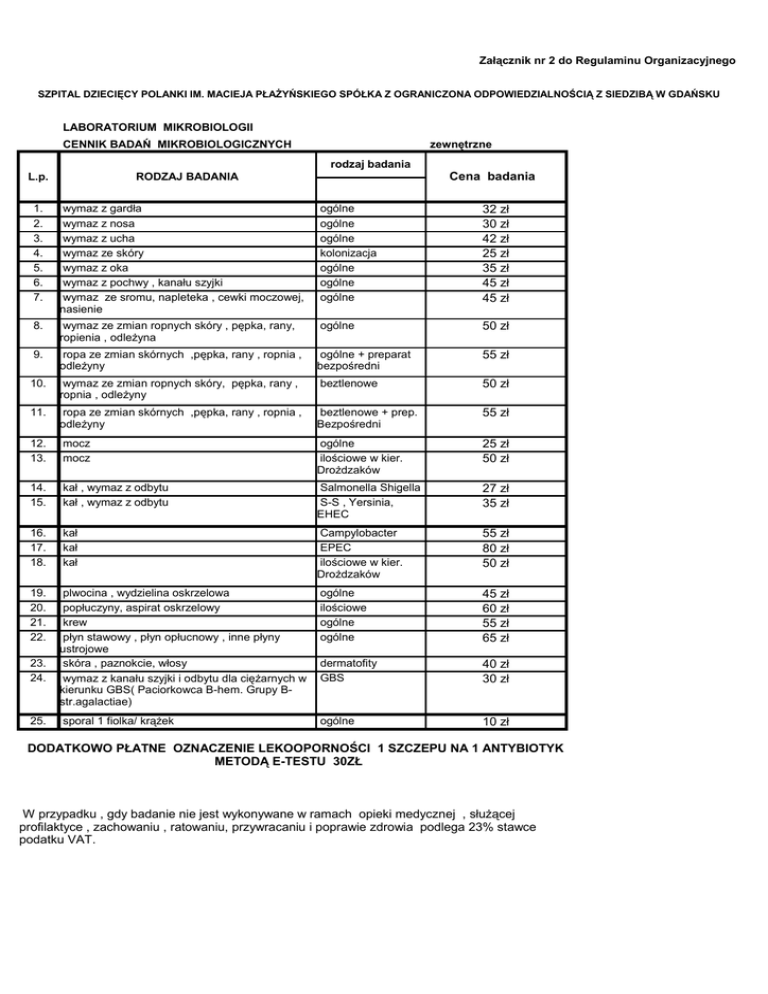 Załącznik nr 2 do Regulaminu Organizacyjnego SZPITAL DZIECIĘCY POLANKI IM. MACIEJA PŁAŻYŃSKIEGO SPÓŁKA Z OGRANICZONA ODPOWIEDZIALNOŚCIĄ Z SIEDZIBĄ W GDAŃSKU LABORATORIUM MIKROBIOLOGII CENNIK BADAŃ MIKROBIOLOGICZNYCH zewnętrzne rodzaj badania L.p. RODZAJ BADANIA Cena badania 1. 2. 3. 4. 5. 6. 7. wymaz z gardła wymaz z nosa wymaz z ucha wymaz ze skóry wymaz z oka wymaz z pochwy , kanału szyjki wymaz ze sromu, napleteka , cewki moczowej, nasienie ogólne ogólne ogólne kolonizacja ogólne ogólne ogólne 32 zł 30 zł 42 zł 25 zł 35 zł 45 zł 45 zł 8. wymaz ze zmian ropnych skóry , pępka, rany, ropienia , odleżyna ogólne 50 zł 9. ropa ze zmian skórnych ,pępka, rany , ropnia , odleżyny ogólne + preparat bezpośredni 55 zł 10. wymaz ze zmian ropnych skóry, pępka, rany , ropnia , odleżyny beztlenowe 50 zł 11. ropa ze zmian skórnych ,pępka, rany , ropnia , odleżyny beztlenowe + prep. Bezpośredni 55 zł 12. 13. mocz mocz ogólne ilościowe w kier. Drożdzaków 25 zł 50 zł 14. 15. kał , wymaz z odbytu kał , wymaz z odbytu Salmonella Shigella S-S , Yersinia, EHEC 27 zł 35 zł 16. 17. 18. kał kał kał Campylobacter EPEC ilościowe w kier. Drożdzaków 55 zł 80 zł 50 zł 19. 20. 21. 22. plwocina , wydzielina oskrzelowa popłuczyny, aspirat oskrzelowy krew płyn stawowy , płyn opłucnowy , inne płyny ustrojowe skóra , paznokcie, włosy wymaz z kanału szyjki i odbytu dla ciężarnych w kierunku GBS( Paciorkowca B-hem. Grupy Bstr.agalactiae) ogólne ilościowe ogólne ogólne 45 zł 60 zł 55 zł 65 zł dermatofity GBS 40 zł 30 zł sporal 1 fiolka/ krążek ogólne 10 zł 23. 24. 25. DODATKOWO PŁATNE OZNACZENIE LEKOOPORNOŚCI 1 SZCZEPU NA 1 ANTYBIOTYK METODĄ E-TESTU 30ZŁ W przypadku , gdy badanie nie jest wykonywane w ramach opieki medycznej , służącej profilaktyce , zachowaniu , ratowaniu, przywracaniu i poprawie zdrowia podlega 23% stawce podatku VAT. Załącznik nr 2 do Regulaminu Organizacyjnego SZPITAL DZIECIĘCY POLANKI IM. MACIEJA PŁAŻYŃSKIEGO SPÓŁKA Z OGRANICZONĄ ODPOWIEDZIALNOŚCIĄ Z SIEDZIBĄ W GDAŃSKU LABORATORIUM BAKTERIOLOGII CENNIK BADAŃ SEROLOGICZNYCH L.p. obowiązuje od 01.05.2008r. zewnętrzne RODZAJ BADANIA Cena za 1 badanie I 5. INFEKCJE DRÓG ODDECHOWYCH (atypowe): Przeciwciała anty Chlamydia trachomatis: IgG 48 zł IgM 48 zł IgA 48 zł Przeciwciała anty Chlamydia pneumoniae: IgG 52 zł IgM 52 zł IgA 52 zł Przeciwciała anty Krztuścowe (Bordetella pertusis): IgG 50 zł IgM 50 zł IgA 50 zł Przeciwciała anty Mycoplasma pneumoniae: IgG 40 zł IgM 40 zł IgA 40 zł RSV (Respiratory Syncytial Virus) – wykrywanie antygenu wirusa 35 zł 6. Streptococcus pneumoniae 66 zł Legionella pneumophilia 62 zł 1. 2. 3. 4. 7. II Czas oczekiwania INFEKCJE PRZEWODU POKARMOWEGO: 30 zł Materiał diagnostyczny na wynik Do 3 dni Surowica Do 3 dni Surowica Do 3 dni Surowica Do 3 dni Surowica 20 min. Wydzielina nosowogardłowa 1 godz. mocz 1 godz. mocz 1. Rota - Adenovirus 1godz. kał 2. Clostridium difficile toksyna A i B 46 zł 1godz. kał 3. Helicobakter pylori - antygen 35 zł 1godz. kał 4. Lamblia (Giargia) intestinalis, antygen 30 zł 1godz. kał 45 zł 45 zł 45 zł Do 3 dni Surowica Do 7 dni Surowica Yersinia enterocolitica przeciwciała IgG IgM IgA 5. III INNE Cytomegalia ( CMV ) Przeciwciała IgG IgM 1. Test awidności IgA 2. 3. 4. 5. 6. 7. 8. 9. 10. Mononukleoza zakaźna (EBV):Przeciwciała IgG anty EBNA IgM anty VCA Przeciwciała heterofilne IgM (Odczyn Paula-Bunnela) Borrelia Burgdoferii:Przeciwciała IgG IgM Toksoplazmoza: Przeciwciała IgG IgM IgA Test awidności IgG Przeciwciała anty Parvovirus B19 IgG IgM Chlamydia trachomatis -antygen Chlamydia trachomatis -antygen realizacja czasowo zawieszona 50 zł 50 zł 30 zł Do 7 dni 45 zł 45 zł Do 7 dni Surowica Do 7 dni Surowica Surowica 1godz. realizacja czasowo zawieszona 70 zł 70 zł 38 zł 38 zł Do 5 dni Surowica 1 godz. mocz 2 godz. wymaz z kan. Szyjki Borrelioza IgM test potwierdzenia Wester Blot Borrelioza IgG test potwierdzenia Wester Blot Witamina D3 aktywna u dzieci i dorosłych realizacja czasowo zawieszona 75 zł do 7 dni Surowica Badania zlecone w trybie pilnym; cito - cena badania wyższa o 100% . Warunkiem wykonania badania w trybie pilnym; cito - jest jednoznaczne oznaczenie na skierowaniu. Do oznaczenia 1 klasy przeciwciał potrzeba 0,5 ml krwi pobranej na skrzep lub 50 μl surowicy Przeciwciała są oznaczane metodą immunoenzymatyczną ( ELISA ) W przypadku , gdy badanie nie jest wykonywane w ramach opieki medycznej, służącej profilaktyce, zachowaniu, ratowaniu, przywracaniu i poprawie zdrowia podlega 23% stawce podatku VAT. Z dniem 21.08.2013 r. decyzją Dyrektora Przedsiębiorstw Spółki czasowo zawiesza się realizację zaznaczonych badań Załącznik nr 2 do Regulaminu Organizacyjnego SZPITAL DZIECIĘCY POLANKI IM. MACIEJA PŁAŻYŃSKIEGO SPÓŁKA Z OGRANICZONĄ ODPOWIEDZIALNOŚCIĄ Z SIEDZIBĄ W GDAŃSKU LABORATORIUM MIKROBIOLOGII CENNIK PODŁOŻA L.p. RODZAJ BADANIA zewnętrzne cena jednostkowa brutto 1. Pojemnik do moczu ropy , plwociny z etykieta 1,00 zł 2. Pojemnik do kału z łopatką 1,00 zł 2,00 zł 4. Pojemnik do kału z łopatką i Podłożem transportowym Cary -Blaira wymazówka 5. wymazówka z podłożem transportowym 2,00 zł 6. wymazówka do oka z podłożem transportowym 2,00 zł 8. podłoże Portagerm Amiesm ( podłoże transp.dla beztlenowców ) 2,00 zł 9. podłoże Port F ( podłoże transp.dla beztlenowców ) 10,00 zł 10. podłoże Bactec 20,00 zł 11. podłoże Hemomedium tlenowe 10,00 zł 12. podłoże Hemomedium beztlenowe 10,00 zł 13. podłoże Uromedium 4,00 zł 14. podłoże transportowo-wzrostowe dla Dermatofitów ( Dermagon ) 7,00 zł 15. sporal A -48h (1 fiolka) 8,00 zł 16. sporal S ( 4 krążki) 20,00 zł 3. 1,00 zł