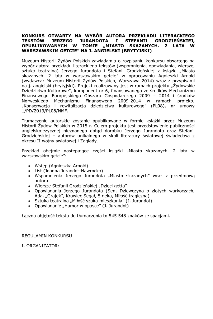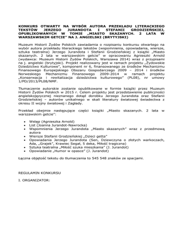 KONKURS OTWARTY NA WYBÓR AUTORA PRZEKŁADU LITERACKIEGO TEKSTÓW JERZEGO JURANDOTA I STEFANII GRODZIEŃSKIEJ, OPUBLIKOWANYCH W TOMIE „MIASTO SKAZANYCH. 2 LATA W WARSZAWSKIM GETCIE” NA J. ANGIELSKI (BRYTYJSKI) Muzeum Historii Żydów Polskich zawiadamia o rozpisaniu konkursu otwartego na wybór autora przekładu literackiego tekstów (wspomnienia, opowiadania, wiersze, sztuka teatralna) Jerzego Jurandota i Stefanii Grodzieńskiej z książki „Miasto skazanych. 2 lata w warszawskim getcie” w opracowaniu Agnieszki Arnold (wydawca: Muzeum Historii Żydów Polskich, Warszawa 2014) wraz z przypisami na j. angielski (brytyjski). Projekt realizowany jest w ramach projektu „Żydowskie Dziedzictwo Kulturowe”, komponent nr 6, finansowanego ze środków Mechanizmu Finansowego Europejskiego Obszaru Gospodarczego 2009 – 2014 i środków Norweskiego Mechanizmu Finansowego 2009-2014 w ramach projektu „Konserwacja i rewitalizacja dziedzictwa kulturowego” (PL08), nr umowy 1/PD/2013/PL08/NMF. Tłumaczenie autorskie zostanie opublikowane w formie książki przez Muzeum Historii Żydów Polskich w 2015 r. Celem projektu jest przedstawienie publiczności angielskojęzycznej nieznanego dotąd dorobku Jerzego Jurandota oraz Stefanii Grodzieńskiej – autorów unikalnego w skali literatury światowej świadectwa z okresu II wojny światowej i Zagłady. Przekład obejmie następujące części książki „Miasto skazanych. 2 lata w warszawskim getcie”: Wstęp (Agnieszka Arnold) List (Joanna Jurandot-Nawrocka) Wspomnienia Jerzego Jurandota „Miasto skazanych” wraz z przedmową autora Wiersze Stefanii Grodzieńskiej „Dzieci getta” Opowiadania Jerzego Jurandota (Sen, Dziewczyna o złotych warkoczach, Ada, „Grajek”, Krawiec Segał, 5 deka, Miłość tragiczna) Sztuka teatralna „Miłość szuka mieszkania” (J. Jurandot) Opowiadanie „Humor w opasce” (J. Jurandot) Łączna objętość tekstu do tłumaczenia to 545 548 znaków ze spacjami. REGULAMIN KONKURSU I. ORGANIZATOR: Muzeum Historii Żydów Polskich, z siedzibą w Warszawie, ul. Anielewicza 6, 00157 Warszawa. II. TERMIN TRWANIA KONKURSU: Konkurs rozpoczyna się z dniem 28 marca 2014 roku i trwa do dnia 4 kwietnia 2014 roku. III. PRZEDMIOT KONKURSU Przedmiotem konkursu jest wyłonienie tłumacza, który dokona wymienionych powyżej tekstów literackich na j. angielski (brytyjski). przekładu Tłumaczenie powinno odpowiadać najwyższym standardom językowym i literackim oraz być zgodne z oryginałem. Powinno zostać wykonane ze starannością i nadawać się do opublikowania przy jedynie stosunkowo niewielkich zabiegach redaktorskich (we współpracy z redaktorem prowadzącym) i korektorskich. Rażące bądź podstawowe błędy gramatyczne, stylistyczne, terminologiczne lub związane z brakiem zgodności z oryginałem będą podstawą do odrzucenia pracy konkursowej. IV. ZASADY KONKURSU 1. Konkurs ma charakter otwarty, jednoetapowy. 2. Wymagania uczestnictwa w konkursie: a) konkurs adresowany jest do tłumaczy j. angielskiego. b) tłumaczenia można zgłaszać indywidualnie (1 tłumacz) lub zespołowo (2 tłumaczy lub tłumacz + weryfikator lub 2 tłumaczy + weryfikator). Nazwisko każdej z osób biorących udział w tłumaczeniu zostanie wymienione na stronie redakcyjnej publikacji. Nazwisko tłumacza/tłumaczy zostanie również wymienione na stronie tytułowej. c) przynajmniej jeden z tłumaczy powinien posiadać udokumentowane doświadczenie w tłumaczeniu tekstów literackich oraz tekstów dotyczących historii lub kultury żydowskiej. W przypadku zespołów liczących 2 tłumaczy, dopuszczalne jest posiadanie przez jednego tłumacza doświadczenia w zakresie tłumaczenia tekstów literackich, a przez drugiego doświadczenia w zakresie tłumaczenia tekstów o tematyce związanej z historią lub kulturą żydowską. d) konkurs przeznaczony jest dla osób pełnoletnich. e) w konkursie nie mogą brać udziału pracownicy Organizatora oraz członkowie Jury Konkursowego, a także członkowie ich najbliższych rodzin. 3. Aby wziąć udział w konkursie należy dostarczyć: a) tłumaczenie na j. angielski (brytyjski) 3 próbek z książki „Miasto skazanych. 2 lata w warszawskim getcie”, stanowiących załącznik do niniejszego regulaminu, w formie elektronicznej (w formacie .doc oraz .pdf), b) kalkulację kosztów (brutto) realizacji całości przekładu, c) oświadczenie o posiadanym wymaganym doświadczeniu, określonym w pkt. 2 c; wymaga się wymienienia tytułów zrealizowanych tłumaczeń/publikacji. 4. Uczestnictwo w konkursie oznacza zaakceptowanie wymienionych w regulaminie zasad i warunków. przez uczestnika 5. Prace konkursowe ocenia Jury, w którego skład wchodzą: Dominika Gajewska – redaktor prowadzący publikacji, Dział Informacji i Projektów Naukowych MHŻP Magdalena Prokopowicz, redaktor, Dział Informacji i Projektów Naukowych MHŻP Eric Silberman, Dział Edukacji MHŻP 6. Jury w ocenie nadesłanych prac weźmie pod uwagę m.in.: a) Poprawność językową tekstu docelowego (w tym gramatyczną, stylistyczną i terminologiczną) – pkt 1-10; b) Zgodność z oryginałem – pkt 1-10; c) Walory literackie tekstu docelowego – pkt 1-5; d) Cenę – pkt 1-5. 7. Wygrywa zgłoszenie z najwyższą punktacją przyznaną przez Jury – zwane dalej „Tłumaczeniem”. 8. Jury ma prawo uznać konkurs za nierozstrzygnięty. 9. Od werdyktu Jury nie ma odwołania. 10. W przypadku braku akceptacji Tłumaczenia przez Dyrektora Muzeum Historii Żydów Polskich, Jury unieważnia konkurs. 11. Niezwłocznie po zatwierdzeniu Tłumaczenia przez Dyrektora Muzeum Historii Żydów Polskich organizator zawrze z autorem Tłumaczenia umowę o dzieło. 12. Autor/autorzy przekładu zachowują prawa autorskie do dzieła. 13. Udział w konkursie i jego wygrana zobowiązuje autora do realizacji przekładu publikacji we wskazanym terminie (patrz załącznik „Harmonogram prac”). 13. W trakcie realizacji przekładu, redaktor pr