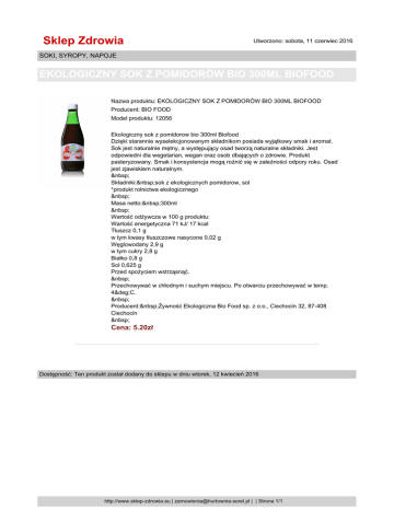 Sklep Zdrowia Utworzono: sobota, 11 czerwiec 2016 SOKI, SYROPY, NAPOJE EKOLOGICZNY SOK Z POMIDORÓW BIO 300ML BIOFOOD Nazwa produktu: EKOLOGICZNY SOK Z POMIDORÓW BIO 300ML BIOFOOD Producent: BIO FOOD Model produktu: 12056 Ekologiczny sok z pomidorow bio 300ml Biofood Dzięki starannie wyselekcjonowanym składnikom posiada wyjątkowy smak i aromat. Sok jest naturalnie mętny, a występujący osad tworzą naturalne składniki. Jest odpowiedni dla wegetarian, wegan oraz osob dbających o zdrowie. Produkt pasteryzowany. Smak i konsystencja mogą rożnić się w zależności odpory roku. Osad jest zjawiskiem naturalnym. Składniki: sok z ekologicznych pomidorow, sol *produkt rolnictwa ekologicznego Masa netto: 300ml Wartość odżywcza w 100 g produktu: Wartość energetyczna 71 kJ/ 17 kcal Tłuszcz 0,1 g w tym kwasy tłuszczowe nasycone 0,02 g Węglowodany 2,9 g w tym cukry 2,8 g Białko 0,8 g Sol 0,625 g Przed spożyciem wstrząsnąć. Przechowywać w chłodnym i suchym miejscu. Po otwarciu przechowywać w temp. 4°C. Producent: Żywność Ekologiczna Bio Food sp. z o.o., Ciechocin 32, 87-408 Ciechocin Cena: 5.20zł Dostępność: Ten produkt został dodany do sklepu w dniu wtorek, 12 kwiecień 2016 http://www.sklep-zdrowia.eu | [email protected] | | Strona 1/1