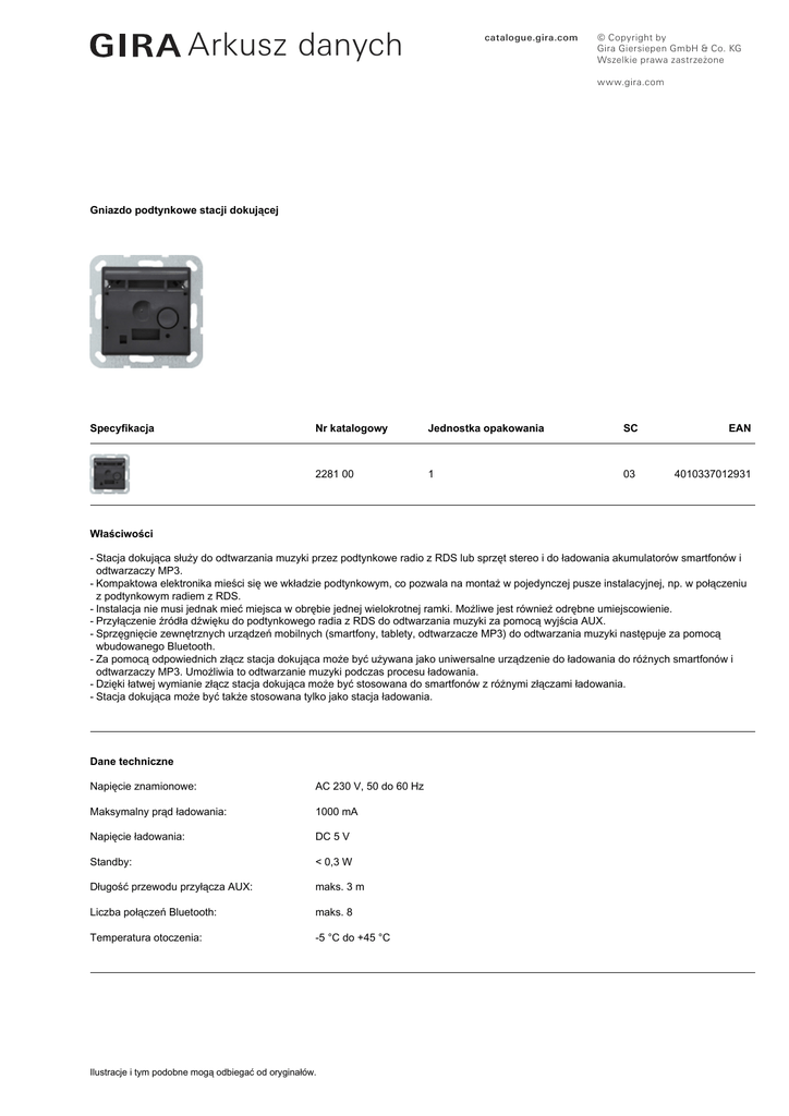 Arkusz danychń catalogue.gira.com © Copyright by Gira Giersiepen GmbH & Co. KG Wszelkie prawa zastrzeżone www.gira.com Gniazdo podtynkowe stacji dokującej Specyfikacja Nr katalogowy Jednostka opakowania SC EAN 2281 00 1 03 4010337012931 Właściwości - Stacja dokująca służy do odtwarzania muzyki przez podtynkowe radio z RDS lub sprzęt stereo i do ładowania akumulatorów smartfonów i odtwarzaczy MP3. - Kompaktowa elektronika mieści się we wkładzie podtynkowym, co pozwala na montaż w pojedynczej pusze instalacyjnej, np. w połączeniu z podtynkowym radiem z RDS. - Instalacja nie musi jednak mieć miejsca w obrębie jednej wielokrotnej ramki. Możliwe jest również odrębne umiejscowienie. - Przyłączenie źródła dźwięku do podtynkowego radia z RDS do odtwarzania muzyki za pomocą wyjścia AUX. - Sprzęgnięcie zewnętrznych urządzeń mobilnych (smartfony, tablety, odtwarzacze MP3) do odtwarzania muzyki następuje za pomocą wbudowanego Bluetooth. - Za pomocą odpowiednich złącz stacja dokująca może być używana jako uniwersalne urządzenie do ładowania do różnych smartfonów i odtwarzaczy MP3. Umożliwia to odtwarzanie muzyki podczas procesu ładowania. - Dzięki łatwej wymianie złącz stacja dokująca może być stosowana do smartfonów z różnymi złączami ładowania. - Stacja dokująca może być także stosowana tylko jako stacja ładowania. Dane techniczne Napięcie znamionowe: AC 230 V, 50 do 60 Hz Maksymalny prąd ładowania: 1000 mA Napięcie ładowania: DC 5 V Standby: < 0,3 W Długość przewodu przyłącza AUX: maks. 3 m Liczba połączeń Bluetooth: maks. 8 Temperatura otoczenia: -5 °C do +45 °C Ilustracje i tym podobne mogą odbiegać od oryginałów.