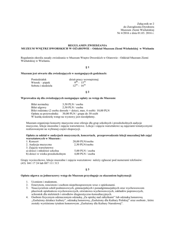 Załącznik nr 2 do Zarządzenia Dyrektora Muzeum Ziemi Wieluńskiej Nr 4/2016 z dnia 01.03. 2016 r. REGULAMIN ZWIEDZANIA MUZEUM WNĘTRZ DWORSKICH W OŻAROWIE – Oddział Muzeum Ziemi Wieluńskiej w Wieluniu Regulamin określa zasady zwiedzania w Muzeum Wnętrz Dworskich w Ożarowie - Oddział Muzeum Ziemi Wieluńskiej w Wieluniu. §1 Muzeum jest otwarte dla zwiedzających w następujących godzinach: Poniedziałek Wtorek – piątek Sobota i niedziela dzień pracy wewnętrznej 900 - 1530 1200 - 1630 §2 Wprowadza się dla zwiedzających następujące opłaty za wstęp do Muzeum: Bilet normalny 3,50 PLN / osoba Bilet ulgowy 2,50 PLN / osoba Bilet rodzinny (2 osoby dorosłe + dzieci, max. 6 osób) 10,00 PLN Opłata za przewodnika 30,00 PLN / grupa do 30 osób W każdą niedzielę wstęp na wystawy jest nieodpłatny. Muzeum organizuje koncerty muzyczne oraz oferuje dla grup szkolnych i przedszkolnych audycje muzyczne, lekcje muzealne i zajęcia warsztatowe. Lekcje i zajęcia warsztatowe są zajęciami tematycznymi realizowanymi na wybranej części ekspozycji. Opłata za udział w audycjach muzycznych, koncertach, przeprowadzenie lekcji muzealnej lub zajęć warsztatowych w Muzeum : 1. Koncert 20,00 PLN/osoba 2. Audycja muzyczna 2,50 PLN/osoba 3. Zajęcia warsztatowe: a) dzieci i młodzież szkolna 5,00 PLN / osoba b) dzieci w wieku przedszkolnym 4,00 PLN / osoba Grupy wycieczkowe, lekcje muzealne i zajęcia warsztatowe należy zgłaszać pod numerami telefonów: (43) 841 17 24 lub 887 111 313 §3 Opłata ulgowa za jednorazowy wstęp do Muzeum przysługuje za okazaniem legitymacji: 1. 2. 3. 4. Uczniom i studentom. Emerytom, rencistom i osobom niepełnosprawnym wraz z opiekunami. Nauczycielom szkół podstawowych, gimnazjalnych i ponadgimnazjalnych oraz wychowawcom placówek opiekuńczo-wychowawczych, oświatowo-wychowawczych, zakładów poprawczych, schronisk dla nieletnich i ośrodków diagnostyczno-konsultacyjnych. Osobom fizycznym odznaczonym odznaką „Za opiekę nad zabytkami” lub odznaką honorową „Zasłużony działacz kultury”, odznaką honorową „Zasłużony dla Kultury Polskiej” oraz osobom , które zostały wyróżnione tytułem honorowym „Zasłużony dla Kultury Narodowej”. §4 Wstęp bezpłatny do Muzeum przysługuje za okazaniem legitymacji: 1. 2. 3. 4. 5. 6. Osobom fizycznym odznaczonym Orderem Orła Białego, Orderem Wojennym Virtuti Militari, Orderem Zasługi Rzeczypospolitej Polskiej, medalem „Zasłużony Kulturze Gloria Artis. Pracownikom muzeów wpisanych do Państwowego Rejestru Muzeów. Członkom Międzynarodowej Rady Muzeów (ICOM) i Międzynarodowej Rady Ochrony Zabytków (ICOMOS). Posiadaczom Karty Polaka. Dzieciom objętym wychowaniem przedszkolnym. Opiekunom grup zorganizowanych lub nauczycielom (opiekunom) wycieczki szkolnej liczącej nie więcej niż 30 dzieci oraz przewodnikom przychodzącym razem z wycieczką. §5 Zasady fotografowania i filmowania: 1. 2. 3. 4. 5. Zwiedzający Muzeum mogą fotografować i filmować eksponaty, ekspozycje i wnętrza, o ile przedmiot fotografowany i filmowany lub cała wystawa czasowa nie zostały wyraźnie oznaczone stosownym zakazem. Fotografowanie i filmowanie w Muzeum jest możliwe pod warunkiem, że do tych celów nie używa się statywu i lampy błyskowej. Zastrzeżenie to nie dotyczy fotografowania i filmowania zewnętrznych elewacji budynku. Materiały wizualne uzyskane drogą fotografowania i filmowania nie mogą być publikowane i rozpowszechniane. Zasady fotografowania w celach komercyjnych określa oddzielne zarządzenie. W przypadku naruszenia zasad filmowania i fotografowania oraz korzystania z pozyskanego materiału w sposób niezgodny z niniejszym Regulaminem, Muzeum Ziemi Wieluńskiej dochodzić będzie swoich praw, włącznie z ewentualnym postępowaniem sądowym. §6 Muzeum jest objęte monitoringiem wizyjnym. W trosce o bezpieczeństwo zbiorów prosimy o dostosowanie się do następujących zasad: 1. Grupa zorganizowana wchodząca na ekspozycję nie może liczyć więcej niż 30 osób. 2. Zabrania się wstępu do Muzeum osobom nietrzeźwym lub zachowującym się w sposób, który zagraża bezpieczeństwu zbiorów, zakłóca porządek zwiedzania przez innych zwiedzających i narusza ogólnie przyjęte normy zachowania w miejscach publicznych. 3. Do sal ekspozycyjnych nie wolno wnosić i spożywać żywności oraz napojów. 4. Zabrania się palenia tytoniu i wyrobów tytoniowych oraz używania otwartego ognia na terenie Muzeum. 5. W Muzeum nie należy dotykać eksponatów, gablot muzealnych oraz wchodzić za bariery ochronne. 6. Zabrania się wprowadzania zwierząt na teren Muzeum. 7. Zwiedzający są zobowiązani do pozostawienia przy recepcji Muzeum płaszczy, dużych toreb, plecaków, parasoli, wózków dziecięcych i innych dużych przedmiotów. 8. Muzeum nie ponosi odpowiedzialności za pozostawione przedmioty, dokumenty i pieniądze. 9. Kasa muzealna zamykana jest na pół godziny przed zamknięciem Muzeum. Zamknięcie Muzeum oznacza moment, do którego osoby zwiedzające powinny opuścić siedzibę Muzeum, uwzględniając przy tym czas konieczny do odebrania odzieży i rzeczy przechowywanych przy recepcji. 10. Na ekspozycjach muzealnych obowiązuje zakaz rozmów przez telefon komórkowy oraz zakaz korzystania z innych urządzeń nadawczych. 12. Podczas zwiedzania należy stosować się do uwag i zaleceń obsługi Muzeum. §7 Wejście do Muzeum wiąże się jednoznacznie z akceptacją Regulaminu.