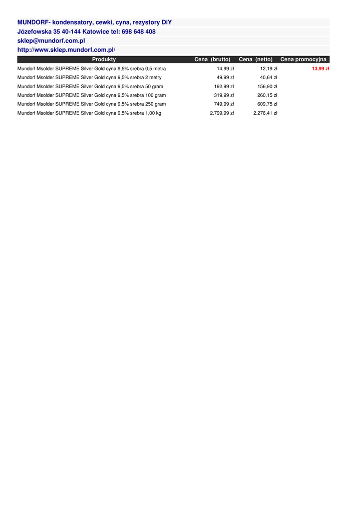 MUNDORF- kondensatory, cewki, cyna, rezystory DiY Józefowska 35 40-144 Katowice tel: 698 648 408 [email protected] http://www.sklep.mundorf.com.pl/ Produkty Cena (brutto) Cena (netto) Mundorf Msolder SUPREME Silver Gold cyna 9,5% srebra 0,5 metra 14,99 zł 12,19 zł Mundorf Msolder SUPREME Silver Gold cyna 9,5% srebra 2 metry 49,99 zł 40,64 zł Mundorf Msolder SUPREME Silver Gold cyna 9,5% srebra 50 gram 192,99 zł 156,90 zł Mundorf Msolder SUPREME Silver Gold cyna 9,5% srebra 100 gram 319,99 zł 260,15 zł Mundorf Msolder SUPREME Silver Gold cyna 9,5% srebra 250 gram 749,99 zł 609,75 zł 2.799,99 zł 2.276,41 zł Mundorf Msolder SUPREME Silver Gold cyna 9,5% srebra 1,00 kg Cena promocyjna 13,99 zł