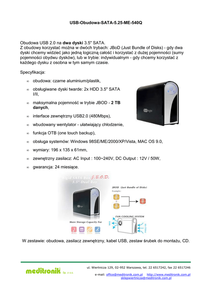 USB-Obudowa-SATA-5.25-ME-540Q Obudowa USB 2.0 na dwa dyski 3.5" SATA. Z obudowy korzystać moŜna w dwóch trybach: JBoD (Just Bundle of Disks) - gdy dwa dyski chcemy widzieć jako jedną logiczną całość i korzystać z duŜej pojemności (sumy pojemności obydwu dysków), lub w trybie: indywidualnym - gdy chcemy korzystać z kaŜdego dysku z osobna w tym samym czasie. Specyfikacja: • obudowa: czarne aluminium/plastik, • obsługiwane dyski twarde: 2x HDD 3.5" SATA I/II, • maksymalna pojemność w trybie JBOD - 2 TB danych, • interface zewnętrzny USB2.0 (480Mbps), • wbudowany wentylator - ułatwiający chłodzenie, • funkcja OTB (one touch backup), • obsługa systemów: Windows 98SE/ME/2000/XP/Vista, MAC OS 9.0, • wymiary: 196 x 135 x 61mm, • zewnętrzny zasilacz: AC Input : 100~240V, DC Output : 12V / 50W, • gwarancja: 24 miesiące. W zestawie: obudowa, zasilacz zewnętrzny, kabel USB, zestaw śrubek do montaŜu, CD. ul. Wiertnicza 129, 02-952 Warszawa, tel. 22 6517242, fax 22 6517246 e-mail: [email protected] http://www.meditronik.com.pl [email protected]