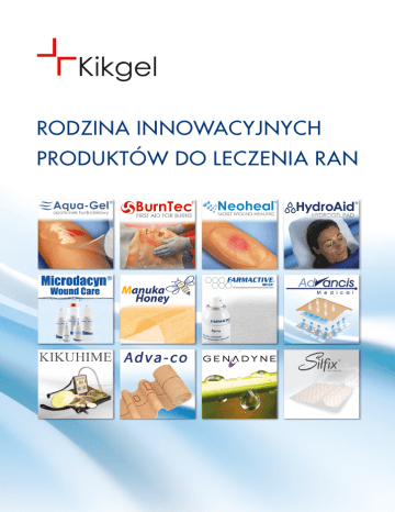 RODZINA INNOWACYJNYCH PRODUKTÓW DO LECZENIA RAN - Zapewnienie optymalnego, wigotnego środowiska w ranie - Autolityczne usunięcie tkanek martwiczych - Redukcja poziomu bakterii - Zabezpieczenie przed otarciami i zewnętrznymi zanieczyszczeniami - Utrzymywanie właściwej temperatury rany - Zapobieganie przywieraniu do nowo utworzonej tkanki - Pozostawienie rany bez niepotrzebnej ingerencji na tak długo, jak to możliwe Opatrunki z adhezyjną warstwą silikonową Silfix ® Nieurazowe adhezyjną, bezbolesną w wersji ochronne, opatrunki zawierające silikonową warstwę która zapewnia komfortową aplikację oraz zmianę. Opatrunki z warstwą Silfix występują absorpcyjnej i nieabsorpcyjnej, jako opatrunki mocujące, a także wspomagające leczenie blizn. Opatrunki do ran z wysiękiem oraz kompresjoterapia Innowacyjne rozwiązania zastosowane w tej grupie opatrunków zapewniają właściwą absorpcję nadmiaru wysięku, wspomagają usuwanie tkanki martwiczej oraz utrzymanie równowagi wilgoci. ® ® Aqua-Gel oraz BurnTec - opatrunki hydrożelowe Istotne jest także zapewnienie psychicznego komfortu pacjenta poprzez: - Minimalizację bólu i uczuleń w przypadku zmiany opatrunków - Osiąganie zadowalających wyników kosmetycznych po zagojeniu się rany Opatrunki Aqua-Gel oraz BurnTec są jedynymi opatrunkami specjalistycznymi produkowanymi w Polsce. Hydrożele zapewniają optymalne środowisko gojenia się ran, mogą uwadniać tkankę martwiczą, albo absorbować wysięk, są elastyczne, plastyczne, a ich zdejmowanie jest bezbolesne. Genadyne®- system do podciśnieniowej terapii ran Wyjątkowo skuteczna i mająca szerokie zastosowanie metoda oczyszczania ran, polegająca na wytworzeniu podciśnienia w łożysku rany. Urządzenie składa się ze sterowanej elektronicznie pompy ssącej oraz systemu opatrunków i drenów. Microdacyn®- roztwory i żele ponadtlenkowe o działaniu przeciwdrobnoustrojowym W celu uzyskania dalszych informacji prosimy o kontakt z firmą KIKGEL pod numerem telefonu: 44 719 23 40 a także polecamy sklep internetowy na stronach: www.kikgel.com.pl 2 Microdacyn® jest skutecznym i bezpiecznym produktem służącym do płukania ran ostrych i przewlekłych. Dzięki właściwościom utleniającym niszczy bakterie Gram (+), Gram (-), MRSA, VRE, a także zarodniki, grzyby i wirusy jednocześnie pozostając bezpiecznym dla zdrowych tkanek. Manuka Honey Silflex / Siltape Miękki, silikonowy opatrunek siatkowy oraz rozwijany przylepiec silikonowy Opatrunki do ran z wysiękiem oraz kompresjoterapia Microdacyn Roztwory oraz hydrożele ponadtlenkowe Activon Tube ® Manuka Honey 100% leczniczy miód Manuka w tubce 25g Opis produktu Cechy Activon Tube (UMF +12*) to leczniczy miód Manuka zawierający potencjał antybakteryjny1, którego nie znajdziemy w innych rodzajach miodu. Antybakteryjny Antybakteryjna aktywność miodu wiąże się głównie z działaniem nadtlenku wodoru, powstającego pod wpływem zawartego w miodzie enzymu - oksydazy glukozy. W przypadku leczenia ran, obok antybakteryjnych właściwości, posiada on wiele innych cech: • Dzięki efektowi osmotycznemu1 pozwala na usunięcie tkanek martwiczych3 i wzrost nowej tkanki • Środek ten wyraźnie redukuje nieprzyjemny zapach wydobywający się z rany2,4 • Zapewnia wilgotne środowisko, co sprzyja procesom epitelializacji W wydanych w 2006 roku rekomendacjach EWMA (European Wound Management Association) dotyczących zwalczania infekcji w ranach, miód uznano za jeden z podstawowych środków antyseptycznych5. Sposób użycia Nałożyć środek bezpośrednio na ranę lub użyć w połączeniu z Activon Tulle lub Algivon aby zwiększyć koncentrację miodu. Ranę można pokryć dodatkowym opatrunkiem według uznania, stosując na przykład AquaGel (str. 18), Eclypse (str. 13) lub folię poliuretanową. Efekt osmotyczny Miód jako substancja o wysokiej osmolarności odprowadza nadmiar wody, co zapobiega maceracji brzegów rany i nadmiernemu gromadzeniu się aktywnych substancji w środowisku rany. Co więcej, pobudza on procesy jej autolitycznego oczyszczania i hamuje wzrost flory bakteryjnej. Szybsze gojenie się rany Miód bogaty w rozpuszczalne w wodzie przeciwutleniacze korzystnie wpływa na pobudzenie procesów granulacjii epitelializacji. W miodzie można znaleźć sole mineralne zawierające potas, fosfor, magnez, wapń, mangan, cynk, żelazo, z witamin zaś B1, B2, B6, B12, kwas foliowy, kwas pantotenowy i biotynę. Redukcja nieprzyjemnego zapachu z rany W przypadku ran o nieprzyjemnym zapachu, opatrunki z miodem ograniczają tę przykrą cechę. Poprzez odwrócenie zakrętki jest możliwe zatkanie tubki na czas wykonywania opatrunku. Środek tylko do jednorazowego użytku. Wskazania * Aktywność miodu przeznaczonego do celów medycznych jest określana w Activon Tube może być stosowany na każdy rodzaj rany, w szczególności na rany z tkanką martwiczą i rany o nieprzyjemnym zapachu, w tym: tzw. jednostkach UMF (Unique Manuka Factor). Miód o aktywności 1 UMF (Unikalnego Czynnika Manuka) odznacza się aktywnością antyseptyczną porównywalną z 1% roztworem fenolu. Źródło: (1) Molan. P December 2001 Honey as a topical antibacterial agent for treatment Owrzodzenia podudzi of infected wounds. http://www.worldwidewounds.com/1998/ march/OdourAbsorbing-Dressings/odour-absorbing-dressings.html (2) S Natarajan, D Williamson, J Grey, KG Harding and RA Cooper (2001) Healing of an MRSA-Colonized, hydroxyurea induced leg ulcer with Honey. Journal of Dermatological Treatment (2001) 12, 33-66 (3) Dunford C et al (2000) The use of honey in wound management. Nursing Standard, 15,11,63-68 November 2000 (4) Thomas P 1998 April 1998 Odour Absorbing Dressings: A comparative laboratory study.(On-line)Available:http://www.worldwidewounds.com/1998/ march/Odour-Absorbing-Dressings/odour-absorbing-dressings.html (5) European Wound Managment Association (EWMA) (2006) Position document: Managment of wound infection