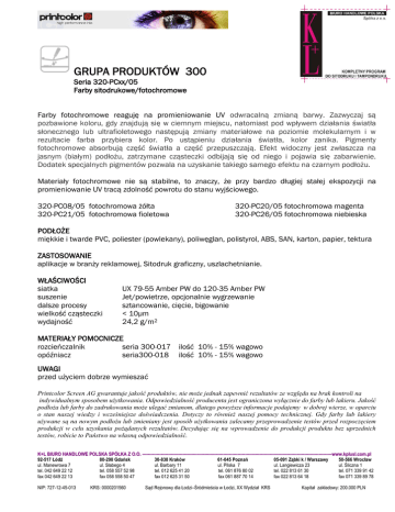 GRUPA PRODUKTÓW 300 Seria 320-PCxx/05 Farby sitodrukowe/fotochromowe Farby fotochromowe reaguję na promieniowanie UV odwracalną zmianą barwy. Zazwyczaj są pozbawione koloru, gdy znajdują się w ciemnym miejscu, natomiast pod wpływem działania światła słonecznego lub ultrafioletowego następują zmiany materiałowe na poziomie molekularnym i w rezultacie farba przybiera kolor. Po ustąpieniu działania światła, kolor zanika. Pigmenty fotochromowe absorbują część światła a część przepuszczają. Efekt widoczny jest zwłaszcza na jasnym (białym) podłożu, zatrzymane cząsteczki odbijają się od niego i pojawia się zabarwienie. Dodatek specjalnych pigmentów pozwala na uzyskanie takiego samego efektu na czarnym podłożu. Materiały fotochromowe nie są stabilne, to znaczy, że przy bardzo długiej stałej ekspozycji na promieniowanie UV tracą zdolność powrotu do stanu wyjściowego. 320-PC08/05 fotochromowa żółta 320-PC21/05 fotochromowa fioletowa 320-PC20/05 fotochromowa magenta 320-PC26/05 fotochromowa niebieska PODŁOŻE miękkie i twarde PVC, poliester (powlekany), poliwęglan, polistyrol, ABS, SAN, karton, papier, tektura ZASTOSOWANIE aplikacje w branży reklamowej, Sitodruk graficzny, uszlachetnianie. WŁAŚCIWOŚCI siatka suszenie dalsze procesy wielkość cząsteczki wydajność UX 79-55 Amber PW do 120-35 Amber PW Jet/powietrze, opcjonalnie wygrzewanie sztancowanie, cięcie, bigowanie < 10µm 24,2 g/m2 MATERIAŁY POMOCNICZE rozcieńczalnik seria 300-017 ilość 10% - 15% wagowo opóźniacz seria300-018 ilość 10% - 15% wagowo UWAGI przed użyciem dobrze wymieszać Printcolor Screen AG gwarantuje jakość produktów, nie może jednak zapewnić rezultatów ze względu na brak kontroli na indywidualnym sposobem użytkowania. Odpowiedzialność producenta jest ograniczona wyłącznie do farby lub lakieru. Jakość podłoża lub farby do zadrukowania może ulegać zmianom, dlatego powyższe informacje podajemy w dobrej wierze, w oparciu o stan naszej wiedzy i wcześniejsze doświadczenia. Dotyczy to również naszej pomocy technicznej. Gdy farby lub lakiery używane są na nowym podłożu lub zmieniany jest sposób użytkowania zalecamy przeprowadzenie testów przed rozpoczęciem produkcji w celu uzyskania pożądanych rezultatów. Decydując się na wprowadzenie do produkcji produktu bez uprzednich testów, robicie to Państwo na własną odpowiedzialność. K+L BIURO HANDLOWE POLSKA SPÓŁKA Z O.O. -----------------------------------------------------------------------------------------------------------------------------------www.kplusl.com.pl 92-517 Łódź 80-298 Gdańsk 30-838 Kraków 61-045 Poznań 05-091 Ząbki k / Warszawy 50-566 Wrocław ul. Manewrowa 7 ul. Słabego 4 ul. Barbary 11 ul. Pilska 7 ul. Langiewicza 23 ul. Śliczna 1 tel. 042 649 22 12 tel. 058 557 52 98 tel. 012 625 41 20 tel. 061 876 80 02 tel. 022 813 61 30 tel. 071 339 91 42 fax 042 649 22 13 fax 058 558 50 47 fax 012 625 31 50 fax 061 887 70 14 fax 022 813 64 18 fax 071 339 89 78 NIP: 727-12-45-013 KRS: 0000201560 Sąd Rejonowy dla Łodzi–Śródmieścia w Łodzi, XX Wydział KRS Kapitał zakładowy: 200.000 PLN