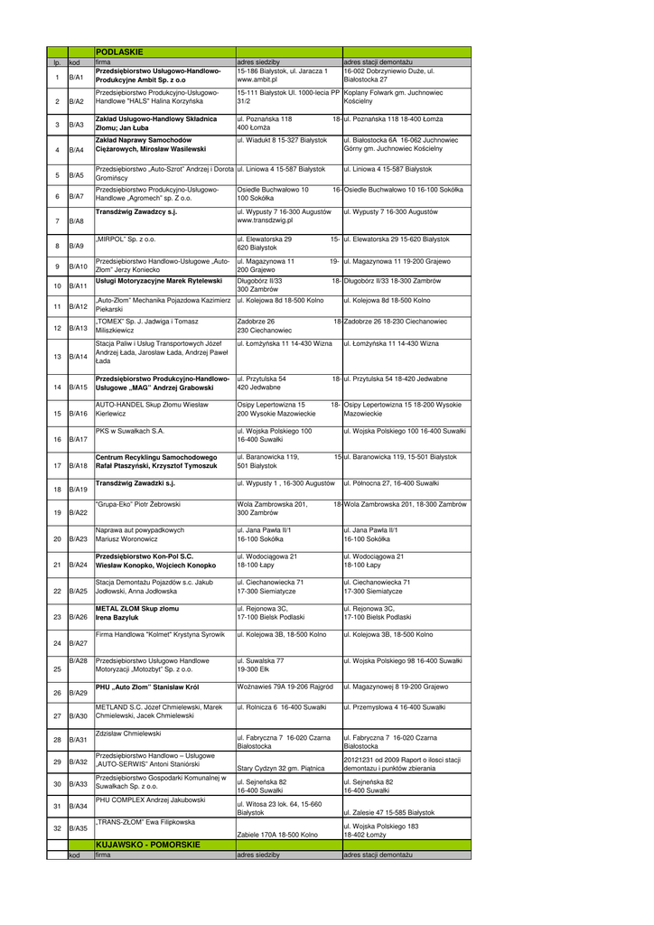 PODLASKIE B/A1 firma Przedsiębiorstwo Usługowo-HandlowoProdukcyjne Ambit Sp. z o.o adres siedziby 15-186 Białystok, ul. Jaracza 1 www.ambit.pl 2 B/A2 Przedsiębiorstwo Produkcyjno-UsługowoHandlowe "HALS" Halina Korzyńska 15-111 Białystok Ul. 1000-lecia PP Koplany Folwark gm. Juchnowiec 31/2 Kościelny 3 B/A3 Zakład Usługowo-Handlowy Składnica Złomu; Jan Łuba ul. Poznańska 118 400 Łomża B/A4 Zakład Naprawy Samochodów Ciężarowych, Mirosław Wasilewski ul. Wiadukt 8 15-327 Białystok 4 5 B/A5 Przedsiębiorstwo „Auto-Szrot” Andrzej i Dorota ul. Liniowa 4 15-587 Białystok Gromińscy 6 B/A7 Przedsiębiorstwo Produkcyjno-UsługowoHandlowe „Agromech” sp. Z o.o. Osiedle Buchwałowo 10 100 Sokółka Transdźwig Zawadzcy s.j. 7 B/A8 ul. Wypusty 7 16-300 Augustów www.transdzwig.pl 8 B/A9 „MIRPOL” Sp. z o.o. ul. Elewatorska 29 620 Białystok 15- ul. Elewatorska 29 15-620 Białystok 9 B/A10 Przedsiębiorstwo Handlowo-Usługowe „AutoZłom” Jerzy Koniecko ul. Magazynowa 11 200 Grajewo 19- ul. Magazynowa 11 19-200 Grajewo 10 B/A11 Usługi Motoryzacyjne Marek Rytelewski Długobórz II/33 300 Zambrów 11 B/A12 „Auto-Złom” Mechanika Pojazdowa Kazimierz ul. Kolejowa 8d 18-500 Kolno Piekarski 12 B/A13 „TOMEX” Sp. J. Jadwiga i Tomasz Miliszkiewicz Zadobrze 26 230 Ciechanowiec B/A14 Stacja Paliw i Usług Transportowych Józef Andrzej Łada, Jarosław Łada, Andrzej Paweł Łada ul. Łomżyńska 11 14-430 Wizna 13 B/A15 Przedsiębiorstwo Produkcyjno-HandlowoUsługowe „MAG” Andrzej Grabowski ul. Przytulska 54 420 Jedwabne 18- ul. Przytulska 54 18-420 Jedwabne 14 15 B/A16 AUTO-HANDEL Skup Złomu Wiesław Kierlewicz Osipy Lepertowizna 15 200 Wysokie Mazowieckie 18- Osipy Lepertowizna 15 18-200 Wysokie Mazowieckie PKS w Suwałkach S.A. 16 B/A17 ul. Wojska Polskiego 100 16-400 Suwałki 17 B/A18 Centrum Recyklingu Samochodowego Rafał Ptaszyński, Krzysztof Tymoszuk ul. Baranowicka 119, 501 Białystok 18 B/A19 Transdźwig Zawadzki s.j. ul. Wypusty 1 , 16-300 Augustów "Grupa-Eko” Piotr Żebrowski 19 B/A22 Wola Zambrowska 201, 300 Zambrów 20 B/A23 Naprawa aut powypadkowych Mariusz Woronowicz ul. Jana Pawła II/1 16-100 Sokółka ul. Jana Pawła II/1 16-100 Sokółka 21 B/A24 Przedsiębiorstwo Kon-Pol S.C. Wiesław Konopko, Wojciech Konopko ul. Wodociągowa 21 18-100 Łapy ul. Wodociągowa 21 18-100 Łapy 22 B/A25 Stacja Demontażu Pojazdów s.c. Jakub Jodłowski, Anna Jodłowska ul. Ciechanowiecka 71 17-300 Siemiatycze ul. Ciechanowiecka 71 17-300 Siemiatycze 23 B/A26 METAL ZŁOM Skup złomu Irena Bazyluk ul. Rejonowa 3C, 17-100 Bielsk Podlaski ul. Rejonowa 3C, 17-100 Bielsk Podlaski Firma Handlowa "Kolmet" Krystyna Syrowik ul. Kolejowa 3B, 18-500 Kolno ul. Kolejowa 3B, 18-500 Kolno 24 B/A27 Przedsiębiorstwo Usługowo Handlowe Motoryzacji „Motozbyt” Sp. z o.o. ul. Suwalska 77 19-300 Ełk ul. Wojska Polskiego 98 16-400 Suwałki PHU „Auto Złom” Stanisław Król Woźnawieś 79A 19-206 Rajgród ul. Magazynowej 8 19-200 Grajewo METLAND S.C. Józef Chmielewski, Marek Chmielewski, Jacek Chmielewski ul. Rolnicza 6 16-400 Suwałki ul. Przemysłowa 4 16-400 Suwałki ul. Fabryczna 7 16-020 Czarna Białostocka ul. Fabryczna 7 16-020 Czarna Białostocka Stary Cydzyn 32 gm. Piątnica 20121231 od 2009 Raport o ilosci stacji demontazu i punktów zbierania ul. Sejneńska 82 16-400 Suwałki ul. Sejneńska 82 16-400 Suwałki lp. kod 1 B/A28 25 26 B/A29 27 B/A30 28 B/A31 29 B/A32 Przedsiębiorstwo Handlowo – Usługowe „AUTO-SERWIS” Antoni Staniórski 30 B/A33 Przedsiębiorstwo Gospodarki Komunalnej w Suwałkach Sp. z o.o. 31 B/A34 32 B/A35 Zdzisław Chmielewski PHU COMPLEX Andrzej Jakubowski adres stacji demontażu 16-002 Dobrzyniewio Duże, ul. Białostocka 27 18- ul. Poznańska 118 18-400 Łomża ul. Białostocka 6A 16-062 Juchnowiec Górny gm. Juchnowiec Kościelny ul. Liniowa 4 15-587 Białystok 16- Osiedle Buchwałowo 10 16-100 Sokółka ul. Wypusty 7 16-300 Augustów 18- Długobórz II/33 18-300 Zambrów ul. Kolejowa 8d 18-500 Kolno 18- Zadobrze 26 18-230 Ciechanowiec ul. Łomżyńska 11 14-430 Wizna ul. Wojska Polskiego 100 16-400 Suwałki 15-ul. Baranowicka 119, 15-501 Białystok ul. Północna 27, 16-400 Suwałki 18- Wola Zambrowska 201, 18-300 Zambrów ul. Witosa 23 lok. 64, 15-660 Białystok ul. Zalesie 47 15-585 Białystok Zabiele 170A 18-500 Kolno ul. Wojska Polskiego 183 18-402 Łomży adres siedziby adres stacji demontażu „TRANS-ZŁOM” Ewa Filipkowska KUJAWSKO - POMORSKIE kod firma C/1 Przedsiębiorstwo Wielobranżowe „POLZŁOM” Spółka Jawna H. G .Leszczyńscy Nowa Wieś 86 88-324 Jeziora Wielkie Nowa Wieś 86 88-324 Jeziora Wielkie 33 Lipniki 86-005 Białe Błota C/2 Spółdzielnia Transportu Wiejskiego w Bydgoszczy Lipniki 86-005 Białe Błota 34 Firma HandlowoUsługowa „DIADA” Spółka Jawna Mariola i Edward Sikora Firma Wielobranżowa Krystyna Pietrzak 86-200 Chełmno ul. Przemysłowa 9 86-200 Chełmno ul. Przemysłowa 9 Cieślin 10 88-100 Inowrocław Cieślin 10 88-100 Inowrocław 35 C/3 36 C/4 37 C/5 „Jankowski” AUTO-HANDEL Mariusz Jankowski ul. Lipowa 4 87-860 Chodecz ul .Al. Zwycięstwa 31 87-860 Chodecz 38 C/6 Zakład Usługowo-Handlowy Łucja Szymielewicz ul. Świerkowa 5 87-300 Brodnica ul. Świerkowa 5 87-300 Brodnica 39 C/7 Firma Usługowo-Handlowa GRAND Andrzej Twarowski Olsztyńska 137 87-100 Toruń Olsztyńska 137 87-100 Toruń Moto -Centrum Stanisław Zieliński ul. Jana Pawła II 31 89-100 Szubin ul. Jana Pawła II 31 89-100 Szubin 40 C/8 ul. Przemysłowa 34 85-758 Bydgoszcz C/9 Przedsiębiorstwo Wielobranżowe "UniTech" Józef Sarnecki ul. Równa 4 85-846 Bydgoszcz 41 Wielowieś 89 88-140 Gniewkowo C/10 Przedsiębiorstwo Wielobranżowe AutoComplex Andrzej Lewandowski Wielowieś 89 88-140 Gniewkowo 42 43 C/11 Firma "Złomowiec" Stanisław Kowalski Szczutowo 65 87-320 Górzno Szczutowo 65 87-320 Górzno ul. Wapienna 10 87-100 Toruń C/12 Przedsiębiorstwo NOE JUNIOR Dawid Łukaszewski Koncesjonowana Kasacja Pojazdów ul. 