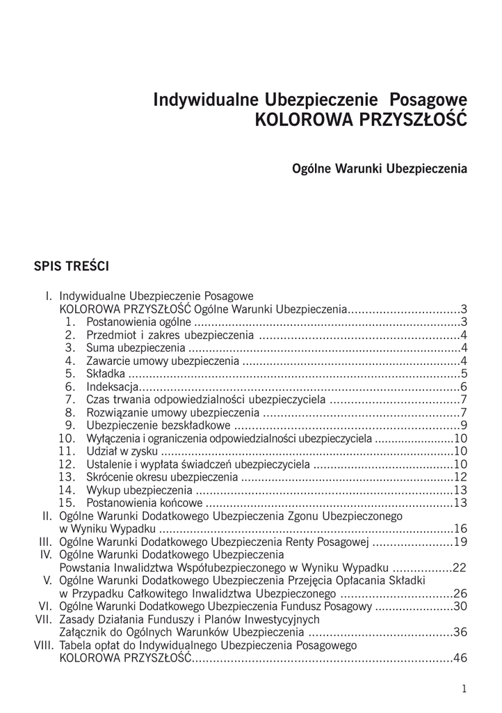 Indywidualne Ubezpieczenie Posagowe KOLOROWA PRZYSZŁOŚĆ Ogólne Warunki Ubezpieczenia SPIS TREŚCI I. Indywidualne Ubezpieczenie Posagowe KOLOROWA PRZYSZŁOŚĆ Ogólne Warunki Ubezpieczenia................................3 1. Postanowienia ogólne ..............................................................................3 2. Przedmiot i zakres ubezpieczenia .........................................................4 3. Suma ubezpieczenia ................................................................................4 4. Zawarcie umowy ubezpieczenia ................................................................4 5. Składka ................................................................................................5 6. Indeksacja............................................................................................6 7. Czas trwania odpowiedzialności ubezpieczyciela .....................................7 8. Rozwiązanie umowy ubezpieczenia ........................................................7 9. Ubezpieczenie bezskładkowe ................................................................9 10. Wyłączenia i ograniczenia odpowiedzialności ubezpieczyciela ........................10 11. Udział w zysku .......................................................................................10 12. Ustalenie i wypłata świadczeń ubezpieczyciela .........................................10 13. Skrócenie okresu ubezpieczenia ...............................................................12 14. Wykup ubezpieczenia ..........................................................................13 15. Postanowienia końcowe ........................................................................13 II. Ogólne Warunki Dodatkowego Ubezpieczenia Zgonu Ubezpieczonego w Wyniku Wypadku ......................................................................................16 III. Ogólne Warunki Dodatkowego Ubezpieczenia Renty Posagowej .......................19 IV. Ogólne Warunki Dodatkowego Ubezpieczenia Powstania Inwalidztwa Współubezpieczonego w Wyniku Wypadku .................22 V. Ogólne Warunki Dodatkowego Ubezpieczenia Przejęcia Opłacania Składki w Przypadku Całkowitego Inwalidztwa Ubezpieczonego ................................26 VI. Ogólne Warunki Dodatkowego Ubezpieczenia Fundusz Posagowy .......................30 VII. Zasady Działania Funduszy i Planów Inwestycyjnych Załącznik do Ogólnych Warunków Ubezpieczenia .........................................36 VIII. Tabela opłat do Indywidualnego Ubezpieczenia Posagowego KOLOROWA PRZYSZŁOŚĆ..........................................................................46 Ogólne Warunki Ubezpieczenia Indywidualne Ubezpieczenie Posagowe zwane również KOLOROWA PRZYSZŁOŚĆ POSTANOWIENIA OGÓLNE §1 1. Niniejsze Ogólne Warunki Ubezpieczenia (OWU) stosuje się w umowach ubezpieczenia zawieranych przez Towarzystwo Ubezpieczeń na Życie „WARTA” S.A., zwane dalej ubezpieczycielem, z ubezpieczającymi. 2. Użyte w niniejszych OWU określenia oznaczają: 1) ubezpieczający – osobę fizyczną, prawną lub jednostkę organizacyjną nie posiadającą osobowości prawnej, zawierającą umowę ubezpieczenia, 2) ubezpieczony – osobę fizyczną, której życie lub zdrowie jest przedmiotem ubezpieczenia, może nim być jedynie ubezpieczający, 3) współubezpieczony – wskazane przez ubezpieczającego dziecko, którego życie lub zdrowie jest przedmiotem ubezpieczenia, jednocześnie uprawnione do otrzymania świadczeń z tytułu zgonu ubezpieczonego, 4) umowa ubezpieczenia – umowę, przez którą ubezpieczyciel zobowiązuje się spełnić określone świadczenie w razie zajścia zdarzenia przewidzianego w umowie ubezpieczenia, a ubezpieczający zobowiązuje się zapłacić składkę, 5) dodatkowa umowa ubezpieczenia – umowę ubezpieczenia zawieraną na podstawie Ogólnych Warunków Dodatkowego Ubezpieczenia stanowiących Załączniki do OWU, 6) renta posagowa – dodatkową umowę ubezpieczenia, zawartą na podstawie Ogólnych Warunków Dodatkowego Ubezpieczenia Renty Posagowej, 7) suma ubezpieczenia – sumę pieniężną określoną w umowie ubezpieczenia, będącą podstawą ustalania wysokości świadczenia ubezpieczyciela, 8) świadczenie ubezpieczyciela – sumę pieniężną, którą ubezpieczyciel wypłaca w razie zajścia zdarzenia przewidzianego w umowie ubezpieczenia, 9) rocznica polisy – rocznicę zawarcia umowy ubezpieczenia, 10) rezerwa matematyczna –przypadającą na daną umowę ubezpieczenia zawartą w zakresie podstawowym oraz w zakresie renty posagowej, o ile została zawarta dodatkowa umowa renty posagowej, rezerwę tworzoną przez ubezpieczyciela, w wysokości wskazanej w umowie ubezpieczenia odpowiednio dla poszczególnych lat trwania umowy ubezpieczenia, ustalonej według zasad obowiązujących u ubezpieczyciela w dniu zawarcia danej umowy ubezpieczenia, 11) stopa techniczna – stopę techniczną przyjętą do kalkulacji składki dla danej umowy ubezpieczenia przy jej zawieraniu; wysokość stopy technicznej określona jest w umowie ubezpieczenia, 12) wartość wykupu – kwotę wskazaną w umowie ubezpieczenia, odpowiednio dla poszczególnych lat trwania umowy ubezpieczenia, wypłacaną przez ubezpieczyciela na zasadach określonych w OWU, 13) składka – składkę wynikającą z umowy ubezpieczenia, 14) udział w zyskach – udział w zyskach wynikających z inwestowania przez ubezpieczyciela rezerw matematycznych, przysługujący na zasadach określonych w OWU, 15) wskaźnik indeksacji – procent ustalany przez ubezpieczyciela na maksymalnym poziomie trzech punktów procentowych powyżej publikowanego przez GUS, wskaźnika wzrostu cen towarów i usług konsumpcyjnych, 16) minimalna wartość wykupu – kwotę ustalaną okresowo przez ubezpieczyciela, określoną w tabeli opłat stanowiącej załącznik do OWU, 17) polisa – dokument ubezpieczenia, w rozumieniu art. 809 kodeksu cywilnego