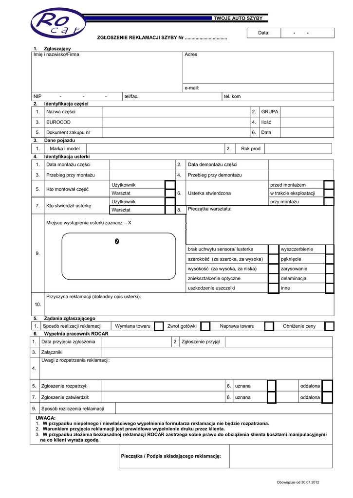 TWOJE AUTO SZYBY 1. Zgłaszający Imię i nazwisko/Firma - Data: ZGŁOSZENIE REKLAMACJI SZYBY Nr ................................ - Adres e-mail: NIP 2. - - - tel/fax. tel. kom Identyfikacja części 1. Nazwa części 2. GRUPA 3. EUROCOD 4. Ilość 5. Dokument zakupu nr 6. Data 3. 1. 4. Dane pojazdu Marka i model 2. Rok prod Identyfikacja usterki 1. Data montażu części 2. Data demontażu części 3. Przebieg przy montażu 4. Przebieg przy demontażu 5. Kto montował część 7. Kto stwierdził usterkę Użytkownik Warsztat przed montażem 6. Usterka stwierdzona 8. Pieczątka warsztatu: Użytkownik Warsztat w trakcie eksploatacji przy montażu Miejsce wystąpienia usterki zaznacz - X 9. brak uchwytu sensora/ lusterka wyszczerbienie szerokość (za szeroka, za wysoka) pęknięcie wysokość (za wysoka, za niska) zarysowanie zniekształcenie optyczne delaminacja uszkodzenie uszczelki inne Przyczyna reklamacji (dokładny opis usterki): 10. 5. Żądania zgłaszającego 1. Sposób realizacji reklamacji 6. Wypełnia pracownik ROCAR 1. Data przyjęcia zgłoszenia 3. Załączniki Wymiana towaru Zwrot gotówki Naprawa towaru Obniżenie ceny 2. Zgłoszenie przyjął Uwagi z rozpatrzenia reklamacji: 4. 5. Zgłoszenie rozpatrzył: 6. uznana oddalona 7. Zgłoszenie zatwierdził: 8. uznana oddalona 9. Sposób rozliczenia reklamacji UWAGA: 1. W przypadku niepełnego / niewłaściwego wypełnienia formularza reklamacja nie będzie rozpatrzona. 2. Warunkiem przyjęcia reklamacji jest prawidłowe wypełnienie druku przez klienta. 3. W przypadku złożenia bezzasadnej reklamacji ROCAR zastrzega sobie prawo do obciążenia klienta kosztami manipulacyjnymi na co klient wyraża zgodę. Pieczątka / Podpis składającego reklamację: Obowiązuje od 30.07.2012 TWOJE AUTO SZYBY Obowiązuje od 30.07.2012