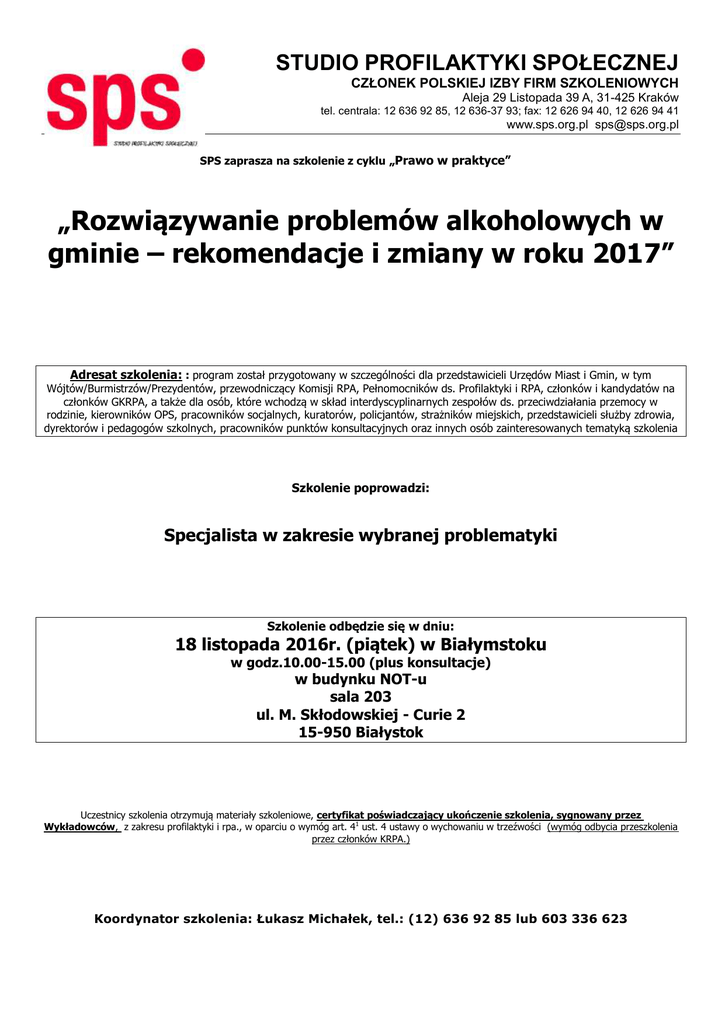 STUDIO PROFILAKTYKI SPOŁECZNEJ CZŁONEK POLSKIEJ IZBY FIRM SZKOLENIOWYCH Aleja 29 Listopada 39 A, 31-425 Kraków tel. centrala: 12 636 92 85, 12 636-37 93; fax: 12 626 94 40, 12 626 94 41 www.sps.org.pl [email protected] SPS zaprasza na szkolenie z cyklu „Prawo w praktyce” „Rozwiązywanie problemów alkoholowych w gminie – rekomendacje i zmiany w roku 2017” Adresat szkolenia: : program został przygotowany w szczególności dla przedstawicieli Urzędów Miast i Gmin, w tym Wójtów/Burmistrzów/Prezydentów, przewodniczący Komisji RPA, Pełnomocników ds. Profilaktyki i RPA, członków i kandydatów na członków GKRPA, a także dla osób, które wchodzą w skład interdyscyplinarnych zespołów ds. przeciwdziałania przemocy w rodzinie, kierowników OPS, pracowników socjalnych, kuratorów, policjantów, strażników miejskich, przedstawicieli służby zdrowia, dyrektorów i pedagogów szkolnych, pracowników punktów konsultacyjnych oraz innych osób zainteresowanych tematyką szkolenia Szkolenie poprowadzi: Specjalista w zakresie wybranej problematyki Szkolenie odbędzie się w dniu: 18 listopada 2016r. (piątek) w Białymstoku w godz.10.00-15.00 (plus konsultacje) w budynku NOT-u sala 203 ul. M. Skłodowskiej - Curie 2 15-950 Białystok Uczestnicy szkolenia otrzymują materiały szkoleniowe, certyfikat poświadczający ukończenie szkolenia, sygnowany przez Wykładowców, z zakresu profilaktyki i rpa., w oparciu o wymóg art. 41 ust. 4 ustawy o wychowaniu w trzeźwości (wymóg odbycia przeszkolenia przez członków KRPA.) Koordynator szkolenia: Łukasz Michałek, tel.: (12) 636 92 85 lub 603 336 623 STUDIO PROFILAKTYKI SPOŁECZNEJ CZŁONEK POLSKIEJ IZBY FIRM SZKOLENIOWYCH Aleja 29 Listopada 39 A, 31-425 Kraków tel. centrala: 12 636 92 85, 12 636-37 93; fax: 12 626 94 40, 12 626 94 41 www.sps.org.pl [email protected] „Rozwiązywanie problemów alkoholowych w gminie – rekomendacje i zmiany w 2017 roku” - program szkolenia: 18.11.2016r., godz.10.00-15.00, Budynek NOT, Białystok godz.: 10.00-15.00 (13.00-13.30 Lunch): 1. Gminne programy profilaktyki i rozwiązywania problemów alkoholowych w kontekście wytycznych Narodowego Programu Zdrowia oraz Ustawy o zdrowiu publicznym. Jednostki samorządu gminnego jako realizatorzy Narodowego Programu Zdrowia 2. Najpilniejsze wyzwania przed gminnym programami: - dobra profilaktyka. Poziomy profilaktyki wskazane w NPZ. Co odróżnia skuteczne i nieskuteczne strategii profilaktyczne. Przegląd strategii profilaktycznych oraz prezentacja Systemu Rekomendacji Programów Profilaktycznych i Promocji Zdrowia. - pomoc socjoterapeutyczna dla dzieci z rodzin alkoholowych oraz ich rodziców. zajęć opiekuńczo – wychowawczych. Przykłady projektów socjoterapeutycznych Co odróżnia socjoterapie od - programy ograniczania picia jako nowa oferta dla osób pijących szkodliwie oraz uzależnionych. 3. Aspekty prawne procedury zobowiązania do leczenia odwykowego - przekazywanie danych osobowych oraz poszczególne etapy jej realizacji w kontekście kontroli NIK „Informacja o wynikach kontroli Przymusowe kierowanie osób uzależnionych od alkoholu na leczenie odwykowe”. 15.00- Wręczenie certyfikatów ukończenia szkolenia od 15.00 Odpowiedzi na pytania i konsultacje indywidualne Koszt szkolenia: cena szkolenia wynosi 310zł od 1 osoby i obejmuje: - poczęstunek- kawa, herbata, napoje, lunch, autorskie materiały szkoleniowe. - Uczestnicy szkolenia otrzymują materiały szkoleniowe, certyfikat poświadczający ukończenie szkolenia z zakresu profilaktyki i rpa., w oparciu o wymóg art. 41 ust. 4 ustawy o wychowaniu w trzeźwości Należność za udział w szkoleniu należy przesłać po szkoleniu, po otrzymaniu FV, w terminie 7 dni Dojazd na własny koszt. Koordynator szkolenia: Łukasz Michałek, tel.: (12) 636 92 85 lub 603 336 623 STUDIO PROFILAKTYKI SPOŁECZNEJ CZŁONEK POLSKIEJ IZBY FIRM SZKOLENIOWYCH Aleja 29 Listopada 39 A, 31-425 Kraków tel. centrala: 12 636 92 85, 12 636-37 93; fax: 12 626 94 40, 12 626 94 41 www.sps.org.pl [email protected] …………...................................... dnia KARTA ZGŁOSZENIA UCZESTNICTWA W SZKOLENIU NAZWA FORMY DOSKONALENIA: „Rozwiązywanie problemów alkoholowych w gminie – rekomendacje i zmiany w 2017 roku” TERMIN I MIEJSCE: 18.11.2016r. Budynek NOT, ul. M. Skłodowskiej - Curie 2, 15-950 Białystok L.p. Imię i nazwisko (dane prosimy wpisywać drukowanymi literami) Funkcja TEL. KONTAKTOWY:………...............................…………………………………………………………....................……... ADRES E-MAIL:……………………………...............................…………………………………………....................………. FAKTURĘ VAT PROSZĘ WYSTAWIĆ NA:…………..............................…………………………….....................………… ADRES:……………………………………………..............................…… NIP:............…..….….…...........................………. Wyrażam zgodę na przetwarzanie moich danych osobowych przez Studio Profilaktyki Społecznej oraz Suprema Lex CSKiS, dla potrzeb zgłoszonego szkolenia, zgodnie z ustawą z dnia 29 sierpnia 1997 r. o ochronie danych osobowych (Dz. U. z 1997 r. Nr 133, poz. .883). Wyrażam zgodę na otrzymywanie informacji o szkoleniach i usługach firmy Studio Profilaktyki Społecznej oraz Suprema Lex CSKiS w rozumieniu ust. z dnia 18 lipca 2002r. o świadczeniu usług drogą elektroniczną na adres e-mail. Dane nie będą przekazywane podmiotom trzecim. ŁM ………………………..................…………………….. Pieczęć i podpis zgłaszającego oraz Instytucji zgłaszającej Oświadczam, iż środki wydatkowane na w/w szkolenie pochodzą w co najmniej 70% ze środków publicznych w rozumieniu ustawy o finansach publicznych. ………………………..................…………………….. Pieczę