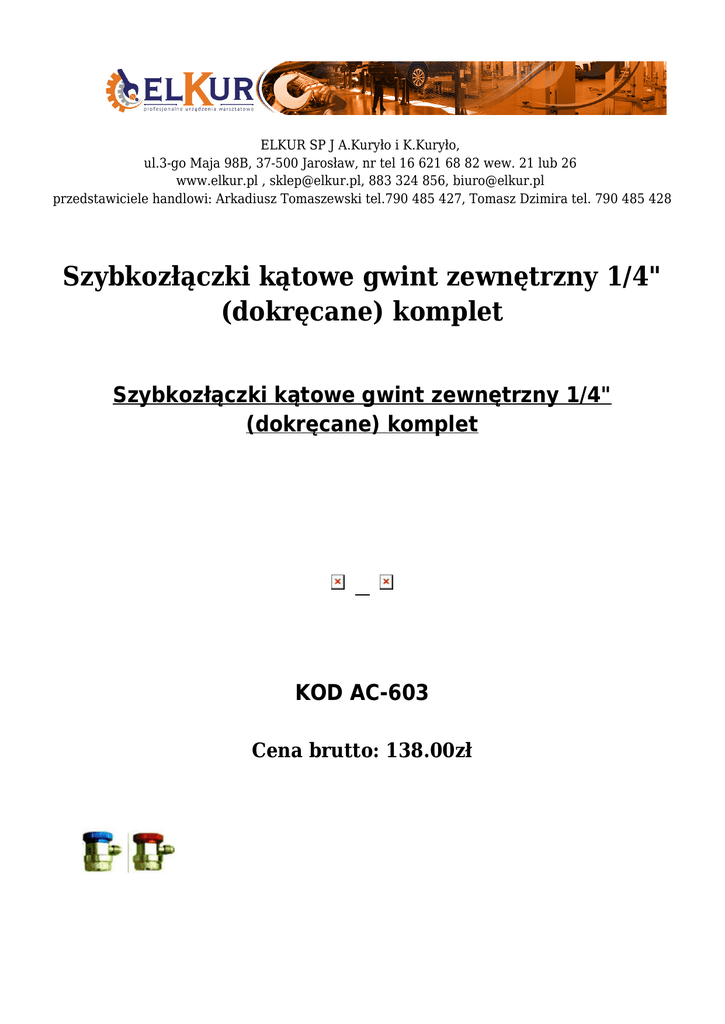 ELKUR SP J A.Kuryło i K.Kuryło, ul.3-go Maja 98B, 37-500 Jarosław, nr tel 16 621 68 82 wew. 21 lub 26 www.elkur.pl , [email protected], 883 324 856, [email protected] przedstawiciele handlowi: Arkadiusz Tomaszewski tel.790 485 427, Tomasz Dzimira tel. 790 485 428 Szybkozłączki kątowe gwint zewnętrzny 1/4" (dokręcane) komplet Szybkozłączki kątowe gwint zewnętrzny 1/4" (dokręcane) komplet KOD AC-603 Cena brutto: 138.00zł