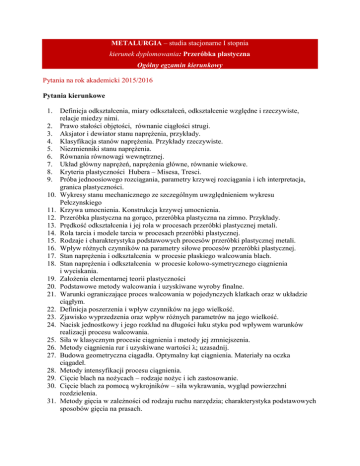 METALURGIA – studia stacjonarne I stopnia kierunek dyplomowania: Przeróbka plastyczna Ogólny egzamin kierunkowy Pytania na rok akademicki 2015/2016 Pytania kierunkowe 1. 2. 3. 4. 5. 6. 7. 8. 9. 10. 11. 12. 13. 14. 15. 16. 17. 18. 19. 20. 21. 22. 23. 24. 25. 26. 27. 28. 29. 30. 31. Definicja odkształcenia, miary odkształceń, odkształcenie względne i rzeczywiste, relacje miedzy nimi. Prawo stałości objętości, równanie ciągłości strugi. Aksjator i dewiator stanu naprężenia, przykłady. Klasyfikacja stanów naprężenia. Przykłady rzeczywiste. Niezmienniki stanu naprężenia. Równania równowagi wewnętrznej. Układ główny naprężeń, naprężenia główne, równanie wiekowe. Kryteria plastyczności Hubera – Misesa, Tresci. Próba jednoosiowego rozciągania, parametry krzywej rozciągania i ich interpretacja, granica plastyczności. Wykresy stanu mechanicznego ze szczególnym uwzględnieniem wykresu Pełczynskiego Krzywa umocnienia. Konstrukcja krzywej umocnienia. Przeróbka plastyczna na gorąco, przeróbka plastyczna na zimno. Przykłady. Prędkość odkształcenia i jej rola w procesach przeróbki plastycznej metali. Rola tarcia i modele tarcia w procesach przeróbki plastycznej. Rodzaje i charakterystyka podstawowych procesów przeróbki plastycznej metali. Wpływ różnych czynników na parametry siłowe procesów przeróbki plastycznej. Stan naprężenia i odkształcenia w procesie płaskiego walcowania blach. Stan naprężenia i odkształcenia w procesie kołowo-symetrycznego ciągnienia i wyciskania. Założenia elementarnej teorii plastyczności Podstawowe metody walcowania i uzyskiwane wyroby finalne. Warunki ograniczające proces walcowania w pojedynczych klatkach oraz w układzie ciągłym. Definicja poszerzenia i wpływ czynników na jego wielkość. Zjawisko wyprzedzenia oraz wpływ różnych parametrów na jego wielkość. Nacisk jednostkowy i jego rozkład na długości łuku styku pod wpływem warunków realizacji procesu walcowania. Siła w klasycznym procesie ciągnienia i metody jej zmniejszenia. Metody ciągnienia rur i uzyskiwane wartości λ; uzasadnij. Budowa geometryczna ciągadła. Optymalny kąt ciągnienia. Materiały na oczka ciągadeł. Metody intensyfikacji procesu ciągnienia. Cięcie blach na nożycach – rodzaje nożyc i ich zastosowanie. Cięcie blach za pomocą wykrojników – siła wykrawania, wygląd powierzchni rozdzielenia. Metody gięcia w zależności od rodzaju ruchu narzędzia; charakterystyka podstawowych sposobów gięcia na prasach. 32. Podstawowe procesy tłoczenia blach (kształtowania wyrobów o powierzchni nierozwijalnej) – nazwy, schematy, krótka charakterystyka. 33. Zjawiska ograniczające proces wytłaczania blach – kryteria i sposoby zapobiegania ich wystąpieniu. 34. Wyroby kute i metody ich otrzymywania. 35. Projektowanie odkuwki matrycowej na tle rysunku wyrobu gotowego. 36. Rola wypływki w procesie kucia matrycowego. 37. Idealna przedkuwka i etapy jej konstruowania. 38. Elementy konstrukcji młota do kucia, energia uderzenia młota. 39. Wyroby wyciskane i sposoby ich otrzymywania. 40. Typy płynięcia metalu w procesach wyciskania. 41. Przebiegi sił w procesach wyciskania współbieżnego oraz przeciwbieżnego. 42. Narzędzia przeznaczone do wyciskania wyrobów pełnych i pustych. 43. Wyciskanie izotermiczne, cel i sposoby jego realizacji. 44. Czynniki decydujące o szybkości rekrystalizacji i końcowej strukturze metali i stopów poddanych wyżarzaniu (po odkształceniu „na zimno”). 45. Wpływ zdrowienia dynamicznego na krzywą σ - ε , strukturę i własności odkształconego materiału. 46. Wpływ rekrystalizacji dynamicznej na przebieg krzywej σ - ε i strukturę odkształconego materiału. 47. Obróbka cieplna stopów aluminium serii 6000 (Al-Mg-Si) – procesy strukturalne i ich wpływ na własności wyrobów. 48. Zintegrowane procesy przeróbki plastycznej metali nieżelaznych. 49. Proces Contirod produkcji walcówki miedzianej. 50. Proces Continuous Properzi produkcji walcówki aluminiowej. Pytania uzupełniające 1. Omów zachowanie elektrody w warunkach równowagi i w warunkach polaryzacji. 2. Omów pojęcia izotermy i izobary van’t Hoffa, przedstaw graficzne. 3. Wyjaśnij regułę faz Gibbsa i regułę przekory Le’ Chateliera, podaj przykłady na reakcjach. 4. Wymień metody otrzymywania ołowiu i omów szczegółowo jedną z nich. 5. Omów otrzymywanie tlenku glinowego metodą Bayera w układzie Na2O-Al2O3-H2O. 6. Omów otrzymywanie aluminium metodą elektrolizy w solach stopionych, narysuj jeden z rodzajów elektrolizerów. 7. Omów teorie prażenia siarczków oraz proces prażenia koncentratów Zn w warstwie fluidalnej. 8. Omów proces otrzymywania cynku metodą IS. 9. Scharakteryzuj proces otrzymywania miedzi w piecu zawiesinowym i szybowym, omów ich różnice. 10. Opisz etapy procesu konwertorowania kamienia miedziowego, narysuj konwertor. 11. Rodzaje oddziaływań podstawowych wiązań międzyatomowych oraz ich konsekwencje dla ciała stałego – sprężystość kryształów. 12. Sieć krystaliczna - rodzaje sieci krystalicznych, symetria, rzut stereograficzny sieci. 13. Defekty struktury krystalicznej - podział, opis i właściwości. 14. Dyfuzja i samodyfuzja w ciele stałym - istota, opis i zależności od parametrów termodynamicznych. 15. Krystalizacja - mechanizmy, zależności od szybkości zmian temperatury. Tworzenie mono- i polikryształów, wpływ odchylenia od warunków równowagi na krystalizację. 16. Stopy metali – definicje i określenia elementów oraz pojęcia i rodzaje faz w stopach z uwzględnieniem układów równowagi faz. 17. Umocnienie metali i stopów i ich związek z procesami strukturalnymi w ciele stałym. 18. Strukturalne skutki deformacji plastycznej – mechanizmy deformacji plastycznej. 19. Podział i zasady obróbek cieplnych uplastyczniających w metalach i stopach. 20. Ulepszanie cieplne i utwardzanie wydzieleniowe w metalach i stop