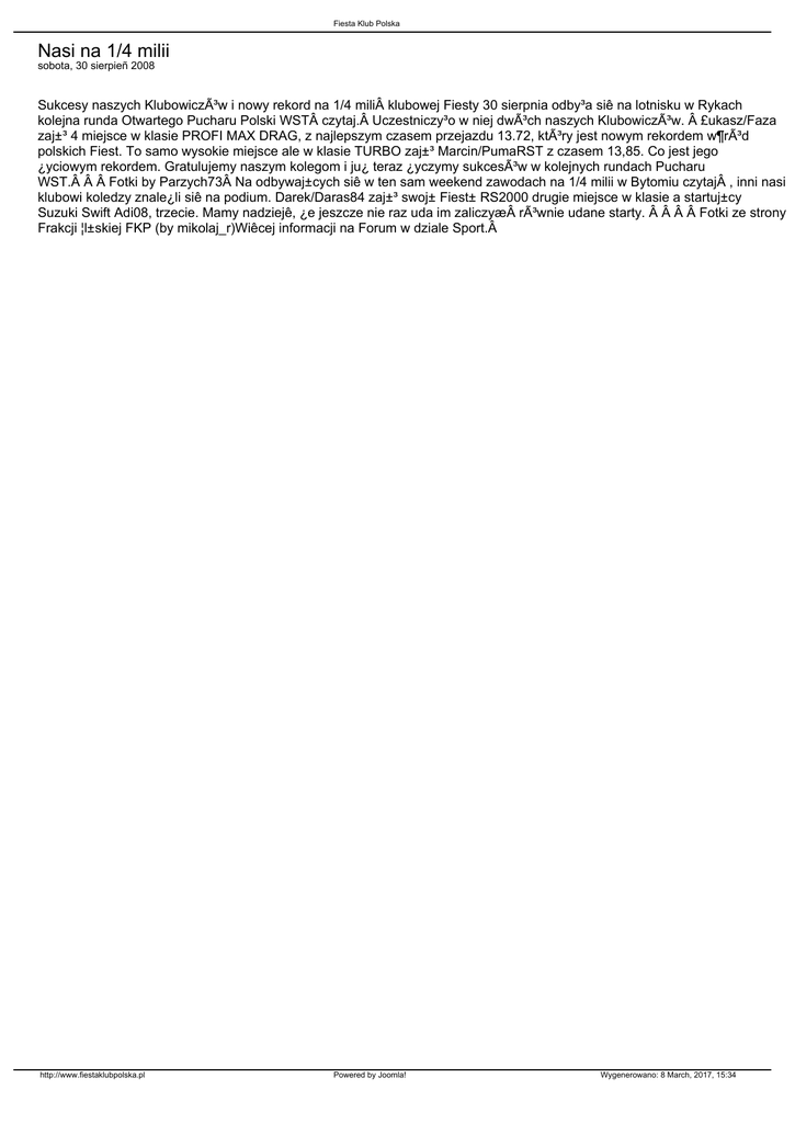Fiesta Klub Polska Nasi na 1/4 milii sobota, 30 sierpieñ 2008 Sukcesy naszych Klubowiczów i nowy rekord na 1/4 mili klubowej Fiesty 30 sierpnia odby³a siê na lotnisku w Rykach kolejna runda Otwartego Pucharu Polski WST czytaj. Uczestniczy³o w niej dwóch naszych Klubowiczów.  £ukasz/Faza zaj±³ 4 miejsce w klasie PROFI MAX DRAG, z najlepszym czasem przejazdu 13.72, który jest nowym rekordem w¶ród polskich Fiest. To samo wysokie miejsce ale w klasie TURBO zaj±³ Marcin/PumaRST z czasem 13,85. Co jest jego ¿yciowym rekordem. Gratulujemy naszym kolegom i ju¿ teraz ¿yczymy sukcesów w kolejnych rundach Pucharu WST.   Fotki by Parzych73 Na odbywaj±cych siê w ten sam weekend zawodach na 1/4 milii w Bytomiu czytaj , inni nasi klubowi koledzy znale¿li siê na podium. Darek/Daras84 zaj±³ swoj± Fiest± RS2000 drugie miejsce w klasie a startuj±cy Suzuki Swift Adi08, trzecie. Mamy nadziejê, ¿e jeszcze nie raz uda im zaliczyæÂ równie udane starty.     Fotki ze strony Frakcji ¦l±skiej FKP (by mikolaj_r)Wiêcej informacji na Forum w dziale Sport. http://www.fiestaklubpolska.pl Powered by Joomla! Wygenerowano: 8 March, 2017, 15:34