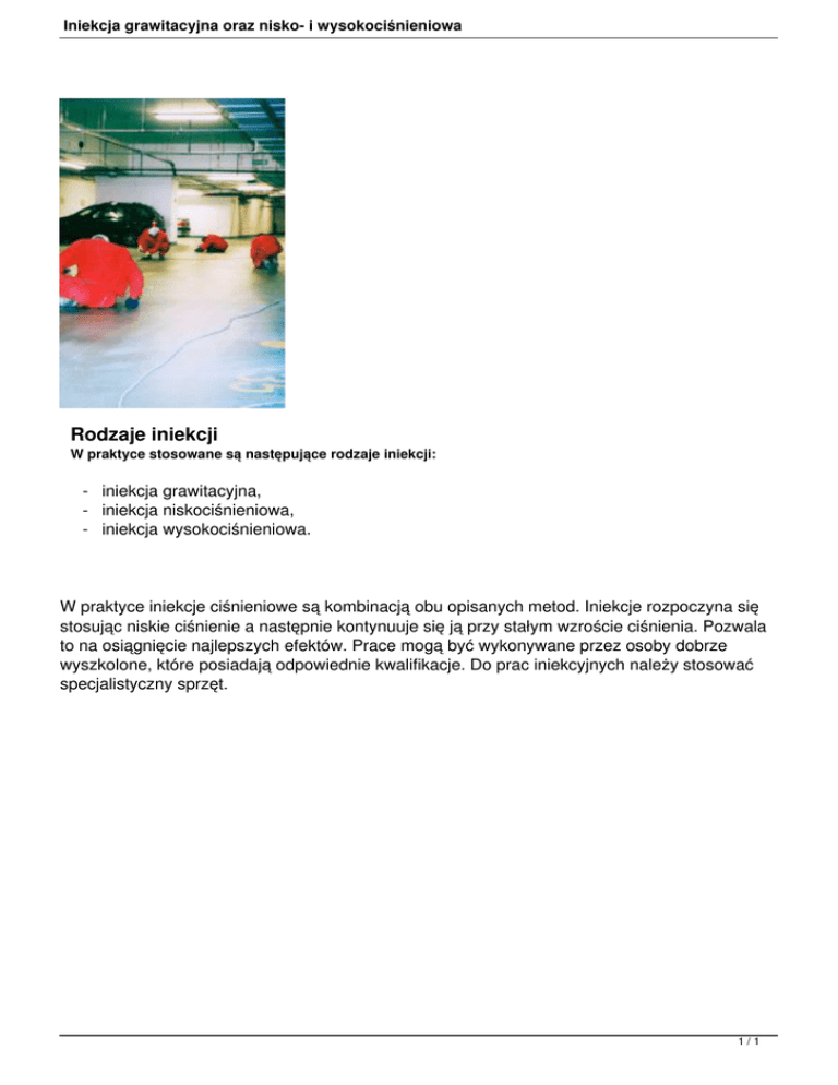 Iniekcja grawitacyjna oraz nisko- i wysokociśnieniowa Rodzaje iniekcji W praktyce stosowane są następujące rodzaje iniekcji: - iniekcja grawitacyjna, - iniekcja niskociśnieniowa, - iniekcja wysokociśnieniowa. W praktyce iniekcje ciśnieniowe są kombinacją obu opisanych metod. Iniekcje rozpoczyna się stosując niskie ciśnienie a następnie kontynuuje się ją przy stałym wzroście ciśnienia. Pozwala to na osiągnięcie najlepszych efektów. Prace mogą być wykonywane przez osoby dobrze wyszkolone, które posiadają odpowiednie kwalifikacje. Do prac iniekcyjnych należy stosować specjalistyczny sprzęt. 1/1