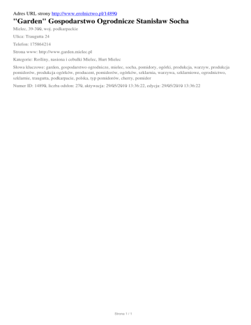 Adres URL strony http://www.erolnictwo.pl/14890 "Garden" Gospodarstwo Ogrodnicze Stanisław Socha Mielec, 39-300, woj. podkarpackie Ulica: Traugutta 24 Telefon: 175864214 Strona www: http://www.garden.mielec.pl Kategorie: Rośliny, nasiona i cebulki Mielec, Hurt Mielec Słowa kluczowe: garden, gospodarstwo ogrodnicze, mielec, socha, pomidory, ogórki, produkcja, warzyw, produkcja pomidorów, produkcja ogórków, producent, pomidorów, ogórków, szklarnia, warzywa, szklarniowe, ogrodnictwo, szklarnie, traugutta, podkarpacie, polska, typ pomidorów, cherry, pomidor Numer ID: 14890, liczba odsłon: 270, aktywacja: 29/05/2010 13:36:22, edycja: 29/05/2010 13:36:22 Strona 1 / 1
