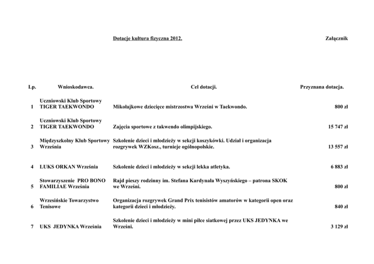 Dotacje kultura fizyczna 2012. Lp. Wnioskodawca. Załącznik Cel dotacji. Przyznana dotacja. 1 Uczniowski Klub Sportowy TIGER TAEKWONDO Mikołajkowe dziecięce mistrzostwa Wrześni w Taekwondo. 2 Uczniowski Klub Sportowy TIGER TAEKWONDO Zajęcia sportowe z takwendo olimpijskiego. 3 Międzyszkolny Klub Sportowy Szkolenie dzieci i młodzieży w sekcji koszykówki. Udział i organizacja Września rozgrywek WZKosz., turnieje ogólnopolskie. 4 LUKS ORKAN Września Szkolenie dzieci i młodzieży w sekcji lekka atletyka. 5 Stowarzyszenie PRO BONO FAMILIAE Września Rajd pieszy rodzinny im. Stefana Kardynała Wyszyńskiego – patrona SKOK we Wrześni. 800 zł 6 Wrzesińskie Towarzystwo Tenisowe Organizacja rozgrywek Grand Prix tenisistów amatorów w kategorii open oraz kategorii dzieci i młodzieży. 840 zł 7 UKS JEDYNKA Września Szkolenie dzieci i młodzieży w mini piłce siatkowej przez UKS JEDYNKA we Wrześni. 800 zł 15 747 zł 13 557 zł 6 883 zł 3 129 zł 8 Wrzesińskie Towarzystwo Tenisowe Organizacja czasu wolnego oraz wypoczynku w miejscu zamieszkania podczas wakacji letnich. Przeprowadzenie akcji '' Wakacje z tenisem''. 9 Wrzesińskie Towarzystwo Tenisowe Szkolenie dzieci i młodzieży w sekcji sportowej Wrzesińskiego Towarzystwa Tenisowego, udział w rozgrywkach PZT. Szkolenie dzieci i młodzieży w piłce nożnej drużyny junior młodszy i młodzik 10 LKS BŁĘKITNI Psary Polskie starszy. 11 KS KOSYNIER Sokołowo Szkolenie dzieci i młodzieży udział w rozgrywkach prowadzonych przez KOZPN w Koninie. 600 zł 7 822 zł 20 858 zł 7 100 zł Międzyszkolny Klub Sportowy Szkolenie dzieci i młodzieży , prowadzenie zajęć treningowych, udział w 12 Września wielkopolskiej lidze młodzików młodszych organizowanych przez WZKOSZ. 4 172 zł Szkolenie dzieci i młodzieży, prowadzenie zajęć treningowych udział w Międzyszkolny Klub Sportowy Wielkopolskiej lidze młodzików młodszych oraz wielkopolskiej lidze młodzików 13 Września starszych organizowanych przez WZKOSZ. 8 343 zł Klub Biegacza KOSYNIER 14 Września Organizacja XXIX Biegu Kosynierów. 15 UKS ELEKTRON Września Rajd rowerowo-kajakowo-żeglarski "Powidz park krajobrazowy 2012". 0 zł 16 UKS ISKRA Marzenin Szkolenie dzieci i młodzieży, udział w rozgrywkach prowadzonych przez WZSzach i turniejach szachowych. 2 050 zł Wrzesińskie Towarzystwo Piłki 17 Nożnej w Futsalu Organizacja amatorskich rozgrywek w halowej piłce nożnej. 12 000 zł 1 480 zł 18 PTTK O/Września Organizacja imprez turystycznych dla dzieci i młodzieży. 3 200 zł 19 LUKS ORKAN Września Szkolenie dzieci i młodzieży w halowej piłce siatkowej i plażowej piłce siatkowej dziewcząt w kategorii seniorki ( juniorki ) juniorek, kadetek. UKS GRODZIANIE 20 Grzybowo VI jesienny festyn sportowo rekreacyjny Grzybowo 2012. 800 zł UKS GRODZIANIE 21 Grzybowo VI wiosenny festyn sportowo rekreacyjny '' Jesteś tym co jesz '' Grzybowo 2012. 800 zł 22 Liga Obrony Kraju Września Strzelectwo sportowe; w tym liga strzelecka seniorów,szkolna liga strzelecka dla dzieci i młodzieży z ssp, gimnazjum i szkół ponadgimnazjalnych, treningi strzeleckie, akcja zima, lato oraz inne okolicznościowe. 23 Wrzesiński Klub Karate Gminna olimpiada karate dla przedszkolaków Września 2012. 24 Wrzesiński Klub Karate Szkolenie dzieci i młodzieży, prowadzenie zajęć treningowych karate tradycyjnego. 13 036 zł 25 UKS ORZEŁ Września Szkolenie dzieci i młodzieży, prowadzenie zajęć treningowych, udział w 12 202 zł 26 UKS ORZEŁ Września IX Turniej eliminacyjny okręgu wlkp. Z cyklu przygotowań do mistrzostw Polski i pucharu Polski dzieci. 1 200 zł 27 UKS SPARTAKUS Września Szkolenie dzieci w mini piłce siatkowej przez UKS ''Spartakus'' przy SSP nr 2 we Wrześni. 6 257 zł 22 000 zł 1 320 zł 680 zł 28 UKS SPARTAKUS Września Wakacyjna liga piłkarska dla dzieci w wieku do 14 lat pod nazwą ''Mistrzostwa Europy we Wrześni – szukamy talentów ''. 680 zł 29 UKS SPARTAKUS Września Piłkarska liga piłki nożnej 6-osobowej o Puchar Burmistrza Miasta i Gminy Września dla mieszkańców Gminy i Miasta od 16 roku życia. 960 zł 31 UKS OLIMP Września Szkolenie dzieci i młodzieży w piłce nożnej, udział w rozgrywkach międzywojewódzkich organizowanych przez WZPN w Poznaniu. Szkolenie dzieci i młodzieży , udział w rozgrywkach ligowych: mistrzostwa wielkopolski młodziczek, kadetek i mini siatkówki w piłce siatkowej oraz piłce plażowej dziewcząt. 32 UKS OLIMP Września Organizacja czasu wolnego i wypoczynku dzieci i młodzieży w okresie wakacji letnich – cykl turniejów piłki siatkowej plażowej w Sokołowie 720 zł 33 UKS OLIMP Września V Halowe mistrzostwa w lekkiej atletyce '' Mali lekkoatleci '' 800 zł 34 UKS OLIMP Września Organizacja obozu sportowo – wypoczynkowego z elementami turystyki kwalifikowanej. 35 UKS OLIMP Września Halowy festyn lekkoatletyczny dla szkół gimnazjalnych. 800 zł 36 UKS OLIMP Września Halowy festyn lekkoatletyczny dla klas IV-VI szkół podstawowych 800 zł 37 MKS VICTORIA Września Szkolenie dzieci i młodzieży w piłce nożnej, udział w rozgrywkach OZPN Konin. 30 MKS VICTORIA Września 20 858 zł 14 079 zł 0 zł 43 800 zł 38 KPS PROGRESS Września Szkolenie dzieci i młodzieży piłka siatkowa plażowa chłopców. 21 850 zł 39 KPS PROGRESS Września Szkolenie dzieci i młodzieży piłka siatkowa halowa chłopców. 6 257 zł 40 KPS PROGRESS Września Turniej plażowej piłki siatkowej dla dzieci i młodzieży w okresie ferii letnich. Stowarzyszenie PRO BONO 41 FAMILIAE Września Poznajemy ciekawe zawody. 720 zł 0 zł BURMISTRZ /-/Tomasz Kałużny