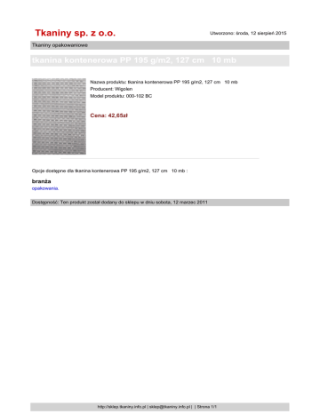 Tkaniny sp. z o.o. Utworzono: środa, 12 sierpień 2015 Tkaniny opakowaniowe tkanina kontenerowa PP 195 g/m2, 127 cm 10 mb Nazwa produktu: tkanina kontenerowa PP 195 g/m2, 127 cm 10 mb Producent: Wigolen Model produktu: 000-102 BC Cena: 42,65zł Opcje dostępne dla tkanina kontenerowa PP 195 g/m2, 127 cm 10 mb : branża opakowania. Dostępność: Ten produkt został dodany do sklepu w dniu sobota, 12 marzec 2011 http://sklep.tkaniny.info.pl | [email protected] | | Strona 1/1