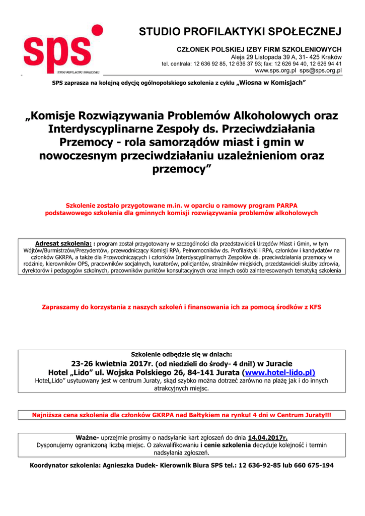STUDIO PROFILAKTYKI SPOŁECZNEJ CZŁONEK POLSKIEJ IZBY FIRM SZKOLENIOWYCH Aleja 29 Listopada 39 A, 31- 425 Kraków tel. centrala: 12 636 92 85, 12 636 37 93; fax: 12 626 94 40, 12 626 94 41 www.sps.org.pl [email protected] SPS zaprasza na kolejną edycję ogólnopolskiego szkolenia z cyklu „Wiosna w Komisjach” „Komisje Rozwiązywania Problemów Alkoholowych oraz Interdyscyplinarne Zespoły ds. Przeciwdziałania Przemocy - rola samorządów miast i gmin w nowoczesnym przeciwdziałaniu uzależnieniom oraz przemocy” Szkolenie zostało przygotowane m.in. w oparciu o ramowy program PARPA podstawowego szkolenia dla gminnych komisji rozwiązywania problemów alkoholowych Adresat szkolenia: : program został przygotowany w szczególności dla przedstawicieli Urzędów Miast i Gmin, w tym Wójtów/Burmistrzów/Prezydentów, przewodniczący Komisji RPA, Pełnomocników ds. Profilaktyki i RPA, członków i kandydatów na członków GKRPA, a także dla Przewodniczących i członków Interdyscyplinarnych Zespołów ds. przeciwdziałania przemocy w rodzinie, kierowników OPS, pracowników socjalnych, kuratorów, policjantów, strażników miejskich, przedstawicieli służby zdrowia, dyrektorów i pedagogów szkolnych, pracowników punktów konsultacyjnych oraz innych osób zainteresowanych tematyką szkolenia Zapraszamy do korzystania z naszych szkoleń i finansowania ich za pomocą środków z KFS Szkolenie odbędzie się w dniach: 23-26 kwietnia 2017r. (od niedzieli do środy- 4 dni!) w Juracie Hotel „Lido” ul. Wojska Polskiego 26, 84-141 Jurata (www.hotel-lido.pl) Hotel„Lido” usytuowany jest w centrum Juraty, skąd szybko można dotrzeć zarówno na plażę jak i do innych atrakcyjnych miejsc. Najniższa cena szkolenia dla członków GKRPA nad Bałtykiem na rynku! 4 dni w Centrum Juraty!!! Ważne- uprzejmie prosimy o nadsyłanie kart zgłoszeń do dnia 14.04.2017r. Dysponujemy ograniczoną liczbą miejsc. O zakwalifikowaniu i cenie szkolenia decyduje kolejność i termin nadsyłania zgłoszeń. Koordynator szkolenia: Agnieszka Dudek- Kierownik Biura SPS tel.: 12 636-92-85 lub 660 675-194 STUDIO PROFILAKTYKI SPOŁECZNEJ CZŁONEK POLSKIEJ IZBY FIRM SZKOLENIOWYCH Aleja 29 Listopada 39 A, 31- 425 Kraków tel. centrala: 12 636 92 85, 12 636 37 93; fax: 12 626 94 40, 12 626 94 41 www.sps.org.pl [email protected] PROGRAM SZKOLENIA: „Komisje Rozwiązywania Problemów Alkoholowych oraz Interdyscyplinarne Zespoły ds. Przeciwdziałania Przemocy - rola samorządów miast i gmin w nowoczesnym przeciwdziałaniu uzależnieniom oraz przemocy” 23-26.04.2017r.- Hotel „Lido” w Juracie 23.04.2017r. (niedziela) Przyjazd i zakwaterowanie uczestników szkolenia od godz. 15.00 w Hotelu „Lido” 24.04.2017r. (poniedziałek) Realizacja gminnych programów w roku 2017 w kontekście Ustawy o zdrowiu publicznym oraz Narodowego Programu Zdrowia - nowe zasady i kierunki 07.30-09.00 Śniadanie (13.00-14.00 Obiad) 09.00 Powitanie, omówienie harmonogramu szkolenia, rozpoczęcie szkolenia 09.00-15.30 Realizacja gminnych programów w roku 2017 w kontekście Ustawy o zdrowiu publicznym oraz Narodowego Programu Zdrowia - nowe zasady i kierunki 1. Nowelizacja ustawy o wychowaniu w trzeźwości i przeciwdziałaniu alkoholizmowi w zakresie realizacji gminnych programów profilaktyki i rozwiązywania problemów alkoholowych oraz przeciwdziałania narkomanii wynikająca z ustawy o zdrowiu publicznym. 2. Nowy tryb realizacji zadań z zakresu zdrowia publicznego wprowadzony ustawą o zdrowiu publicznym (konkurs ofert, przykłady ogłoszeń konkursowych) 3. Zadania gminy w zakresie rozwiązywania problemów alkoholowych wynikające z Narodowego Programu Zdrowia (rozporządzenie Rady Ministrów) – jak integrować gminne programy z Narodowym Programem Zdrowia - konkretne wskazówki i przykłady a) Promocja zdrowia Edukacja zdrowotna Szkolenie kadr Zadania regulacyjne i zapewnienie skutecznego egzekwowania przepisów, w tym m.in. zmniejszenie dostępności fizycznej alkoholu b) Profilaktyka, w tym zapisy NPZ dotyczące realizacji programów rekomendowanych Profilaktyka uniwersalna, Profilaktyka selektywna Profilaktyka wskazująca. c) Redukcja szkód, rehabilitacja (readaptacja, reintegracja) zdrowotna, społeczna i zawodowa 4. Obowiązek sprawozdawczości gmin z realizacji celów operacyjnych NPZ 5. Profilaktyka uniwersalna, selektywna i wskazująca opisana w Narodowym Programie Zdrowia jako zadanie dla gminy – przykłady konkretnych programów oraz omówienie bazy programów rekomendowanych. Miejsce sportu w profilaktyce. Socjoterapia jako przykład profilaktyki wskazującej. 6. Procedura zobowiązania do leczenia odwykowego - schemat postepowania, gromadzenie i ochrona danych osobowych oraz trwające prace nowelizacyjny w tym zakresie w kontekście postulatów zgłaszanych przez NIK 15:30-19:30 Czas wolny. Dla zainteresowanych- wycieczka piesza z przewodnikiem po Juracie od 19.30 Kolacja regionalna z udziałem kapeli kaszubskiej, połączona z dyskoteką STUDIO PROFILAKTYKI SPOŁECZNEJ CZŁONEK POLSKIEJ IZBY FIRM SZKOLENIOWYCH Aleja 29 Listopada 39 A, 31- 425 Kraków tel. centrala: 12 636 92 85, 12 636 37 93; fax: 12 626 94 40, 12 626 94 41 www.sps.org.pl [email protected] 25.04.2017r. (wtorek) Leczenie zaburzeń wynikających z używania alkoholu w rzeczywistości 2017: nowe wyzwania, nowe potrzeby. Nowe uregulowania dotyczące systemu przeciwdziałania przemocy w rodzinie w oparciu o znowelizowaną ustawę o wychowaniu w trzeźwości… 07.30-09.00 Śniadanie (13.00-14.00 Obiad) 09.00-15.30 (zajęcia do wyboru) Leczenie zaburzeń wynikających z używania alkoholu w rzeczywistości 2017: nowe wyzwania, nowe potrzeby" 1. Organizacja systemu leczenia odwykowego w planowanej reformie służby zdrowia. 2. Leczenie uzależnienia od alkoholu w koncepcji Narodowego Programu Zdrowia Publicznego i Narodowego Programu Ochrony Zdrowia Psychicznego. 3. Prace sejmowego zespołu ds zapobiegania problemom uzależnień. 4. Ogr