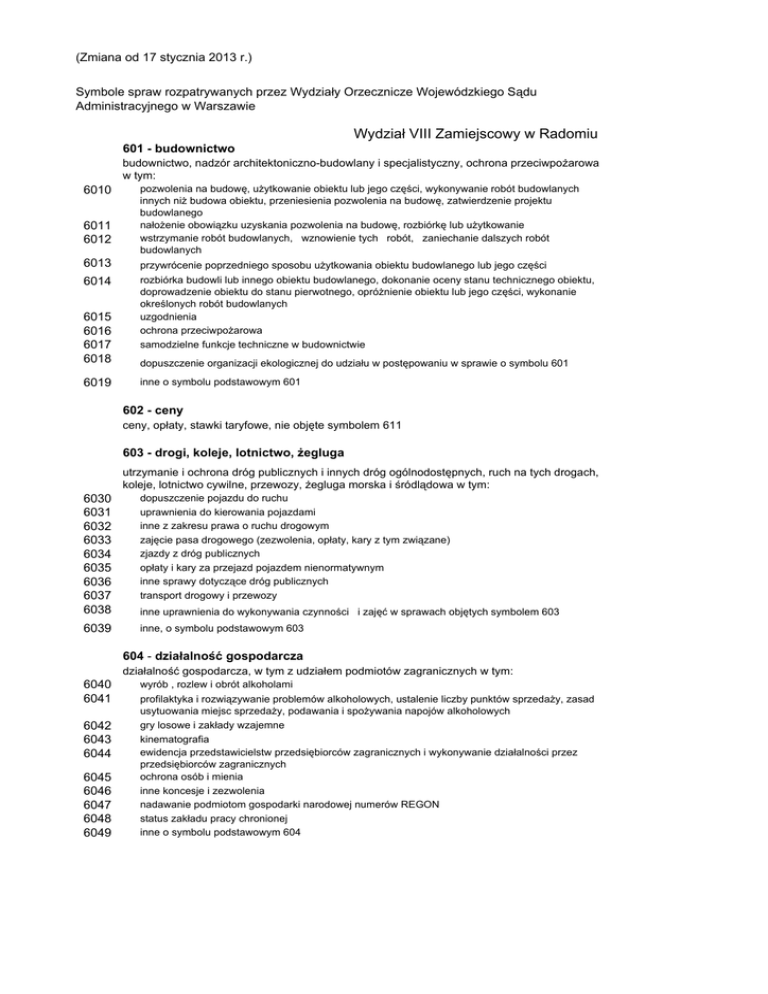 (Zmiana od 17 stycznia 2013 r.) Symbole spraw rozpatrywanych przez Wydziały Orzecznicze Wojewódzkiego Sądu Administracyjnego w Warszawie Wydział VIII Zamiejscowy w Radomiu 601 - budownictwo budownictwo, nadzór architektoniczno-budowlany i specjalistyczny, ochrona przeciwpożarowa w tym: 6010 6011 6012 pozwolenia na budowę, użytkowanie obiektu lub jego części, wykonywanie robót budowlanych innych niż budowa obiektu, przeniesienia pozwolenia na budowę, zatwierdzenie projektu budowlanego nałożenie obowiązku uzyskania pozwolenia na budowę, rozbiórkę lub użytkowanie wstrzymanie robót budowlanych, wznowienie tych robót, zaniechanie dalszych robót budowlanych 6013 przywrócenie poprzedniego sposobu użytkowania obiektu budowlanego lub jego części 6014 rozbiórka budowli lub innego obiektu budowlanego, dokonanie oceny stanu technicznego obiektu, doprowadzenie obiektu do stanu pierwotnego, opróżnienie obiektu lub jego części, wykonanie określonych robót budowlanych uzgodnienia ochrona przeciwpożarowa samodzielne funkcje techniczne w budownictwie 6015 6016 6017 6018 6019 dopuszczenie organizacji ekologicznej do udziału w postępowaniu w sprawie o symbolu 601 inne o symbolu podstawowym 601 602 - ceny ceny, opłaty, stawki taryfowe, nie objęte symbolem 611 603 - drogi, koleje, lotnictwo, żegluga utrzymanie i ochrona dróg publicznych i innych dróg ogólnodostępnych, ruch na tych drogach, koleje, lotnictwo cywilne, przewozy, żegluga morska i śródlądowa w tym: 6030 6031 6032 6033 6034 6035 6036 6037 6038 dopuszczenie pojazdu do ruchu uprawnienia do kierowania pojazdami inne z zakresu prawa o ruchu drogowym zajęcie pasa drogowego (zezwolenia, opłaty, kary z tym związane) zjazdy z dróg publicznych opłaty i kary za przejazd pojazdem nienormatywnym inne sprawy dotyczące dróg publicznych transport drogowy i przewozy 6039 inne, o symbolu podstawowym 603 inne uprawnienia do wykonywania czynności i zajęć w sprawach objętych symbolem 603 604 - działalność gospodarcza działalność gospodarcza, w tym z udziałem podmiotów zagranicznych w tym: 6040 6041 wyrób , rozlew i obrót alkoholami 6042 6043 6044 gry losowe i zakłady wzajemne kinematografia ewidencja przedstawicielstw przedsiębiorców zagranicznych i wykonywanie działalności przez przedsiębiorców zagranicznych ochrona osób i mienia inne koncesje i zezwolenia nadawanie podmiotom gospodarki narodowej numerów REGON status zakładu pracy chronionej inne o symbolu podstawowym 604 6045 6046 6047 6048 6049 profilaktyka i rozwiązywanie problemów alkoholowych, ustalenie liczby punktów sprzedaży, zasad usytuowania miejsc sprzedaży, podawania i spożywania napojów alkoholowych 605 - ludność ewidencja ludności, dowody tożsamości, akty stanu cywilnego, imiona i nazwiska, obywatelstwo, paszporty w tym: 6050 6051 6052 6053 6054 6059 obowiązek meldunkowy dokumenty stwierdzające tożsamość akty stanu cywilnego obywatelstwo paszporty inne o symbolu podstawowym 605 606 - geologia i górnictwo sprawy z zakresy geologii i górnictwa w tym: 6060 6061 6062 6063 6064 6069 poszukiwanie, rozpoznawanie i wydobywanie kopalin projektowanie i wykonywanie prac geologicznych oraz zagospodarowywanie złoża ruch i likwidacja zakładu górniczego opłaty eksploatacyjne stwierdzenie kwalifikacji do wykonywania dozorowania i kierowania pracami geologicznymi lub górniczymi inne o symbolu podstawowym 606 607 - gospodarka mieniem gospodarka mieniem państwowym i komunalnym, w tym gospodarka nieruchomościami nierolnymi w tym: 6070 6071 6072 6073 uwłaszczenie państwowych osób prawnych oraz komunalnych osób prawnych trwały zarząd nieruchomościami scalenie oraz podział nieruchomości 6074 6075 6076 6079 przekształcenie użytkowania wieczystego w prawo własności działalność zawodowa w dziedzinie gospodarowania nieruchomościami sprawy objęte dekretem o gruntach warszawskich inne o symbolu podstawowym 607 opłaty adiacenckie oraz opłaty za niezagospodarowanie nieruchomości w zakreślonym terminie 608 - energetyka energetyka i atomistyka 609 - gospodarka wodna gospodarka wodna w tym ochrona wód, budownictwo wodne, melioracje, zaopatrzenie w wodę w tym: 6090 6091 pozwolenie wodnoprawne i budownictwo wodne 6092 6093 6099 melioracje wodne, opłaty melioracyjne spółki wodne i związki wałowe inne o symbolu podstawowym 609 przywrócenie stosunków wodnych na gruncie lub wykonanie urządzeń zapobiegających szkodom 610 - komunalizacja mienia sprawy komunalizacji mienia w tym: 6100 6101 6102 6103 6109 nabycie mienia państwowego z mocy prawa przez gminę przekazanie gminie z urzędu lub na wniosek mienia państwowego związanego z realizacją zadań gminy nabycie mienia Skarbu Państwa z mocy prawa z dniem 1 stycznia 1999r. przez jednostki samorządu terytorialnego przekazanie powiatom mienia Skarbu Państwa inne o symbolu podstawowym 610 611 - zobowiązania podatkowe podatki i inne świadczenia pieniężne, do których mają zastosowanie przepisy Ordynacji podatkowej, oraz egzekucja tych świadczeń pieniężnych w tym: 6110 6111 6112 6113 6114 6115 6116 6117 6118 6119 podatek od towarów i usług podatek akcyzowy podatek dochody od osób fizycznych, w tym zryczałtowane formy opodatkowania podatek dochodowy od osób prawnych podatek od spadków i darowizn podatki od nieruchomości podatek od czynności cywilnoprawnych, opłata skarbowa oraz inne podatki i opłaty ulgi płatnicze (umorzenia, odroczenia, rozłożenie na raty itp.) egzekucja świadczeń pieniężnych inne o symbolu podstawowym 611 612 - geodezja i kartografia sprawy geodezji i kartografii w tym: 6120 6121 6122 6123 6124 ewidencja gruntów i budynków klasyfikacja gruntów rozgraniczenia nieruchomości zasób geodezyjny i kartograficzny uprawnienia zawodowe w dziedzinie geodezji i kartografii 613 - środowisko ochrona środowiska i ochrona przyrody w tym: 6130 6131 6132 6133 6134 6135 6136 6137 6138 6139 pozwolenie na wprowadzenie do środo