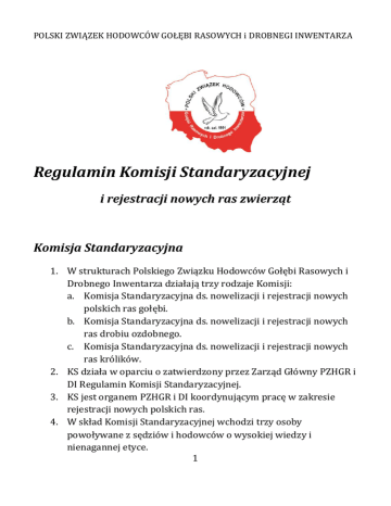 POLSKI ZWIĄZEK HODOWCÓW GOŁĘBI RASOWYCH i DROBNEGI INWENTARZA Regulamin Komisji Standaryzacyjnej i rejestracji nowych ras zwierząt Komisja Standaryzacyjna 1. W strukturach Polskiego Związku Hodowców Gołębi Rasowych i Drobnego Inwentarza działają trzy rodzaje Komisji: a. Komisja Standaryzacyjna ds. nowelizacji i rejestracji nowych polskich ras gołębi. b. Komisja Standaryzacyjna ds. nowelizacji i rejestracji nowych ras drobiu ozdobnego. c. Komisja Standaryzacyjna ds. nowelizacji i rejestracji nowych ras królików. 2. KS działa w oparciu o zatwierdzony przez Zarząd Główny PZHGR i DI Regulamin Komisji Standaryzacyjnej. 3. KS jest organem PZHGR i DI koordynującym pracę w zakresie rejestracji nowych polskich ras. 4. W skład Komisji Standaryzacyjnej wchodzi trzy osoby powoływane z sędziów i hodowców o wysokiej wiedzy i nienagannej etyce. 1 5. KS jest powoływana i odwoływana przez Zarząd Główny PZHGR i DI na wniosek Prezydium Kolegium Sędziów. 6. KS podczas procesu rejestrowego decyzję podejmuje zwykłą większością głosów. 7. KS może prosić o opinię wybitnych hodowców lub ekspertów. 8. KS odpowiada za rejestrację ras polskich w Federacji Europejskiej. 9. Posiedzenia KS są jawne i odbywają się minimum ras w roku (wystawa krajowa), o ile nie zostanie postanowione i uzasadnione inaczej. 10. KS prowadzi rejestr nowo rejestrowanych ras i odmian barwnych. 11. Każda merytoryczna publikacja KS powinna być przed opublikowaniem zaopiniowana przez Prezydium Kolegium Sędziów i zatwierdzona przez Zarząd Główny PZHGR i DI. 12. KS po sezonie wystawowy do 30 kwietnia każdego roku składa sprawozdanie ze swojej rocznej działalności do Zarządu Głównego PZHGR i DI i Prezydium Kolegium Sędziów. Procedura rejestracyjna I Rejestracja nowych ras 1. Zgłoszenia nowych polskich ras zwierząt lub nowych odmian barwnych u ras już zarejestrowanych mogą dokonywać hodowcy zrzeszeni w PZHGR i DI za pośrednictwem macierzystego Stowarzyszenia, Związku lub Klubu. 2. Wnioskodawca chcący zarejestrować nową rasę zobowiązany jest dostarczyć do Komisji Standaryzacyjnej na 60dni przed planowanymi Krajowymi Wystawami następujące dokumenty: a. Wniosek o zarejestrowanie nowej rasy. b. Dokładny opis, opracowanie dotyczące historii rejestrowanej rasy, materiały archiwalne z podaniem źródła pochodzenia, ryciny, reprodukcję obrazów oraz inne dokumenty na temat danej rasy. 2 3. 4. 5. 6. 7. c. Wykaz hodowców z ilością stada podstawowego, obecnego stanu pogłowia, odmian barwnych i regionów hodowli. d. Projekt wzorca rasowego przygotowany zgodnie z zasadami obowiązującymi w Federacji Europejskiej. e. Dokumentację fotograficzną oraz w miarę możliwości rysunek. f. Dokumentację hodowlaną w oparciu o księgi hodowlane. Komisja Standaryzacyjna powiadamia Prezydium Kolegium Sędziów i Komisję Hodowlaną celem sprawdzenia czy dana rasa nie posiada wzorca ( również w innych krajach), oraz wydania opinii o rozpoczęciu rejestracji nowej rasy lub odmiany barwnej. Hodowca chcący zarejestrować nową rasę musi w uzgodnieniu z Komisją Standaryzacyjną wystawiać swoje zwierzęta (jako pokaz) przez okres co najmniej trzy lata na wystawach krajowych. Wszystkie te prezentację powinny znaleźć swoje odzwierciedlenie w oficjalnym katalogu wstawowym z adnotacją „pokaz nowej rasy”, „pokaz odmiany barwnej”. Prezentowane zwierzęta powinny posiadać obrączki i tatuaże rozprowadzane przez Zarząd Główny PZHGR i DI. Komisja Standaryzacyjna powiadamia Prezydium Kolegium Sędziów i Organizatora Wystaw Krajowych o prezentowanych rasach. Prezydium Kolegium Sędziów powołuje Komisję do przeprowadzenia oceny i sporządzenia protokołu wraz z wnioskami z każdego roku wystawowego, który dołączany jest do akt. a. Skład Komisji weryfikacyjnej: - przewodniczący (przedstawiciel Komisji Standaryzacyjnej) - sędzia ekspert - sędzia krajowy 3 II Plan pokazów nowej rasy gołębi 1. W pierwszym roku wystawowym wnioskodawca zobowiązany jest zaprezentować co najmniej 6 egzemplarzy rejestrowanej rasy. Komisja weryfikacyjna sprawdza czy prezentowane gołębie posiadają przynajmniej trzy cechy odróżniające je od innych ras. Po otrzymaniu pozytywnej opinii hodowca przesyła do Komisji Standaryzacyjnej zestawienie par lęgowych wystawianych ptaków wraz z numerami obrączek jakimi obrączkowane będą młode od poszczególnych par. 2. W drugim roku wystawowym wnioskodawca zobowiązany jest zaprezentować co najmniej 6 sztuk, parę starych wystawianych rok wcześniej wraz z młodymi ( o numerach obrączek podanych przez hodowcę przed sezonem lęgowym).Komisja weryfikacyjna sprawdza powtarzalność cech rasowych. 3. W trzecim roku wystawowym wnioskodawca zobowiązany jest zaprezentować co najmniej 12 sztuk, dwie pary starych wystawianych w ciągu ostatnich dwóch lat wraz z młodymi. Wskazane jest zaprezentowanie różnych kolorów. Komisja weryfikacyjna sprawdza powtarzalność cech rasowych przez kolejne trzy lata. III Plan pokazu nowej rasy drobiu. 1. W pierwszym roku wystawowym wnioskodawca powinien zaprezentować co najmniej 4 sztuki ( dwie kury i dwa koguty). Komisja weryfikacyjna sprawdza czy prezentowany drób posiada przynajmniej trzy cechy odróżniające je od innych ras. Po otrzymaniu pozytywnej opinii hodowca przesyła do Komisji Standaryzacyjnej zestawienie par lęgowych wraz z wykazem obrączek jakimi obrączkowane będą młode. 4 2. W drugim roku wystawowym wnioskodawca zobowiązany jest zaprezentować co najmniej 6 sztuk, parę starych wystawianych rok wcześniej wraz z młodymi ( o numerach obrączek podanych przez hodowcę przed sezonem lęgowym).Komisja weryfikacyjna sprawdza powtarzalność cech rasowych. 3. W trzecim roku wystawowym wnioskodawca zobowiązany jest zaprezentować co najmniej 10 sztuk, dwie pary starych wystawianych w ciągu ostatnich dwóch lat wraz z młodymi. Wskazane jest zaprezentowanie różnych odmian barwnych. Ko