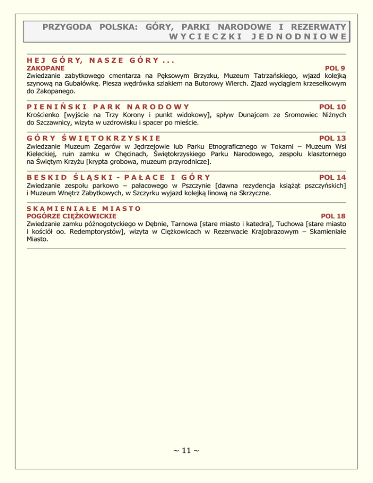 PRZYGODA POLSKA: GÓRY, PARKI NARODOWE I REZERWATY WYCIECZKI JEDNODNIOWE H E J G Ó R Y, N A S Z E G Ó R Y . . . ZAKOPANE POL 9 Zwiedzanie zabytkowego cmentarza na Pęksowym Brzyzku, Muzeum Tatrzańskiego, wjazd kolejką szynową na Gubałówkę. Piesza wędrówka szlakiem na Butorowy Wierch. Zjazd wyciągiem krzesełkowym do Zakopanego. PIENIŃSKI PARK NARODOWY POL 10 Krościenko [wyjście na Trzy Korony i punkt widokowy], spływ Dunajcem ze Sromowiec Niżnych do Szczawnicy, wizyta w uzdrowisku i spacer po mieście. GÓRY ŚWIĘTOKRZYSKIE POL 13 Zwiedzanie Muzeum Zegarów w Jędrzejowie lub Parku Etnograficznego w Tokarni – Muzeum Wsi Kieleckiej, ruin zamku w Chęcinach, Świętokrzyskiego Parku Narodowego, zespołu klasztornego na Świętym Krzyżu [krypta grobowa, muzeum przyrodnicze]. BESKID ŚLĄSKI - PAŁACE I GÓRY POL 14 Zwiedzanie zespołu parkowo – pałacowego w Pszczynie [dawna rezydencja książąt pszczyńskich] i Muzeum Wnętrz Zabytkowych, w Szczyrku wyjazd kolejką linową na Skrzyczne. SKAMIENIAŁE MIASTO POGÓRZE CIĘŻKOWICKIE POL 18 Zwiedzanie zamku późnogotyckiego w Dębnie, Tarnowa [stare miasto i katedra], Tuchowa [stare miasto i kościół oo. Redemptorystów], wizyta w Ciężkowicach w Rezerwacie Krajobrazowym – Skamieniałe Miasto. ~ 11 ~