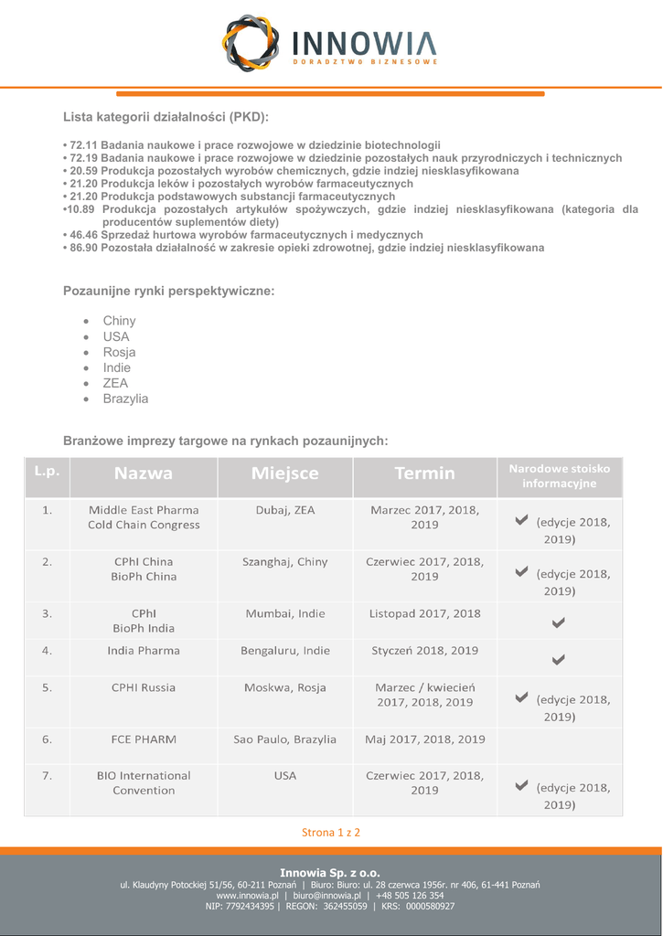 Lista kategorii działalności (PKD): • 72.11 Badania naukowe i prace rozwojowe w dziedzinie biotechnologii • 72.19 Badania naukowe i prace rozwojowe w dziedzinie pozostałych nauk przyrodniczych i technicznych • 20.59 Produkcja pozostałych wyrobów chemicznych, gdzie indziej niesklasyfikowana • 21.20 Produkcja leków i pozostałych wyrobów farmaceutycznych • 21.20 Produkcja podstawowych substancji farmaceutycznych •10.89 Produkcja pozostałych artykułów spożywczych, gdzie indziej niesklasyfikowana (kategoria dla producentów suplementów diety) • 46.46 Sprzedaż hurtowa wyrobów farmaceutycznych i medycznych • 86.90 Pozostała działalność w zakresie opieki zdrowotnej, gdzie indziej niesklasyfikowana Pozaunijne rynki perspektywiczne: Chiny USA Rosja Indie ZEA Brazylia Branżowe imprezy targowe na rynkach pozaunijnych: Strona 1 z 2 Innowia Sp. z o.o. ul. Klaudyny Potockiej 51/56, 60-211 Poznań | Biuro: Biuro: ul. 28 czerwca 1956r. nr 406, 61-441 Poznań www.innowia.pl | [email protected] | +48 505 126 354 NIP: 7792434395 | REGON: 362455059 | KRS: 0000580927 Branżowe imprezy targowe o znaczeniu międzynarodowym na terenie UE: Strona 2 z 2 Innowia Sp. z o.o. ul. Klaudyny Potockiej 51/56, 60-211 Poznań | Biuro: Biuro: ul. 28 czerwca 1956r. nr 406, 61-441 Poznań www.innowia.pl | [email protected] | +48 505 126 354 NIP: 7792434395 | REGON: 362455059 | KRS: 0000580927