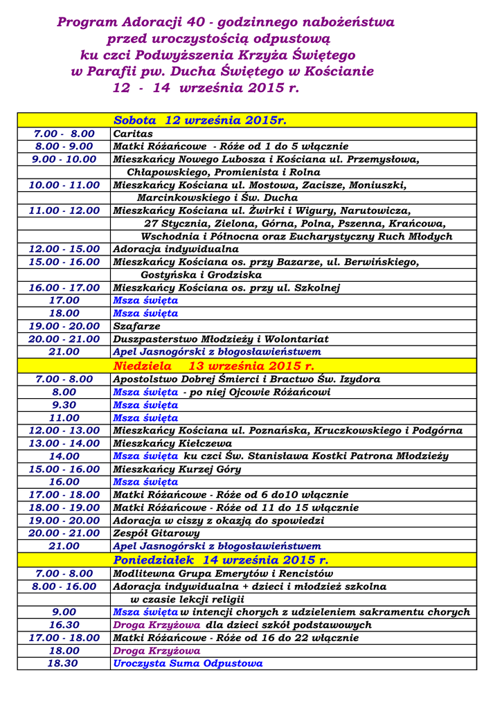 Program Adoracji 40 - godzinnego nabożeństwa przed uroczystością odpustową ku czci Podwyższenia Krzyża Świętego w Parafii pw. Ducha Świętego w Kościanie 12 - 14 września 2015 r. Sobota 12 września 2015r. 7.00 - 8.00 8.00 - 9.00 9.00 - 10.00 10.00 - 11.00 11.00 - 12.00 12.00 - 15.00 15.00 - 16.00 16.00 - 17.00 17.00 18.00 19.00 - 20.00 20.00 - 21.00 21.00 Caritas Matki Różańcowe - Róże od 1 do 5 włącznie Mieszkańcy Nowego Lubosza i Kościana ul. Przemysłowa, Chłapowskiego, Promienista i Rolna Mieszkańcy Kościana ul. Mostowa, Zacisze, Moniuszki, Marcinkowskiego i Św. Ducha Mieszkańcy Kościana ul. Żwirki i Wigury, Narutowicza, 27 Stycznia, Zielona, Górna, Polna, Pszenna, Krańcowa, Wschodnia i Północna oraz Eucharystyczny Ruch Młodych Adoracja indywidualna Mieszkańcy Kościana os. przy Bazarze, ul. Berwińskiego, Gostyńska i Grodziska Mieszkańcy Kościana os. przy ul. Szkolnej Msza święta Msza święta Szafarze Duszpasterstwo Młodzieży i Wolontariat Apel Jasnogórski z błogosławieństwem Niedziela 7.00 - 8.00 8.00 9.30 11.00 12.00 - 13.00 13.00 - 14.00 14.00 15.00 - 16.00 16.00 17.00 - 18.00 18.00 - 19.00 19.00 - 20.00 20.00 - 21.00 21.00 13 września 2015 r. Apostolstwo Dobrej Śmierci i Bractwo Św. Izydora Msza święta - po niej Ojcowie Różańcowi Msza święta Msza święta Mieszkańcy Kościana ul. Poznańska, Kruczkowskiego i Podgórna Mieszkańcy Kiełczewa Msza święta ku czci Św. Stanisława Kostki Patrona Młodzieży Mieszkańcy Kurzej Góry Msza święta Matki Różańcowe - Róże od 6 do10 włącznie Matki Różańcowe - Róże od 11 do 15 włącznie Adoracja w ciszy z okazją do spowiedzi Zespół Gitarowy Apel Jasnogórski z błogosławieństwem Poniedziałek 14 września 2015 r. 7.00 - 8.00 8.00 - 16.00 9.00 16.30 17.00 - 18.00 18.00 18.30 Modlitewna Grupa Emerytów i Rencistów Adoracja indywidualna + dzieci i młodzież szkolna w czasie lekcji religii Msza święta w intencji chorych z udzieleniem sakramentu chorych Droga Krzyżowa dla dzieci szkół podstawowych Matki Różańcowe - Róże od 16 do 22 włącznie Droga Krzyżowa Uroczysta Suma Odpustowa